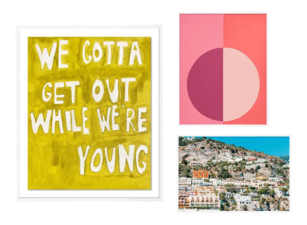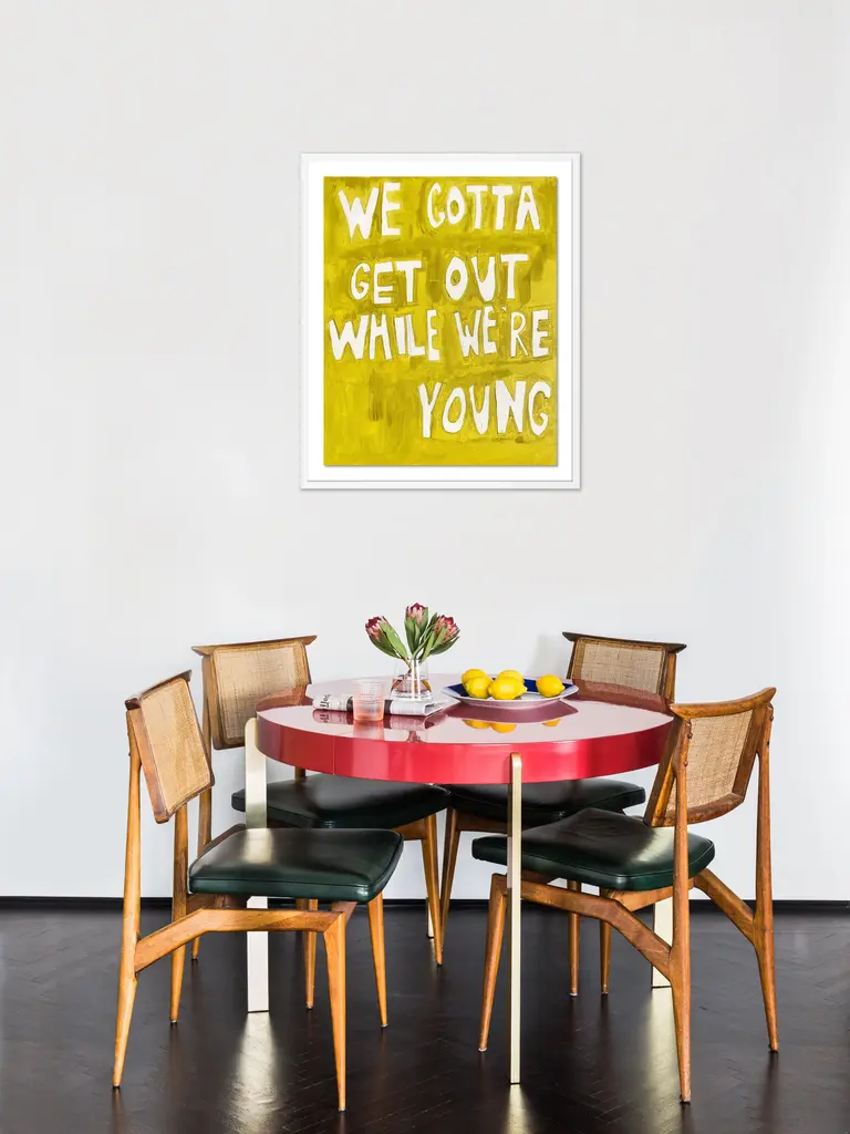DESCRIPTION: We Gotta Get Out While We're Young by Virginia Chamlee in White Frame, Medium Art Print SPECIFICATIONS: Type: Framed Paper. Framed Size (in): 30x36. Orientation: Vertical. Flush/Float/Matted: Floated. Frame Color: White. Hanging Hardware: Picture Perfect. FRAMING: Each art work arrives framed and ready to hang. We use handmade frames with a plexiglass glazing front, because it offers less glare than standard glass. At this time, we only offer framed prints. ARTIST BIO: Virginia Chamlee had spent more than a decade collecting and selling vintage and contemporary works of art before she began selling her own. The bulk of her artwork is inspired by the colors and shapes found throughout her home state of Florida, and the power and beauty of the female form. A journalist for more than a decade, much of Virginia's art is inspired by the written word. She has been published in The Washington Post, Business Insider, Buzzfeed, Ms. Magazine, and Eater, among others.