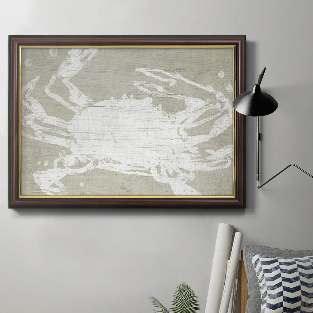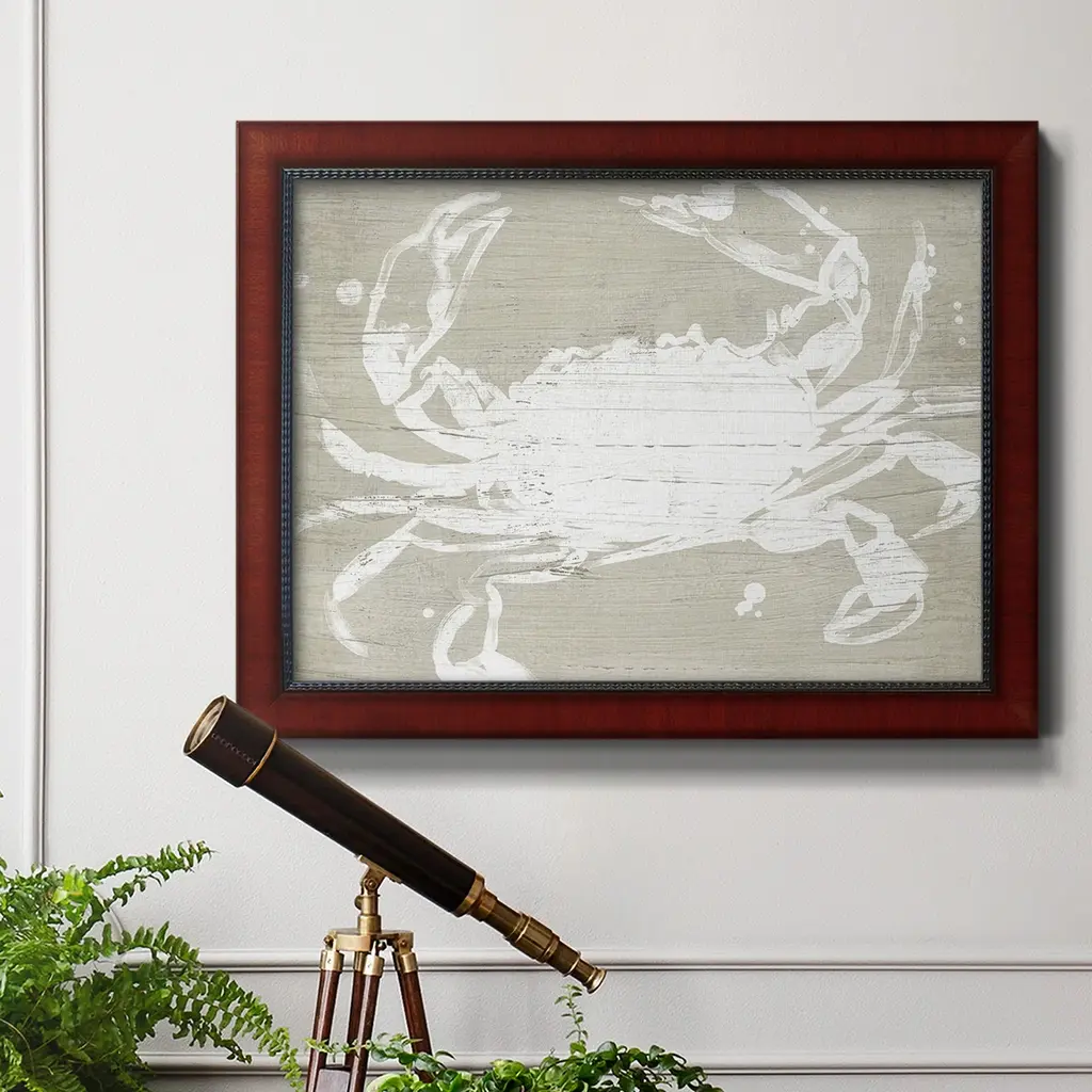 Weathered Crab I Premium Framed Canvas- Ready to Hang A Premium Framed Canvas created to last. Framed in distressed wood and available in an array of sizes and colors Featuring a beveled a solid wood stretcher bar, each piece comes ready to hand 3 SIZES AVAILABLE 16''X20'' - Overall Size 18'X27'' - Overall Size 24''x36'' - Overall Size Each piece is made to order. Each piece comes with hanging hardware. Made in the USA Ready to Hang Giclee Paper Print Acrylic Glass Beveled Matt Board
