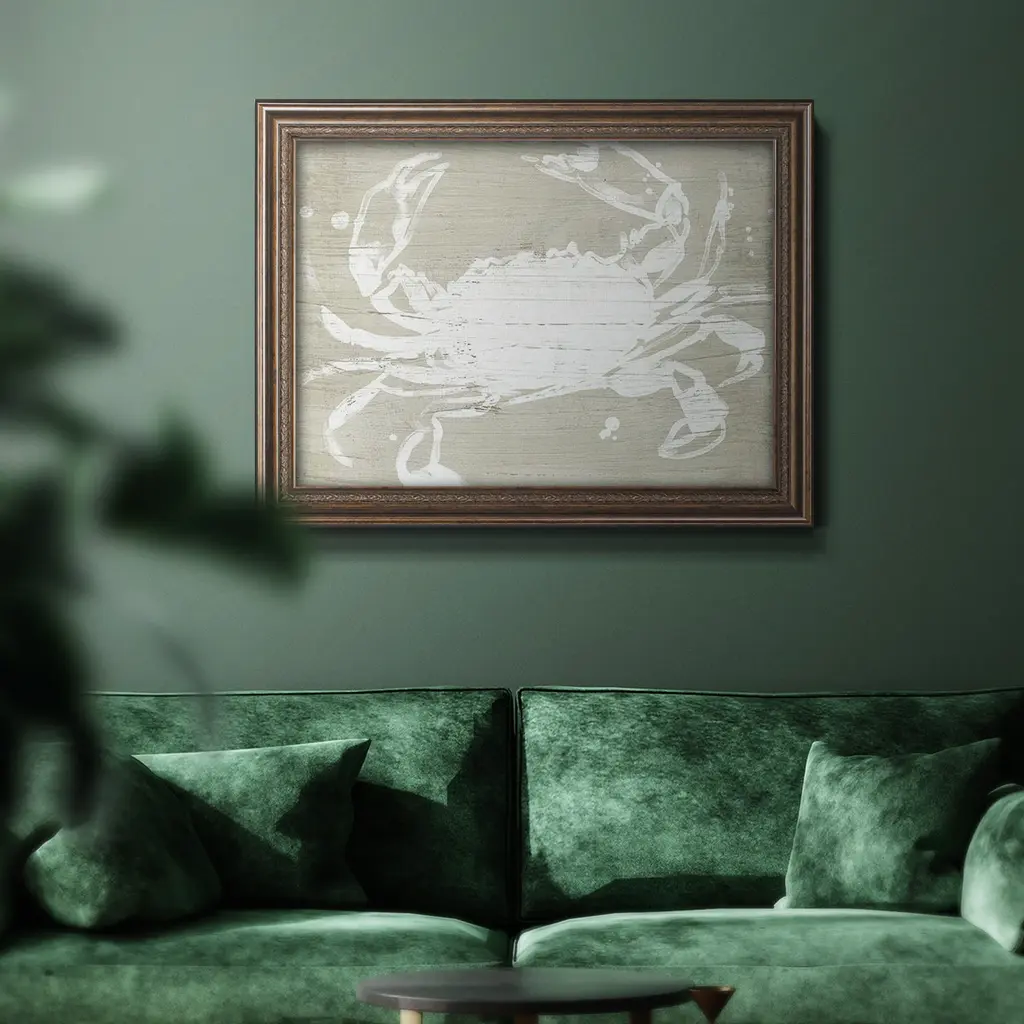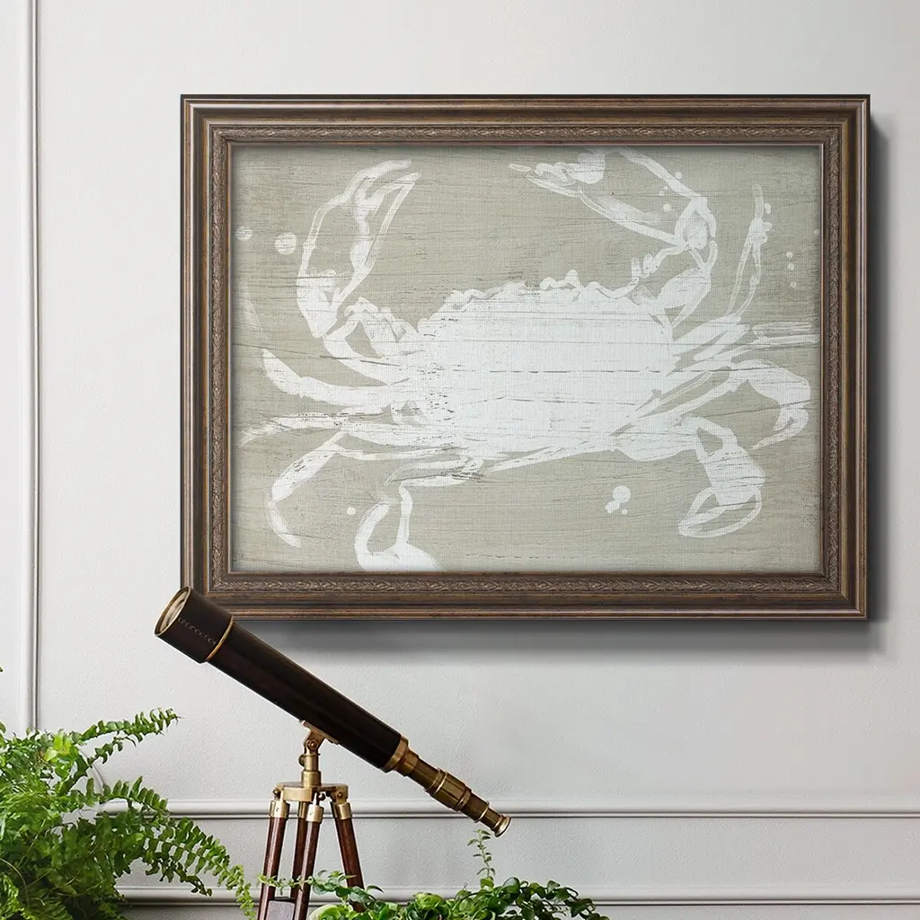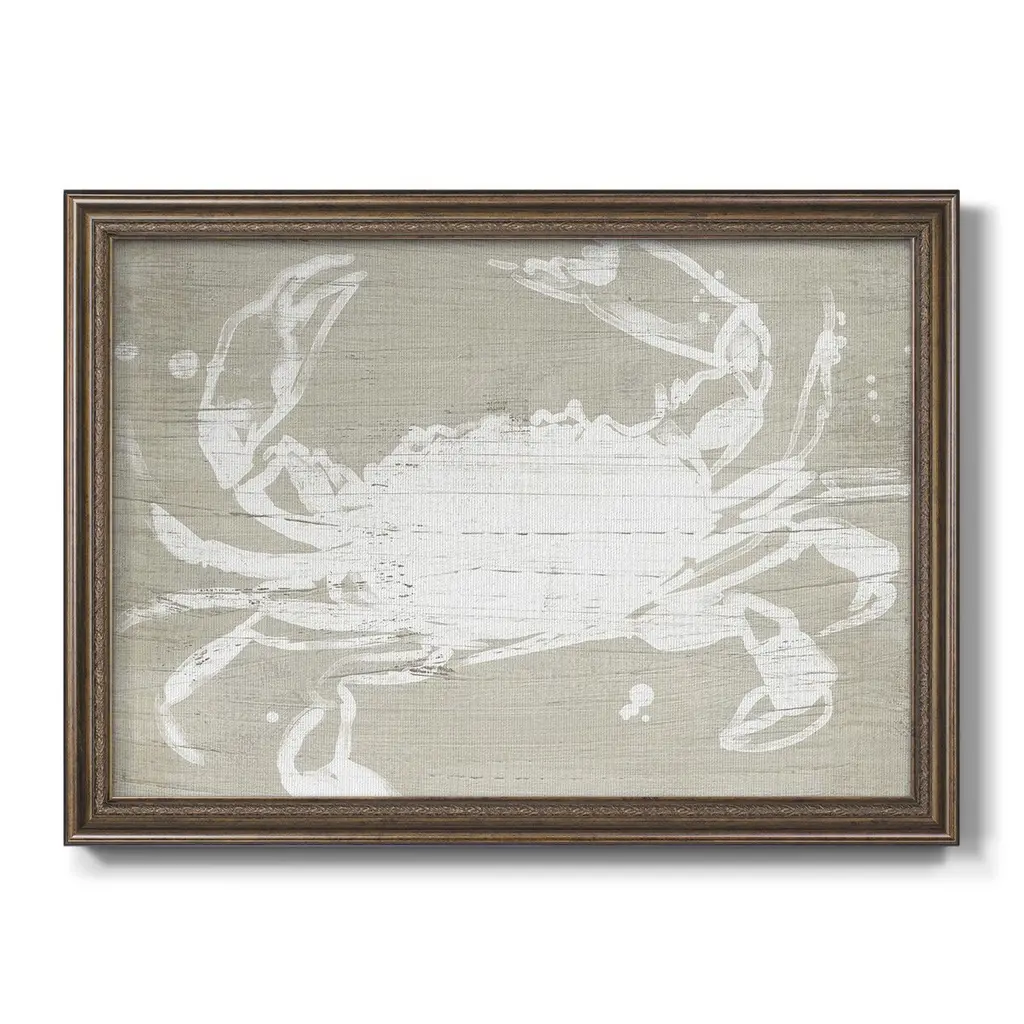 Weathered Crab I Premium Framed Canvas- Ready to Hang A Premium Framed Canvas created to last. Framed in distressed wood and available in an array of sizes and colors Featuring a beveled a solid wood stretcher bar, each piece comes ready to hand 3 SIZES AVAILABLE 16''X20'' - Overall Size 18'X27'' - Overall Size 24''x36'' - Overall Size Each piece is made to order. Each piece comes with hanging hardware. Made in the USA Ready to Hang Giclee Paper Print Acrylic Glass Beveled Matt Board