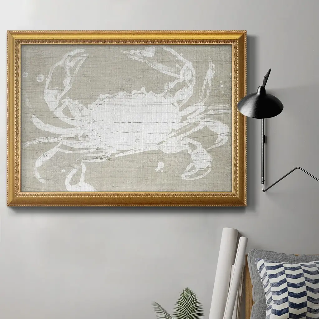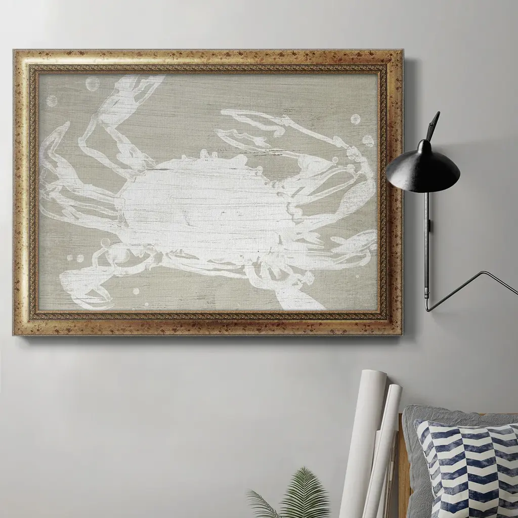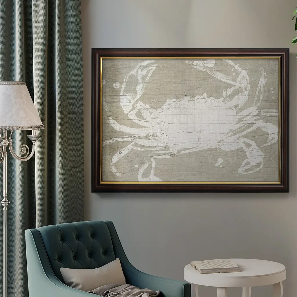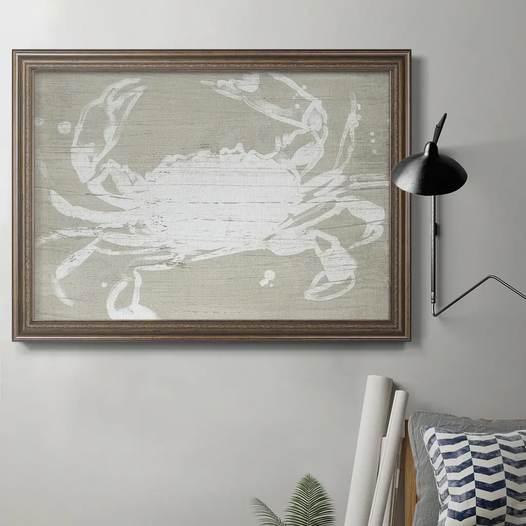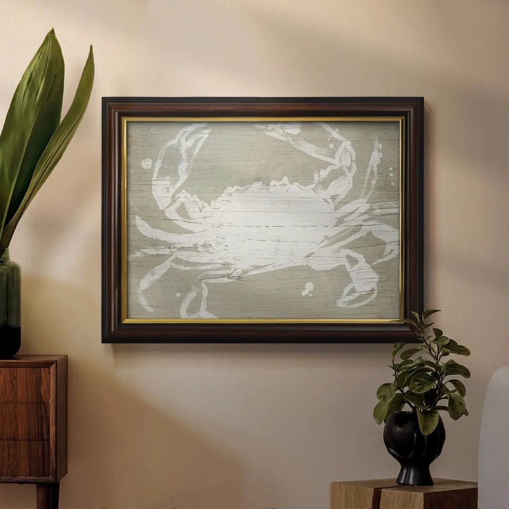 Weathered Crab I Premium Framed Canvas- Ready to Hang A Premium Framed Canvas created to last. Framed in distressed wood and available in an array of sizes and colors Featuring a beveled a solid wood stretcher bar, each piece comes ready to hand 3 SIZES AVAILABLE 16''X20'' - Overall Size 18'X27'' - Overall Size 24''x36'' - Overall Size Each piece is made to order. Each piece comes with hanging hardware. Made in the USA Ready to Hang Giclee Paper Print Acrylic Glass Beveled Matt Board