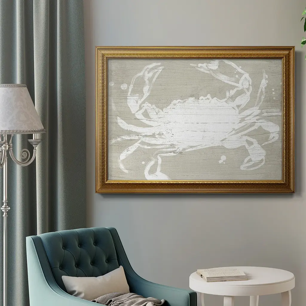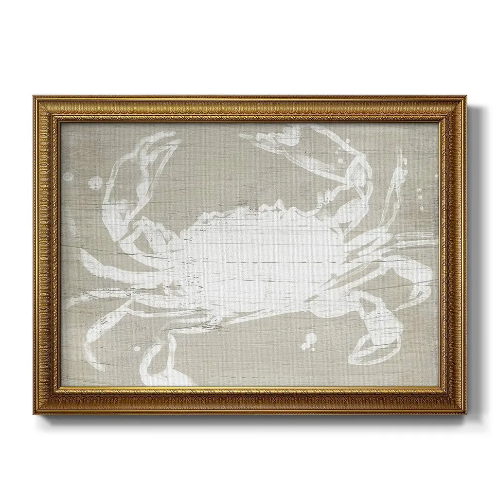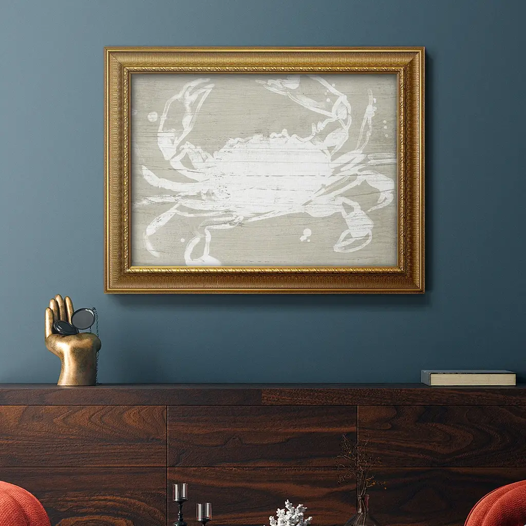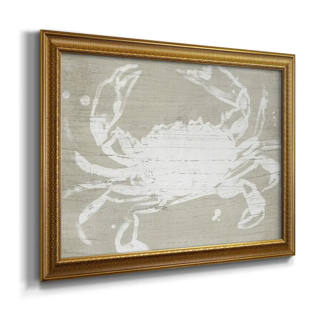 Weathered Crab I Premium Framed Canvas- Ready to Hang A Premium Framed Canvas created to last. Framed in distressed wood and available in an array of sizes and colors Featuring a beveled a solid wood stretcher bar, each piece comes ready to hand 3 SIZES AVAILABLE 16''X20'' - Overall Size 18'X27'' - Overall Size 24''x36'' - Overall Size Each piece is made to order. Each piece comes with hanging hardware. Made in the USA Ready to Hang Giclee Paper Print Acrylic Glass Beveled Matt Board