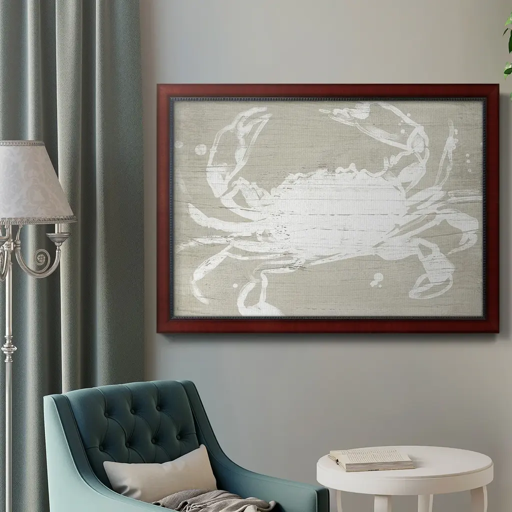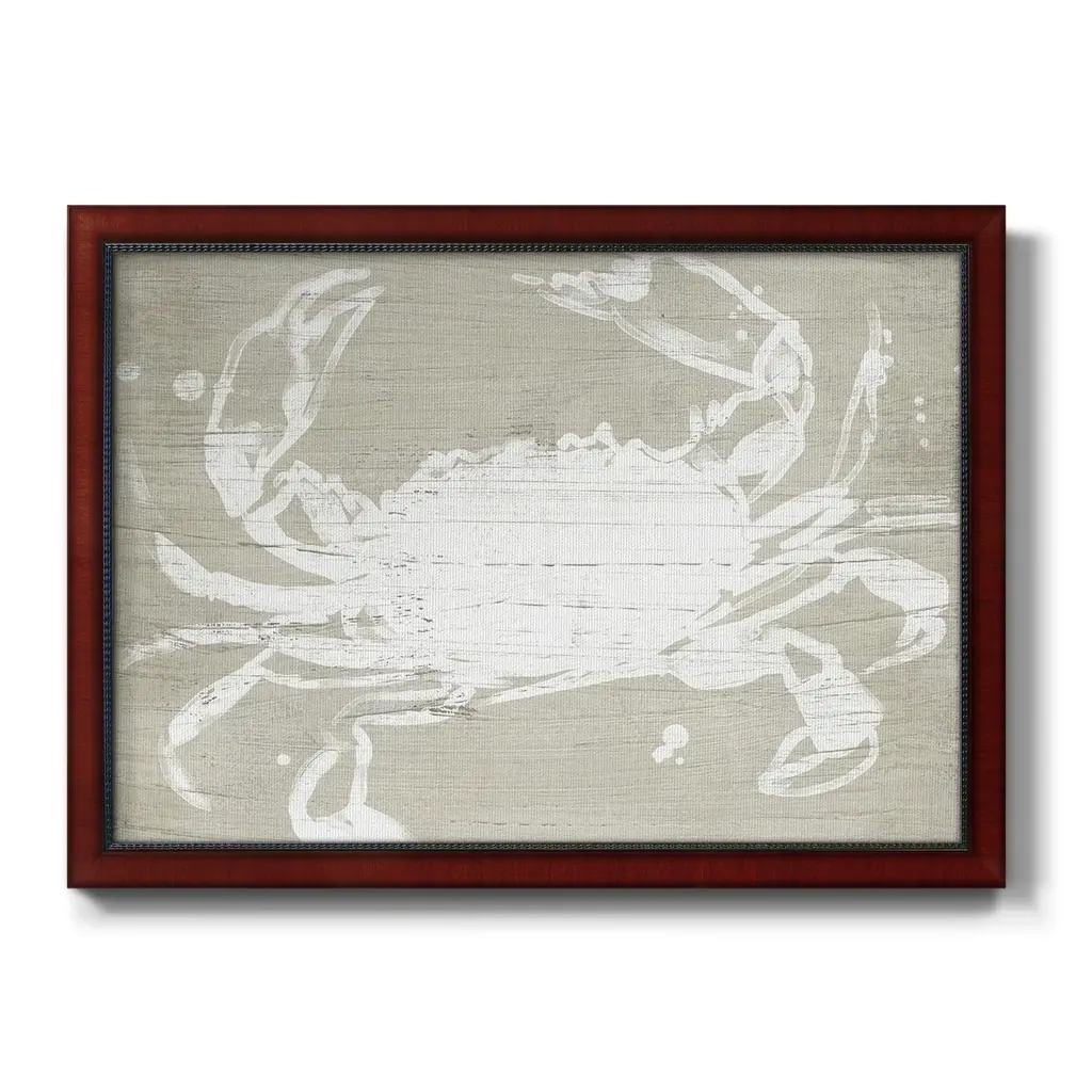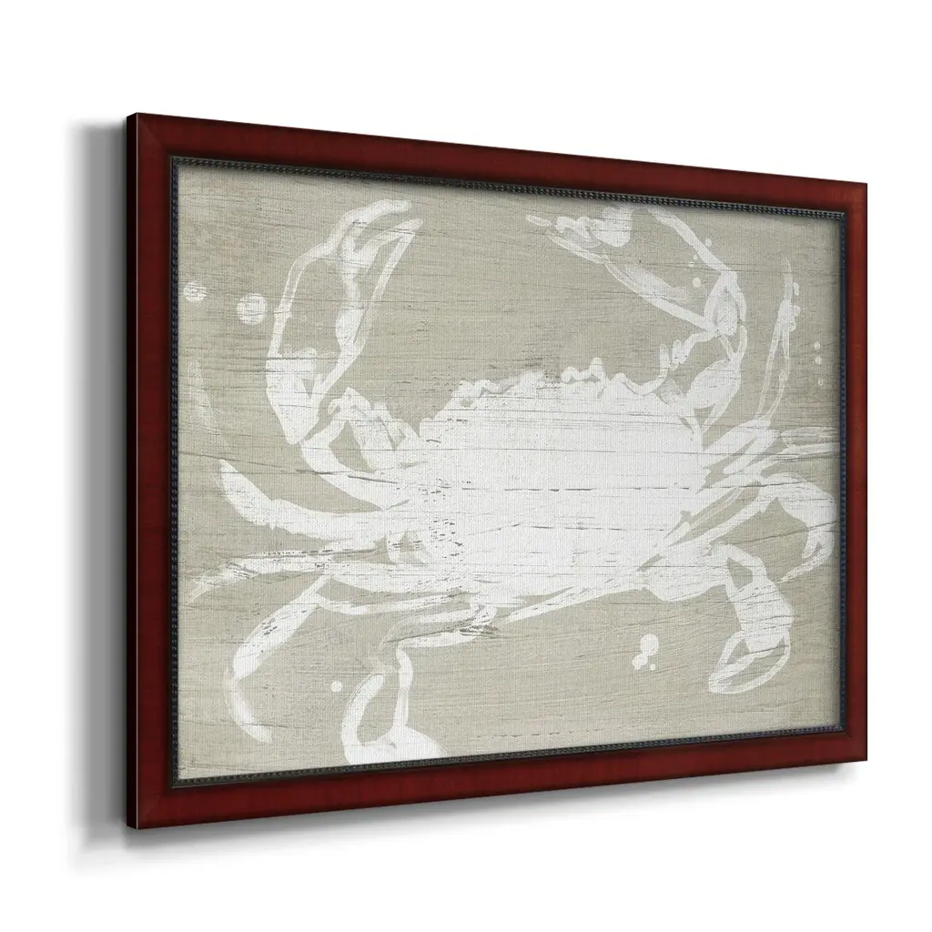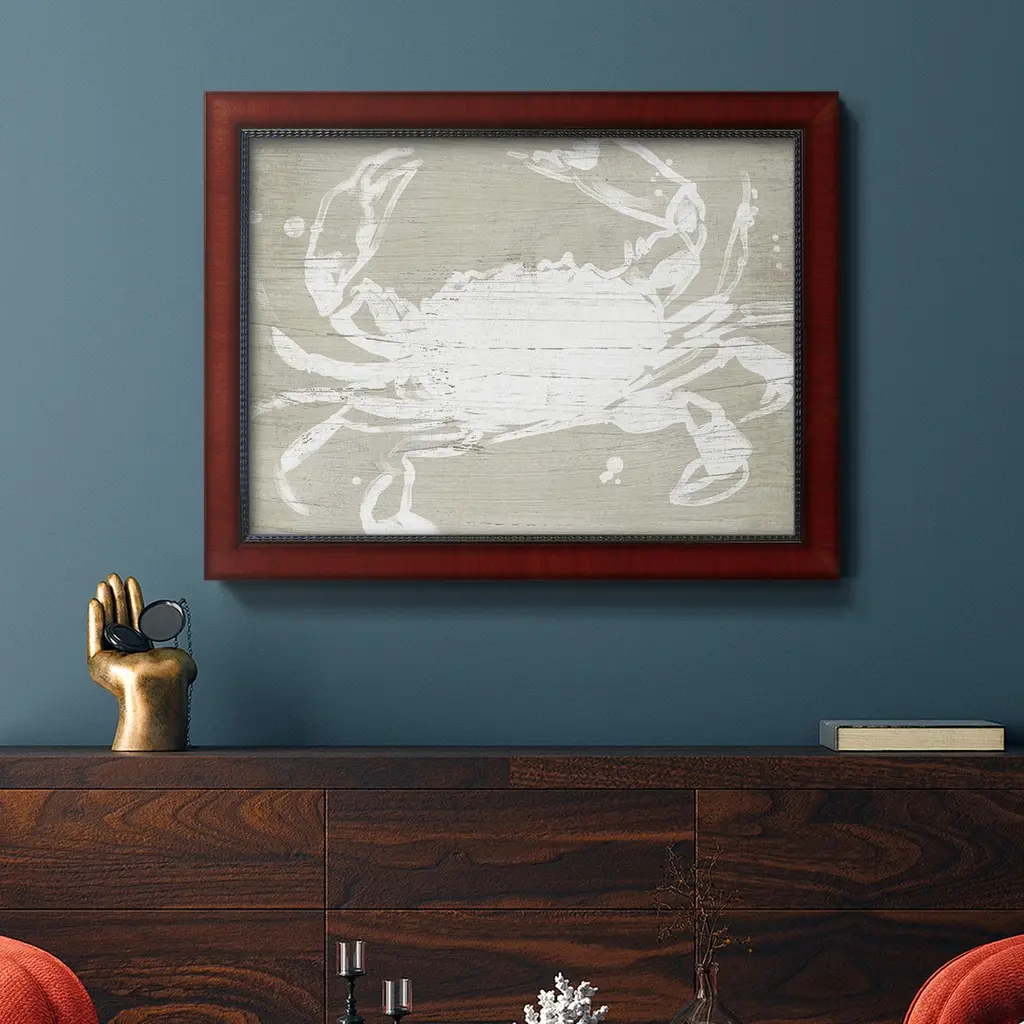 Weathered Crab I Premium Framed Canvas- Ready to Hang A Premium Framed Canvas created to last. Framed in distressed wood and available in an array of sizes and colors Featuring a beveled a solid wood stretcher bar, each piece comes ready to hand 3 SIZES AVAILABLE 16''X20'' - Overall Size 18'X27'' - Overall Size 24''x36'' - Overall Size Each piece is made to order. Each piece comes with hanging hardware. Made in the USA Ready to Hang Giclee Paper Print Acrylic Glass Beveled Matt Board