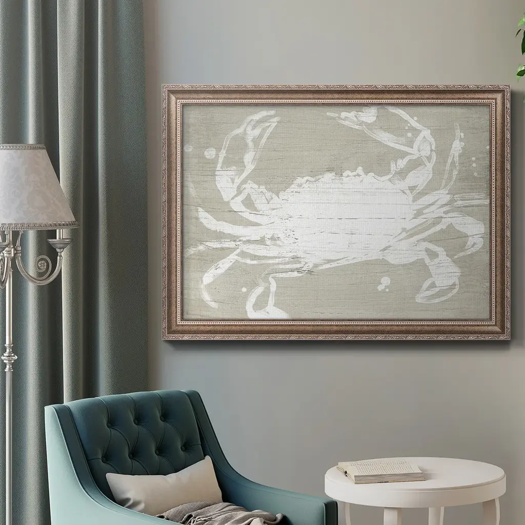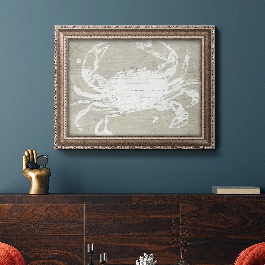 Weathered Crab I Premium Framed Canvas- Ready to Hang A Premium Framed Canvas created to last. Framed in distressed wood and available in an array of sizes and colors Featuring a beveled a solid wood stretcher bar, each piece comes ready to hand 3 SIZES AVAILABLE 16''X20'' - Overall Size 18'X27'' - Overall Size 24''x36'' - Overall Size Each piece is made to order. Each piece comes with hanging hardware. Made in the USA Ready to Hang Giclee Paper Print Acrylic Glass Beveled Matt Board