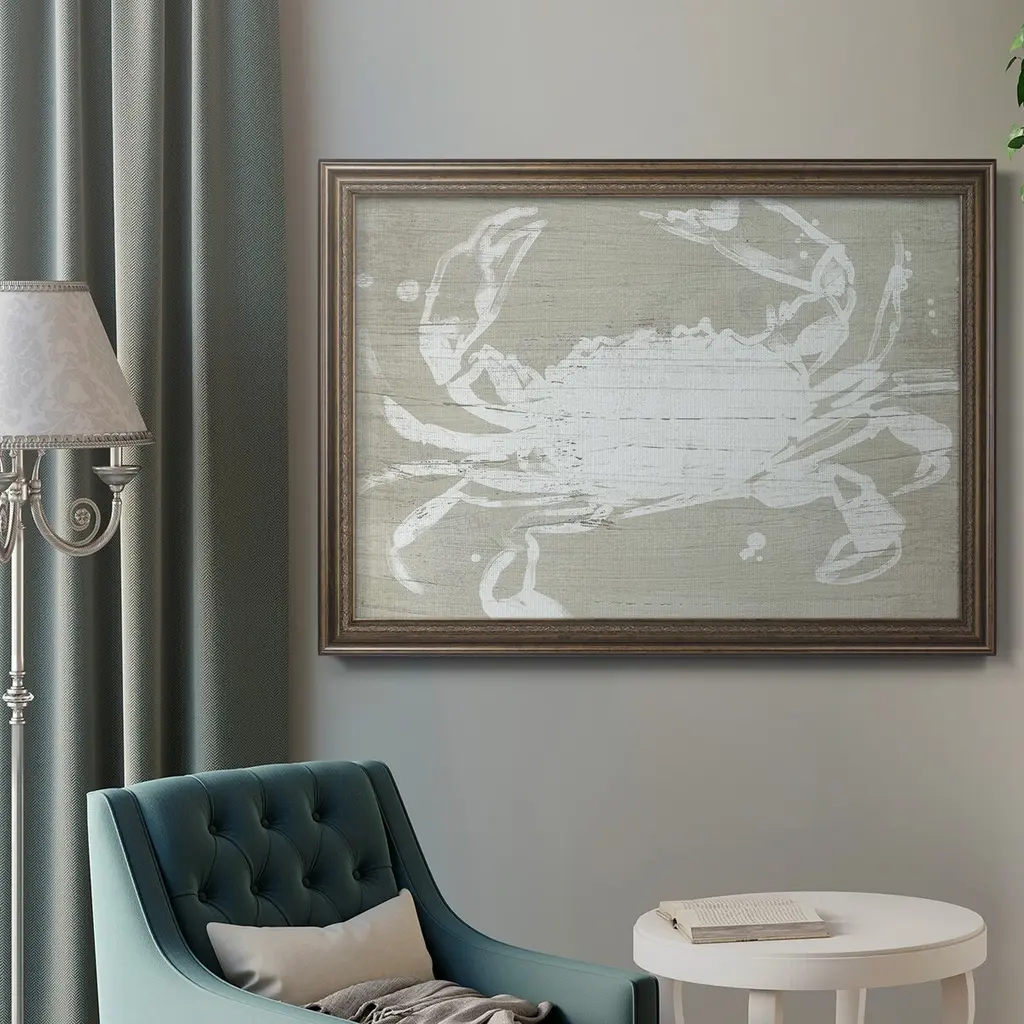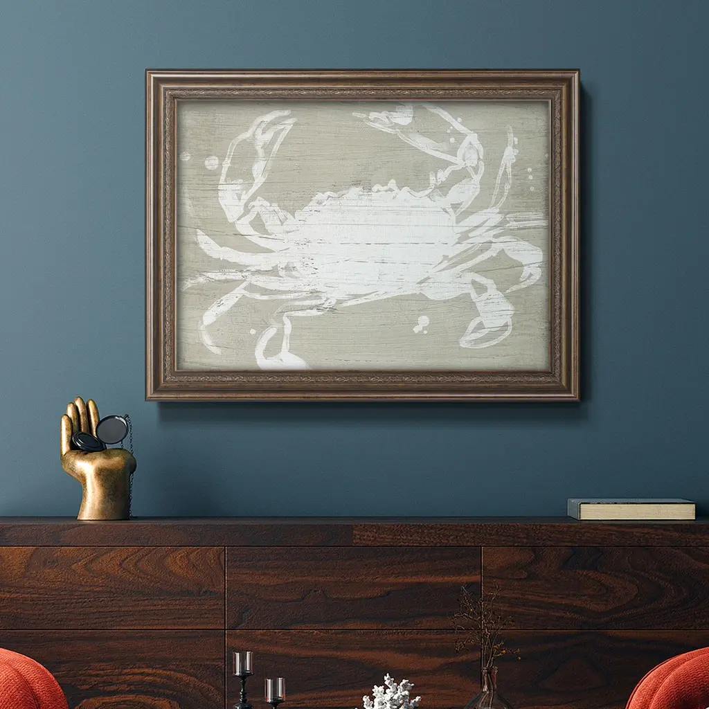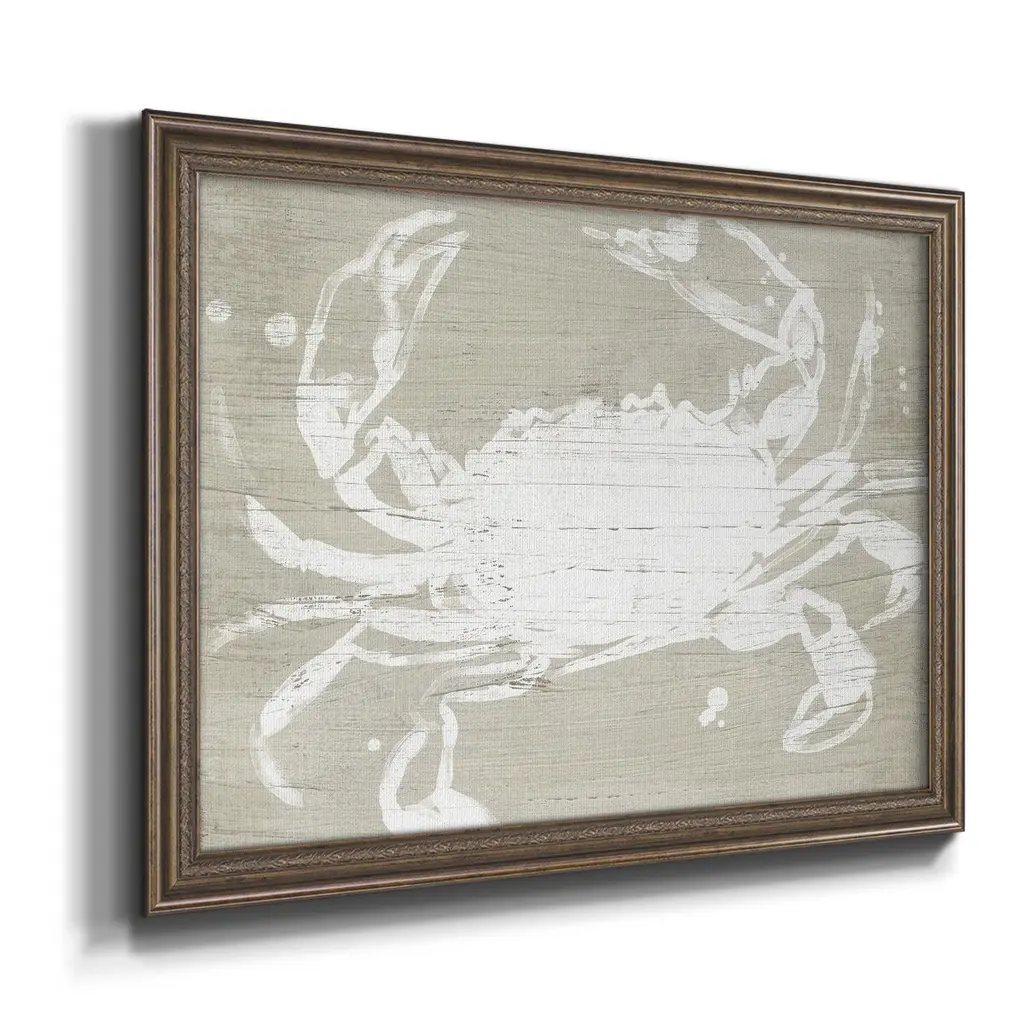 Weathered Crab I Premium Framed Canvas- Ready to Hang A Premium Framed Canvas created to last. Framed in distressed wood and available in an array of sizes and colors Featuring a beveled a solid wood stretcher bar, each piece comes ready to hand 3 SIZES AVAILABLE 16''X20'' - Overall Size 18'X27'' - Overall Size 24''x36'' - Overall Size Each piece is made to order. Each piece comes with hanging hardware. Made in the USA Ready to Hang Giclee Paper Print Acrylic Glass Beveled Matt Board