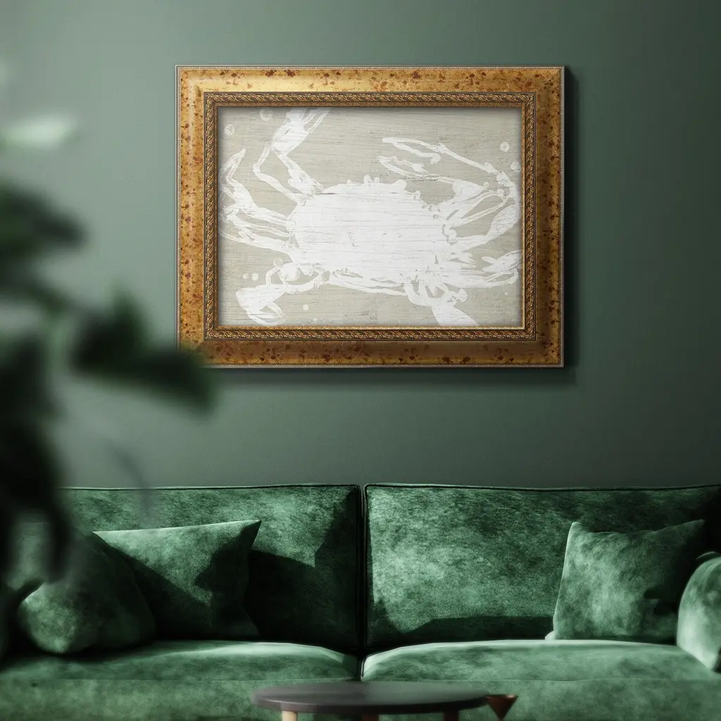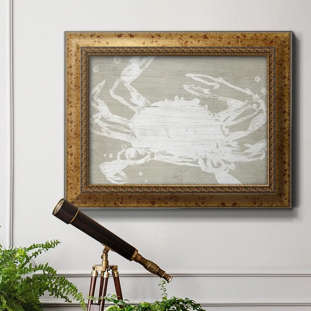 Weathered Crab II Premium Framed Canvas- Ready to Hang A Premium Framed Canvas created to last. Framed in distressed wood and available in an array of sizes and colors Featuring a beveled a solid wood stretcher bar, each piece comes ready to hand 3 SIZES AVAILABLE 16''X20'' - Overall Size 18'X27'' - Overall Size 24''x36'' - Overall Size Each piece is made to order. Each piece comes with hanging hardware. Made in the USA Ready to Hang Giclee Paper Print Acrylic Glass Beveled Matt Board