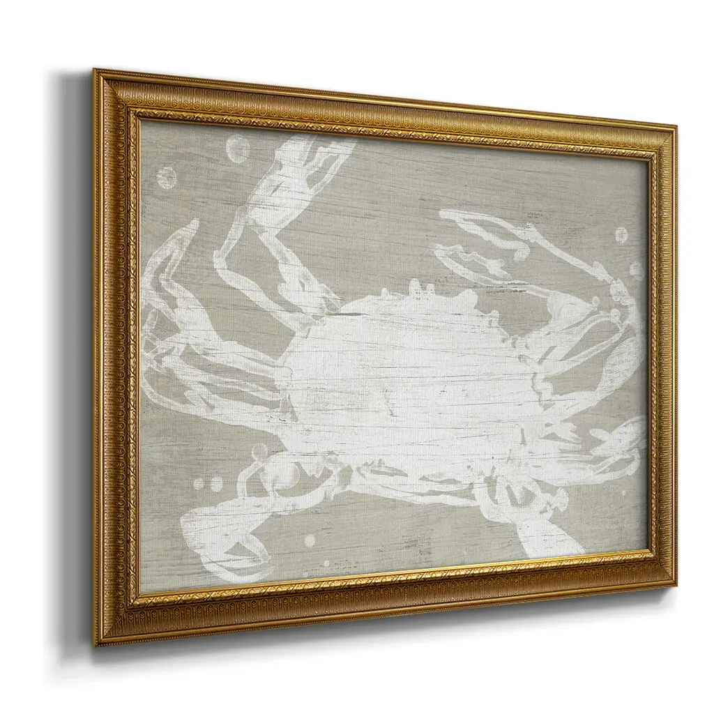 Weathered Crab II Premium Framed Canvas- Ready to Hang A Premium Framed Canvas created to last. Framed in distressed wood and available in an array of sizes and colors Featuring a beveled a solid wood stretcher bar, each piece comes ready to hand 3 SIZES AVAILABLE 16''X20'' - Overall Size 18'X27'' - Overall Size 24''x36'' - Overall Size Each piece is made to order. Each piece comes with hanging hardware. Made in the USA Ready to Hang Giclee Paper Print Acrylic Glass Beveled Matt Board