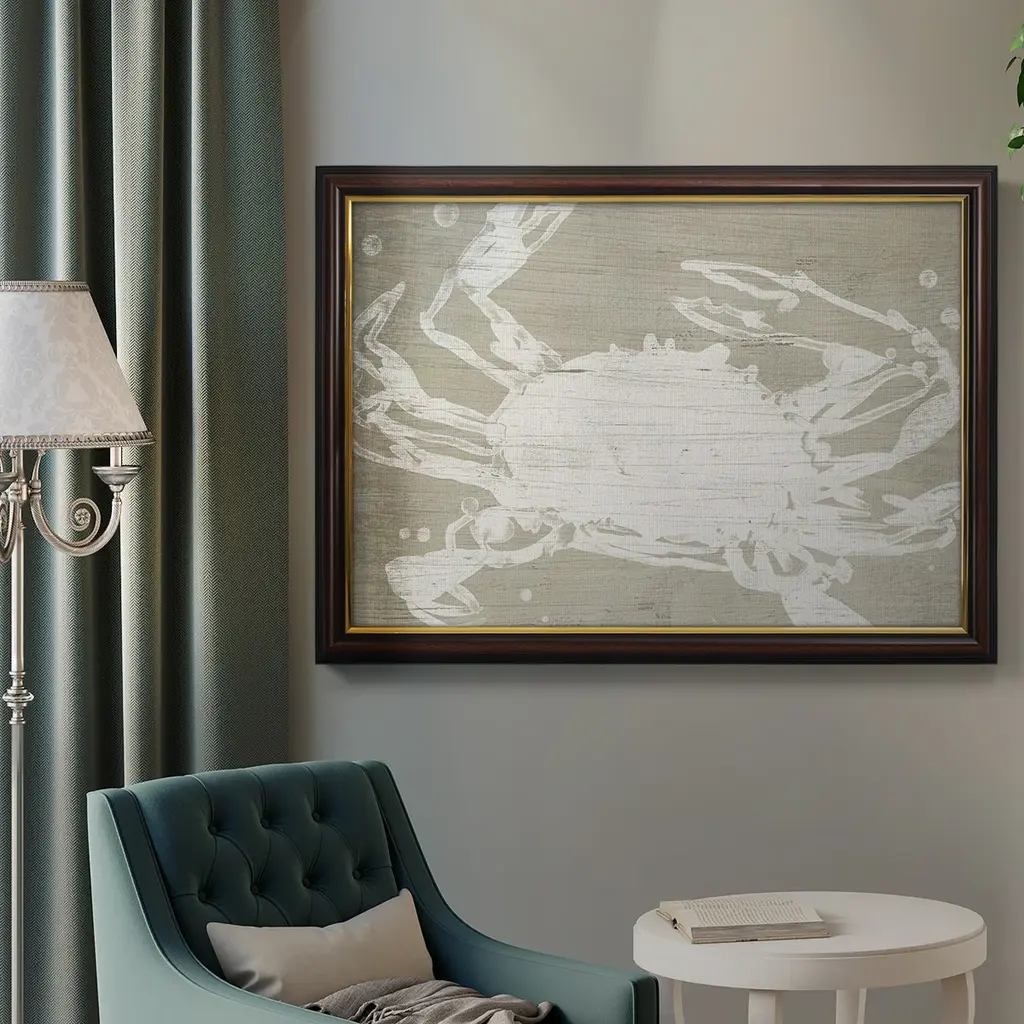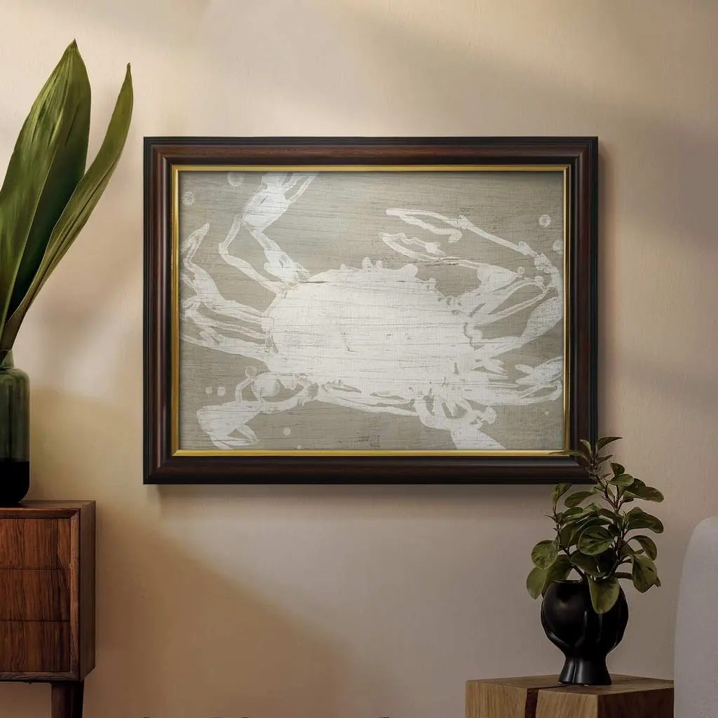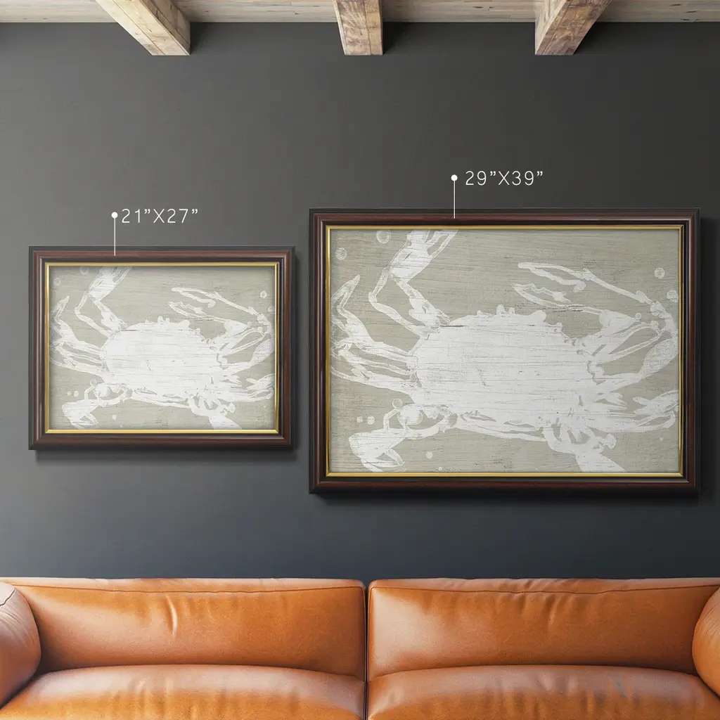 Weathered Crab II Premium Framed Canvas- Ready to Hang A Premium Framed Canvas created to last. Framed in distressed wood and available in an array of sizes and colors Featuring a beveled a solid wood stretcher bar, each piece comes ready to hand 3 SIZES AVAILABLE 16''X20'' - Overall Size 18'X27'' - Overall Size 24''x36'' - Overall Size Each piece is made to order. Each piece comes with hanging hardware. Made in the USA Ready to Hang Giclee Paper Print Acrylic Glass Beveled Matt Board