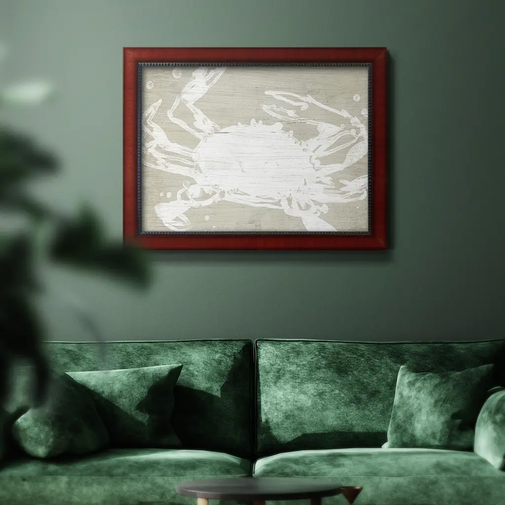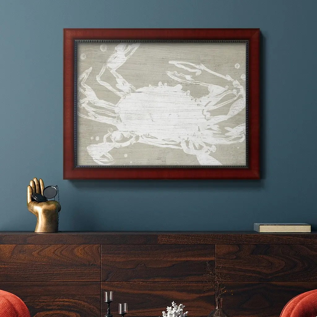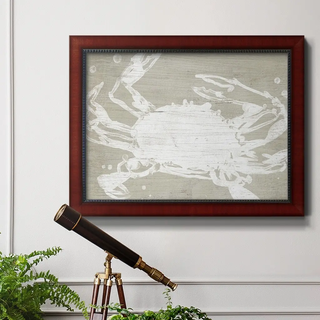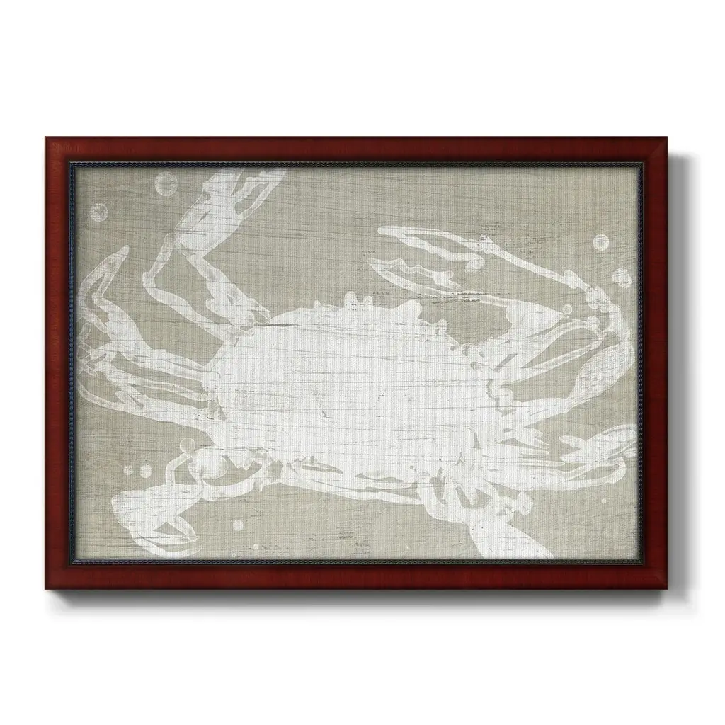 Weathered Crab II Premium Framed Canvas- Ready to Hang A Premium Framed Canvas created to last. Framed in distressed wood and available in an array of sizes and colors Featuring a beveled a solid wood stretcher bar, each piece comes ready to hand 3 SIZES AVAILABLE 16''X20'' - Overall Size 18'X27'' - Overall Size 24''x36'' - Overall Size Each piece is made to order. Each piece comes with hanging hardware. Made in the USA Ready to Hang Giclee Paper Print Acrylic Glass Beveled Matt Board