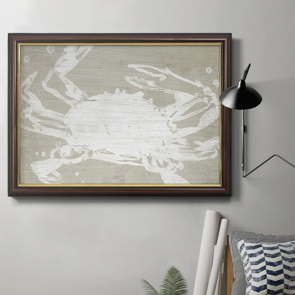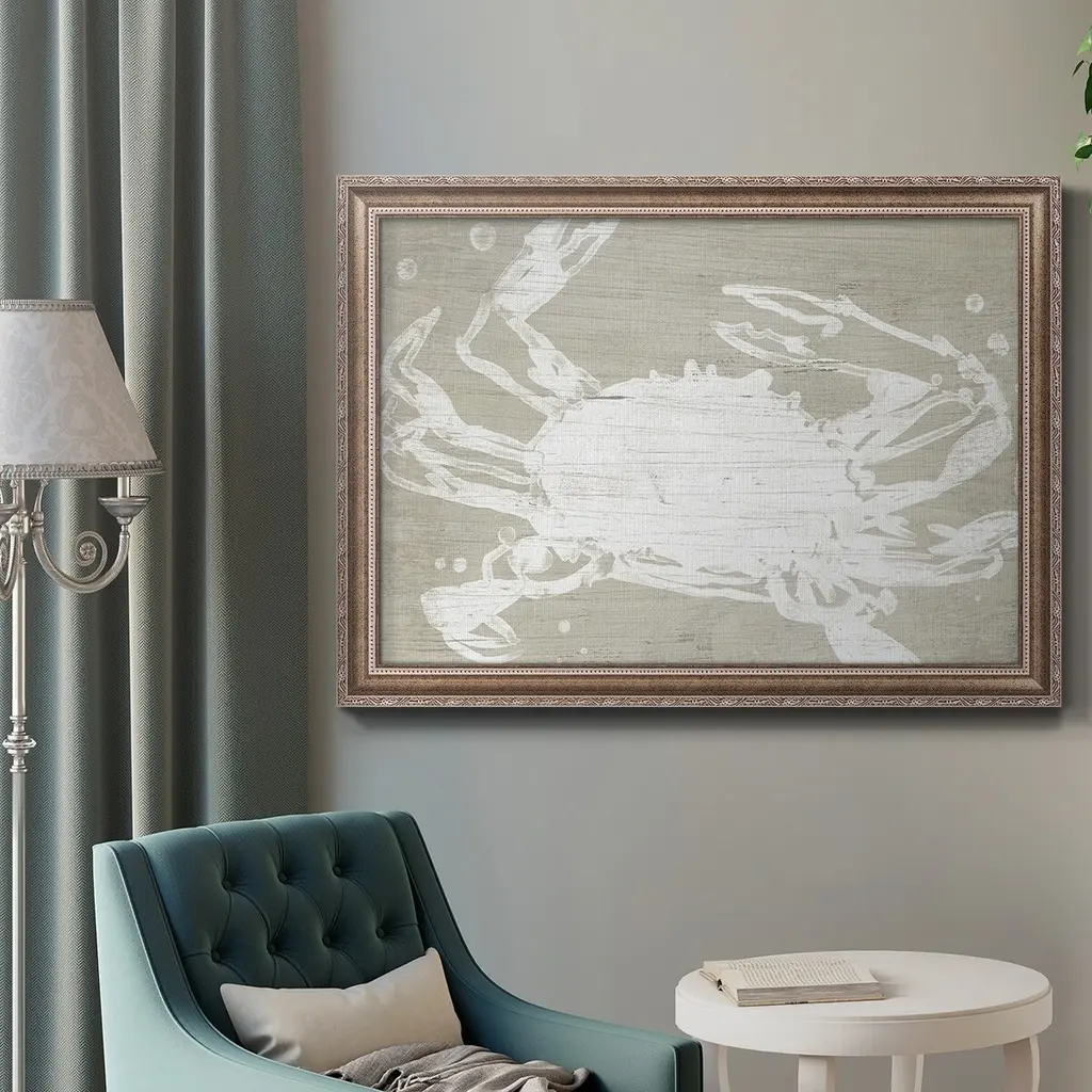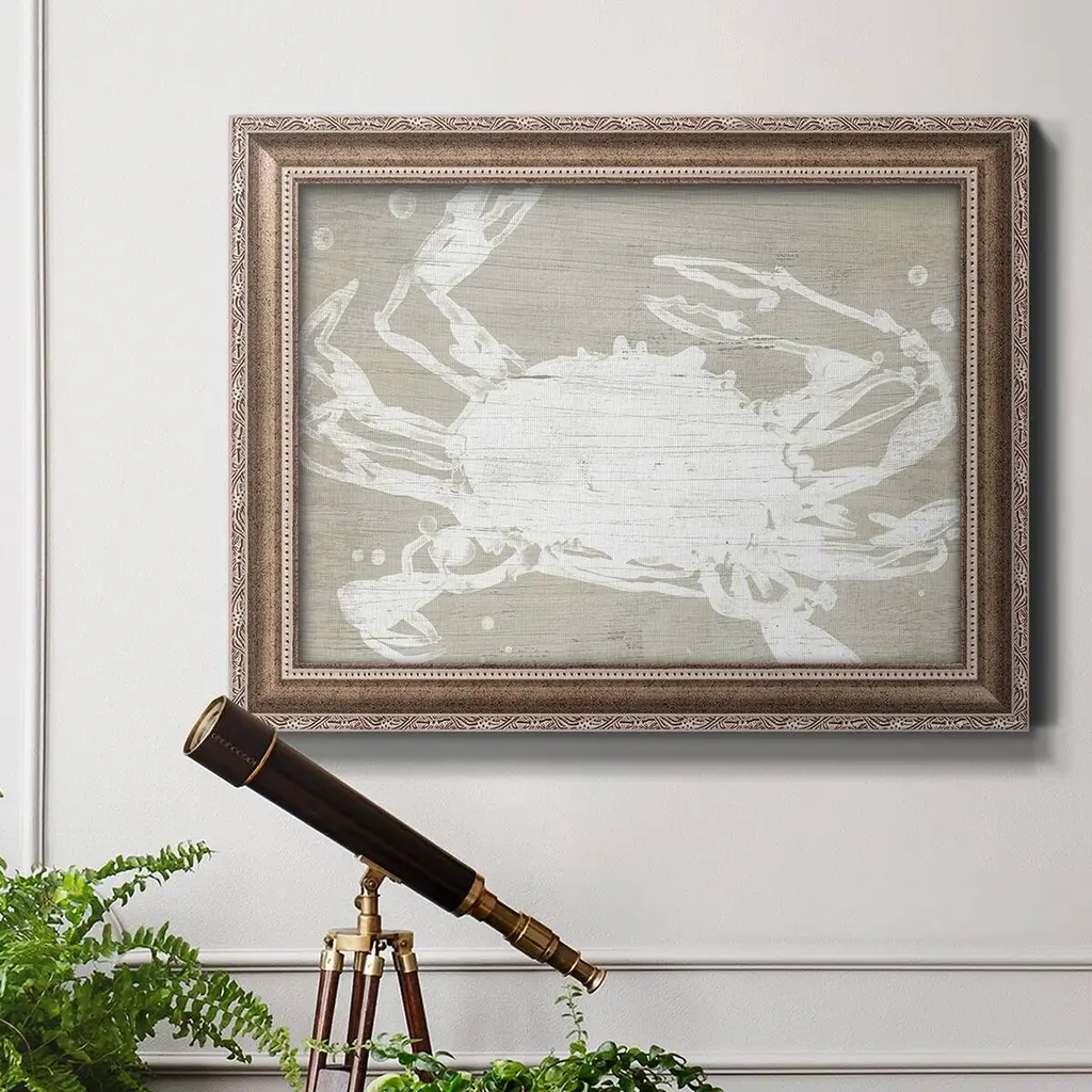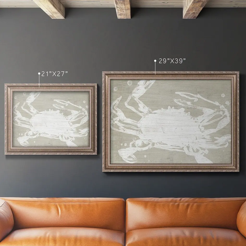 Weathered Crab II Premium Framed Canvas- Ready to Hang A Premium Framed Canvas created to last. Framed in distressed wood and available in an array of sizes and colors Featuring a beveled a solid wood stretcher bar, each piece comes ready to hand 3 SIZES AVAILABLE 16''X20'' - Overall Size 18'X27'' - Overall Size 24''x36'' - Overall Size Each piece is made to order. Each piece comes with hanging hardware. Made in the USA Ready to Hang Giclee Paper Print Acrylic Glass Beveled Matt Board