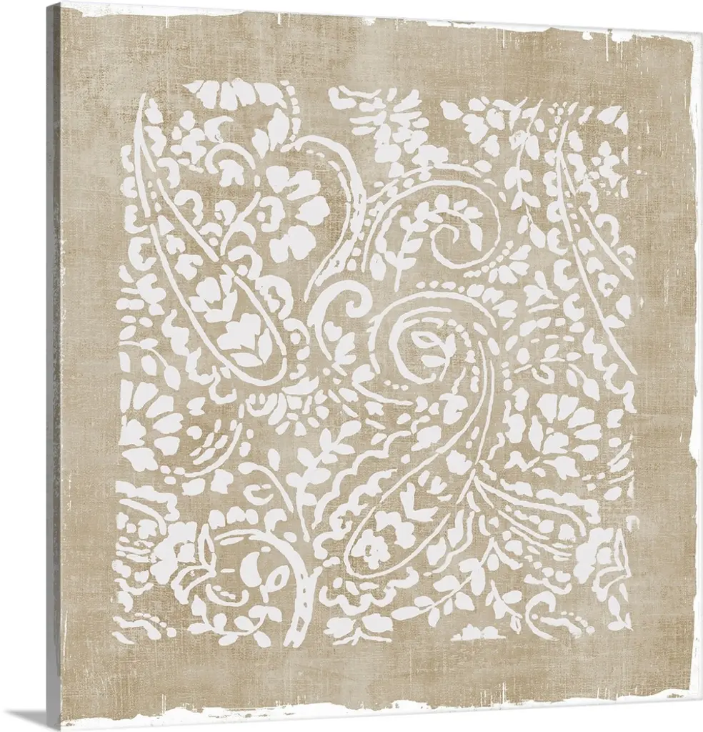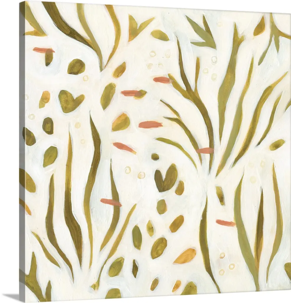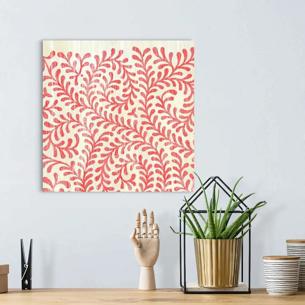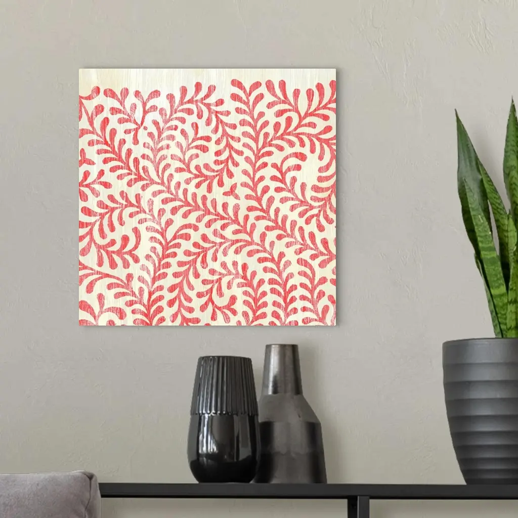 Square decorative artwork of a repetitive pattern a leaf vine design with a light streak overlay.