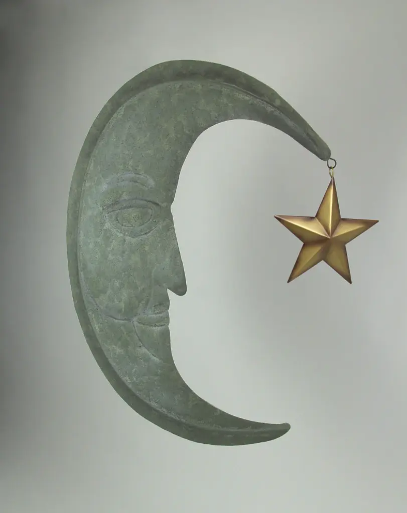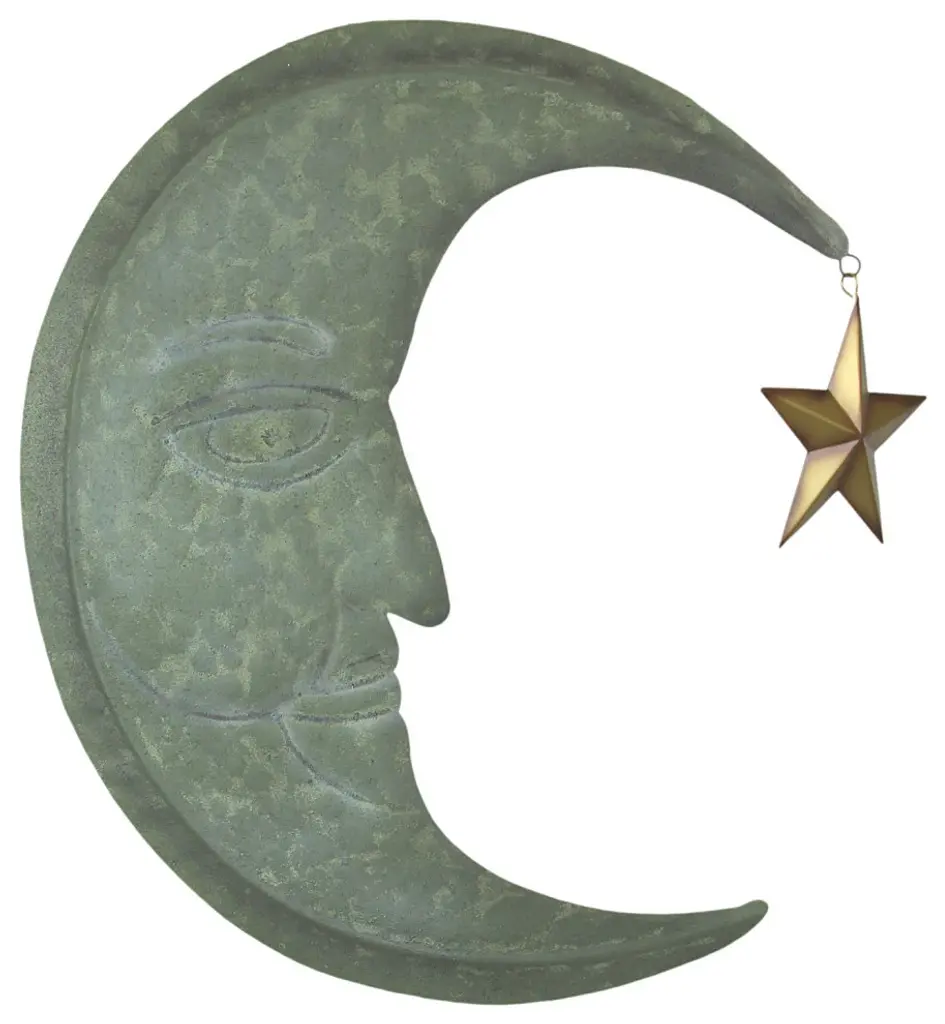 Artistic Elegance - Creatively crafted from durable metal, this crescent moon wall hanging measures approximately 25 inches high, 24 inches wide, and 0.5 inches thick. Its weathered verdigris green finish provides an aged look, adding rustic charm to any space.Quality Construction - Meticulously designed for lasting indoor or outdoor display, this wall décor showcases superior craftsmanship. The metal construction ensures durability, allowing you to enjoy its celestial beauty for years to come.Celestial Accent - Enhance your hallways, porches, and patios with the enchanting allure of this weathered crescent moon. Its celestial charm transforms ordinary spaces into captivating realms, creating a magical atmosphere for everyone to admire.Versatile Placement - Whether adorning your indoor corridors or outdoor retreats, this moon wall hanging effortlessly elevates any environment. Its versatile design allows you to place it in various settings, enhancing the aesthetic appeal of your home.Thoughtful Gift - Delight your friends, family, or even yourself with this exquisite crescent moon wall décor. Its timeless design and impeccable craftsmanship make it a perfect gift choice, bringing celestial beauty and artistic sophistication to any space.Add a touch of celestial elegance to your indoor or outdoor space with our crescent moon wall hanging. This enchanting metal art sculpture features a smiling moon with a golden dangling embellishment on the top right, exuding a harmonious balance. Its oxidized verdigris green finish lends it a charmingly weathered appearance, making it a delightful addition to any wall. Measuring 25 inches high, 23.75 inches wide, and 0.5 inches thick, this large crescent moon wall decor creates a captivating focal point wherever it hangs. Whether adorning your bedroom, living room, or outdoor spaces like the pool area, patio, or garden, this piece brings an artistic touch and celestial charm to your surroundings. Hang it on your fence, patio wall, or near the front entry to welcome your guests with its whimsical allure. The golden embellishment adds a touch of luxury, enhancing its visual appeal. Its versatile design allows you to place it indoors or outdoors, making it a versatile and eye-catching decor choice. Embrace the magic of the moon phases with this celestial wall art, showcasing the beauty of the night sky in an artful and inspiring manner. Let this crescent moon wall hanging elevate your decor, bringing personality and character to your home or outdoor living spaces.
