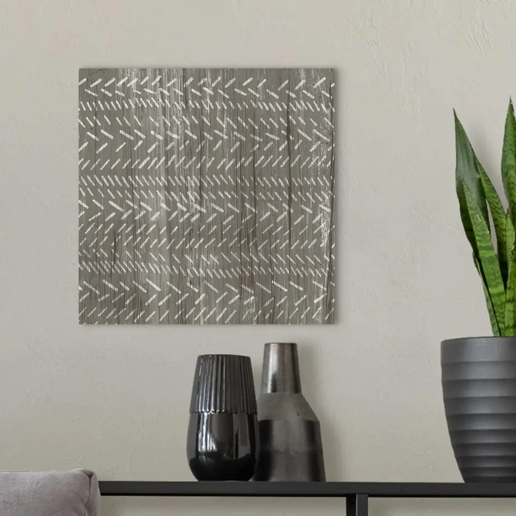 Square decorative artwork of a repetitive pattern of short angled lines with a light streak overlay.