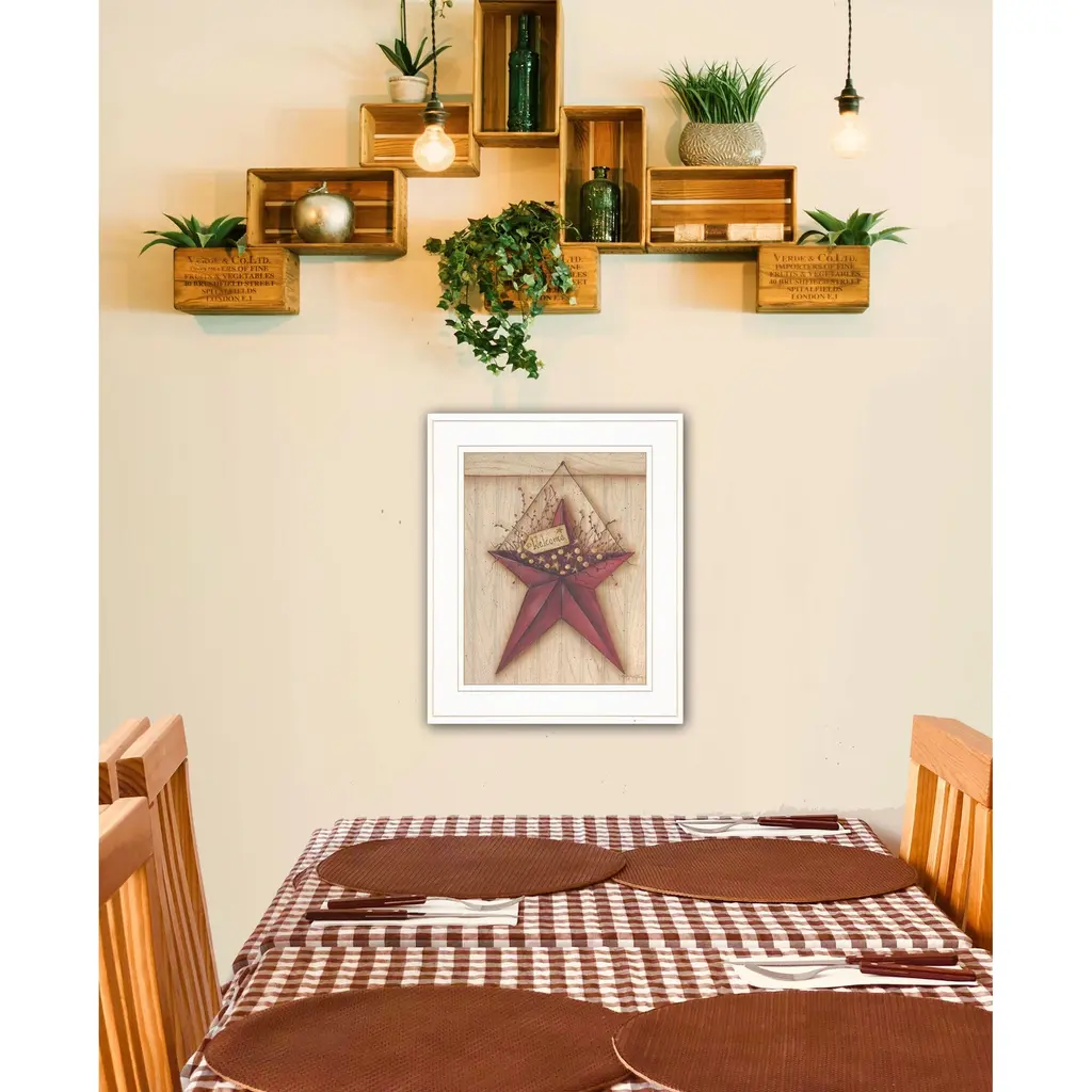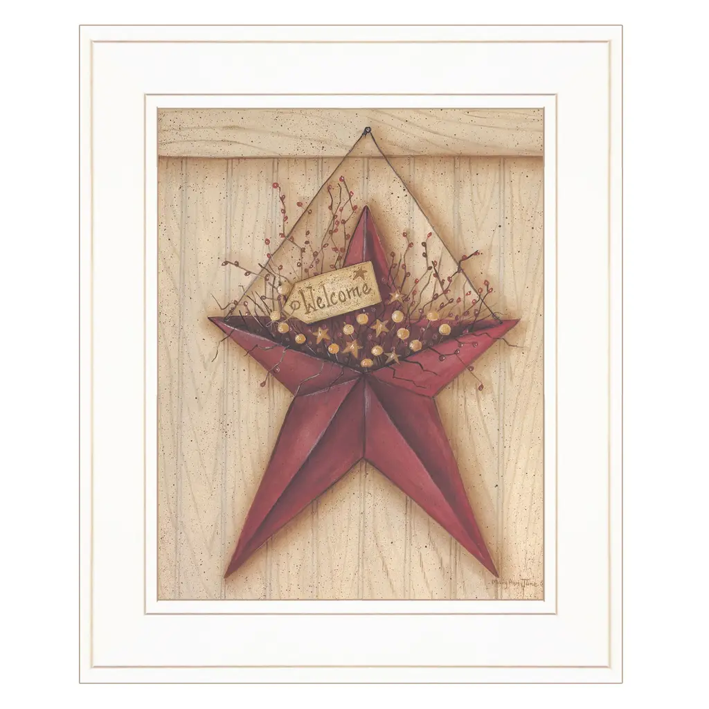 Unique and decorative, this welcome barn star 2 white framed print wall art will leave a lasting impression. This print is a visual artistic expression that allows you to decorate your space in style. Reproduced for you on wood, this hanging decorative accent will be a trendy and fashionable way to dress your walls in a rustic and modern farmhouse vibe. Hang on your wall to add some up to date fashion and decoration. Instantly liven up your space with this art that brings color and dimension to your walls. 17" H x 14" W x 1" D