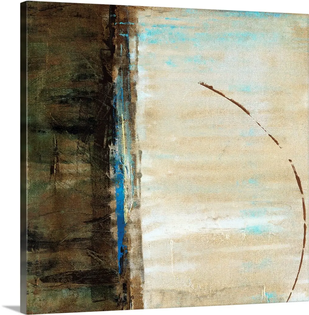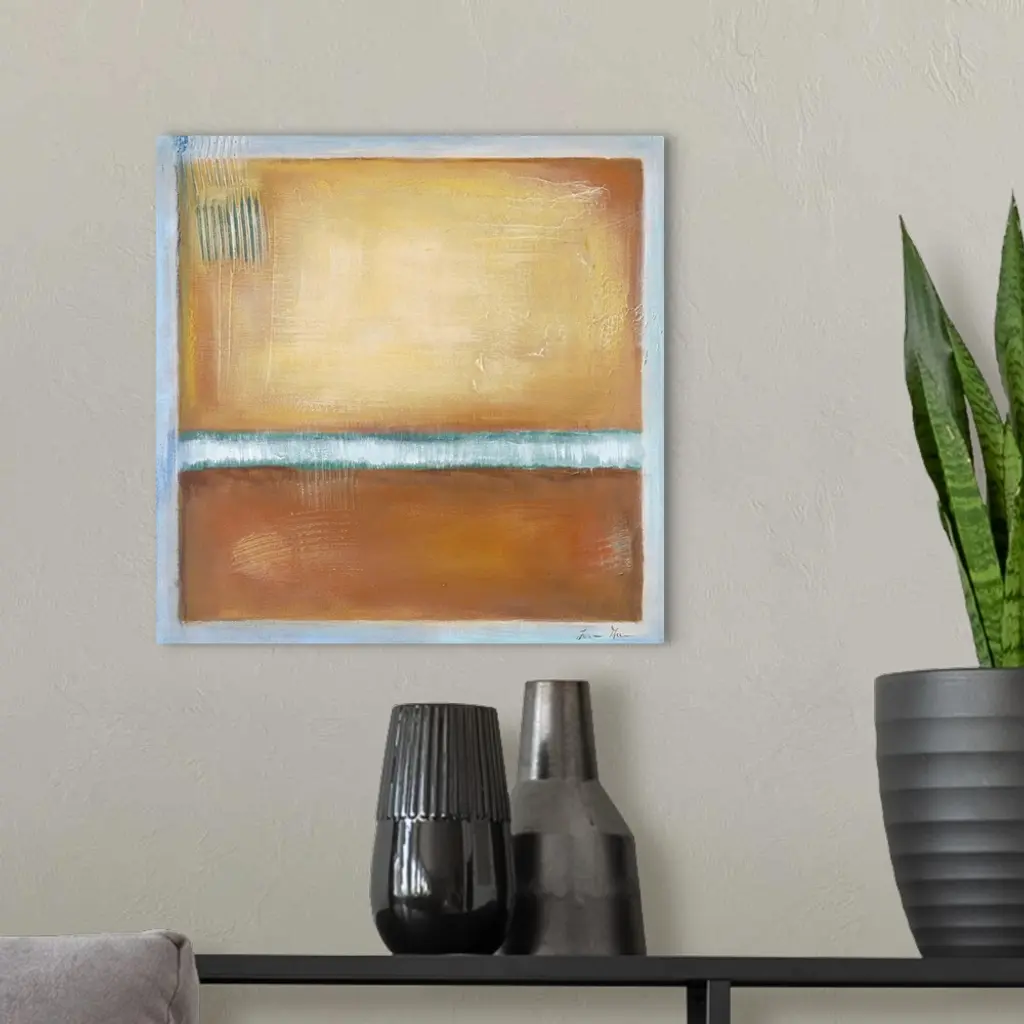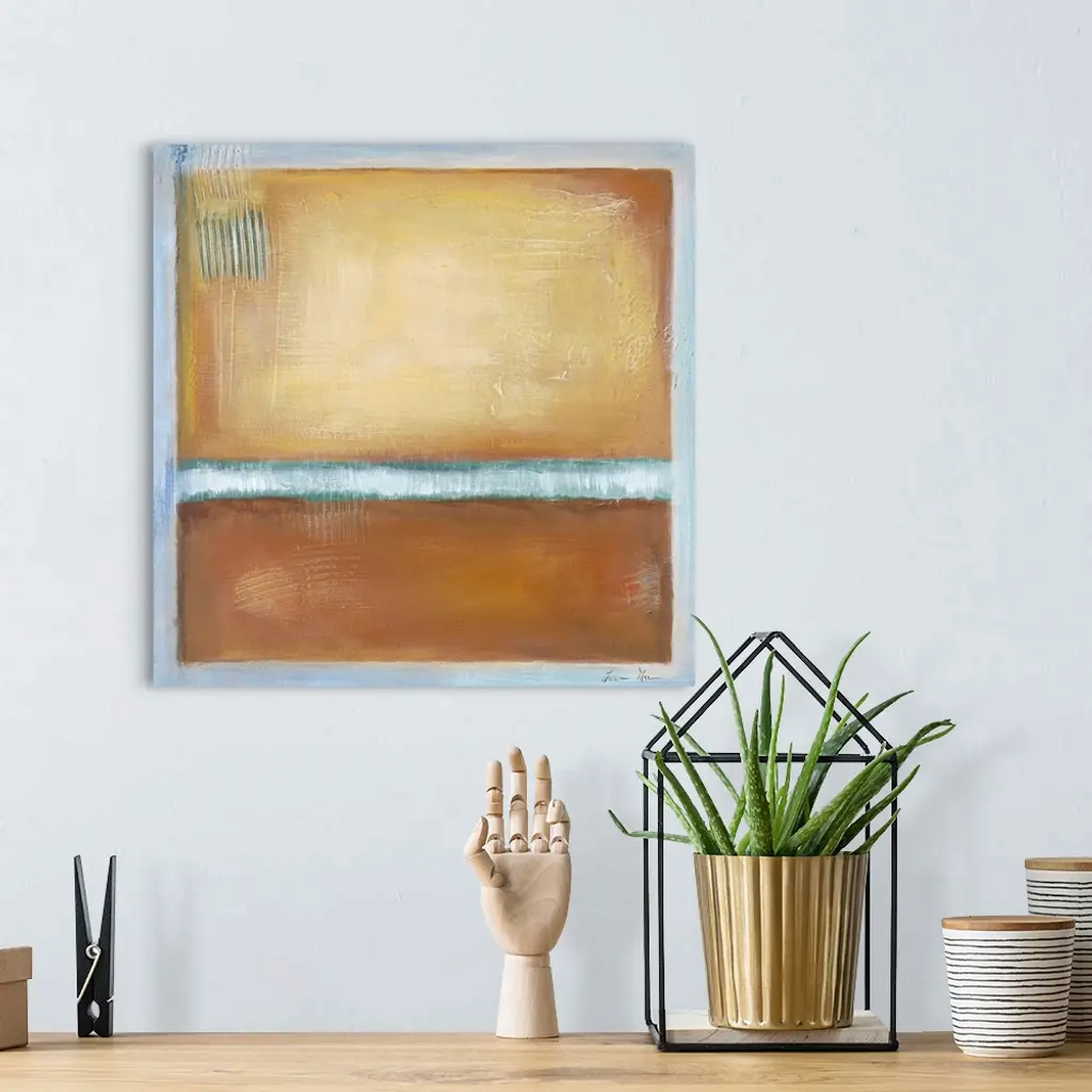 Square, abstract painting featuring large blocks of color in tan with light blue accents