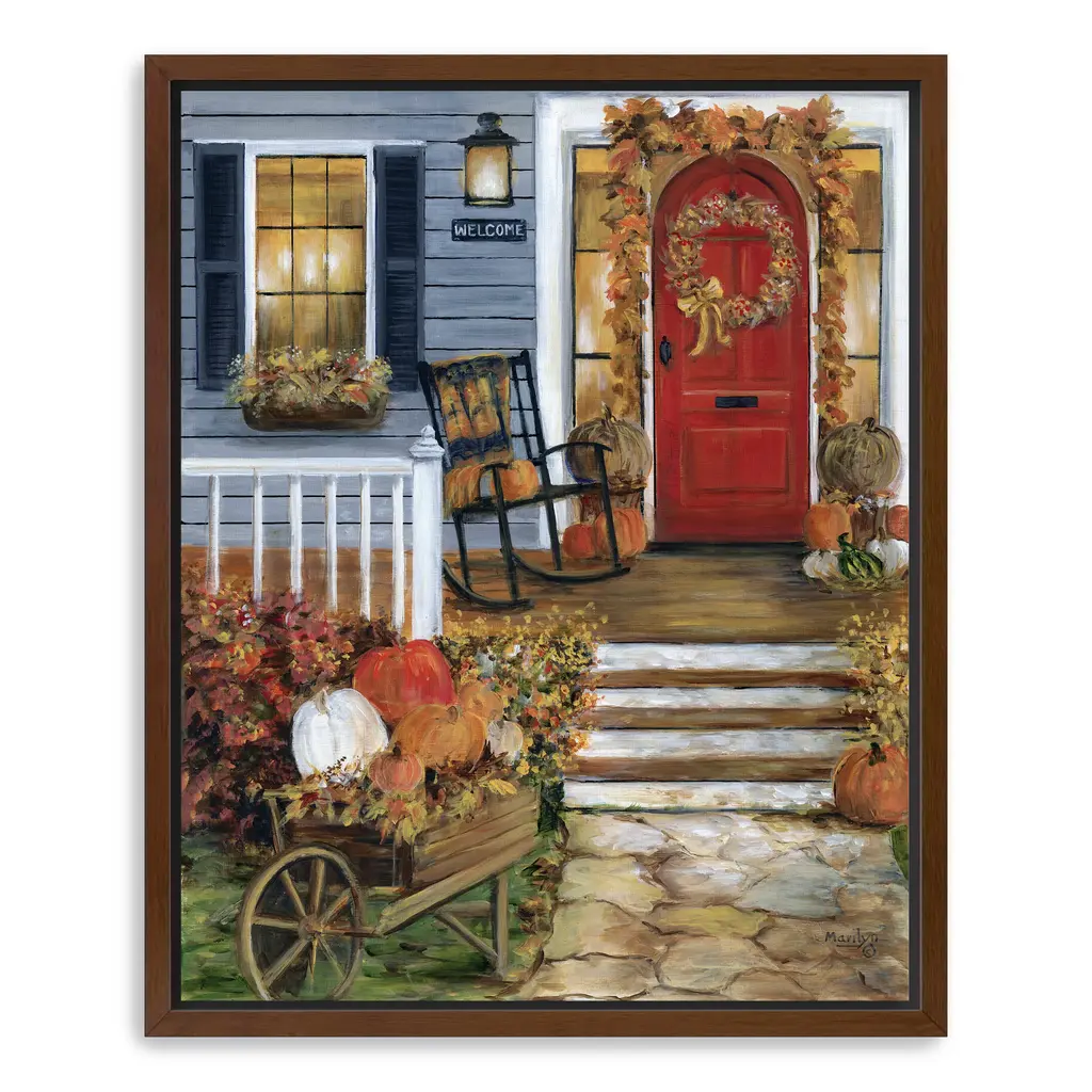 A vibrant red door welcomes the season with pumpkins, golden leaves, and a rustic rocking chair bathed in warm afternoon light. Rich hues of crimson, amber, and slate blue create a cozy fall atmosphere perfect for seasonal decor. Our Gallery Wrap Canvas Prints are proudly assembled with high quality materials in California, USA. Each piece is printed on a thick, archival grade canvas using Giclee technology. It is then hand-stretched by our experienced artisans over solid wood bars, which will not warp over time. The final product is a piece personally crafted for you to confidently display on your wall. Care and Assembly: Ensure that the location of your piece has little to no exposure to heat, sunlight, and moisture. Wipe clean, only if needed. Each piece includes hanging hardware to hang on your wall vertically.