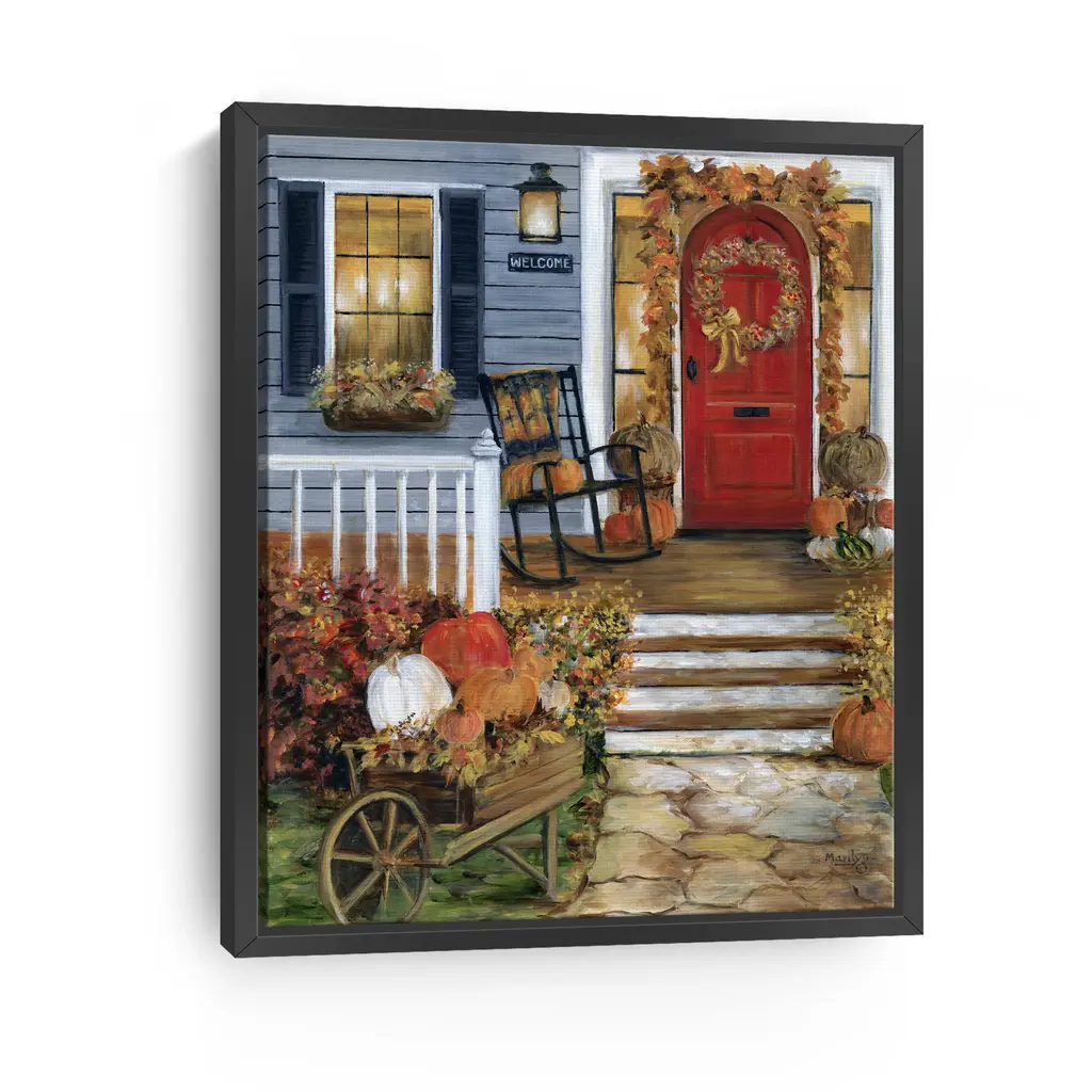 A vibrant red door welcomes the season with pumpkins, golden leaves, and a rustic rocking chair bathed in warm afternoon light. Rich hues of crimson, amber, and slate blue create a cozy fall atmosphere perfect for seasonal decor. Our Gallery Wrap Canvas Prints are proudly assembled with high quality materials in California, USA. Each piece is printed on a thick, archival grade canvas using Giclee technology. It is then hand-stretched by our experienced artisans over solid wood bars, which will not warp over time. The final product is a piece personally crafted for you to confidently display on your wall. Care and Assembly: Ensure that the location of your piece has little to no exposure to heat, sunlight, and moisture. Wipe clean, only if needed. Each piece includes hanging hardware to hang on your wall vertically.