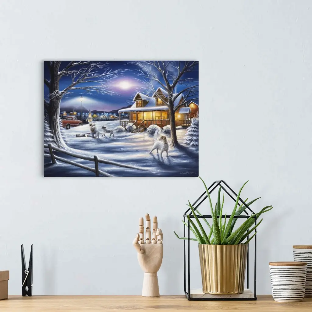 A contemporary idyllic painting of a countryside cottage in winter covered with fresh powdery snow.