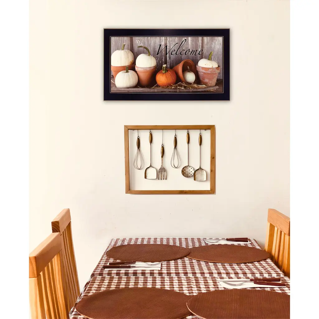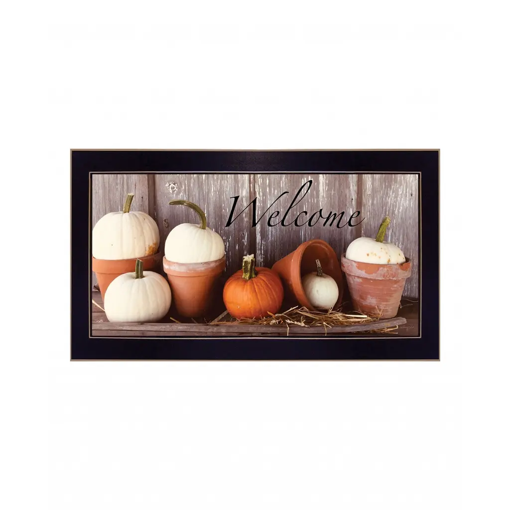 Add an air of fashion to your room and rejuvenate the space with this welcome pumpkin shelf 3 black framed print living room wall art. This print is a visual artistic expression that allows you to decorate your space in style. Reproduced for you on paper, this hanging decorative accent will be a trendy and fashionable way to dress your walls. Adding this hanging wall art to your space to make your room feel more finished and attractive. Utilize this opportunity to create a focal point in the room with this fabulous wall decor option. 11" H x 20" W x 1" D