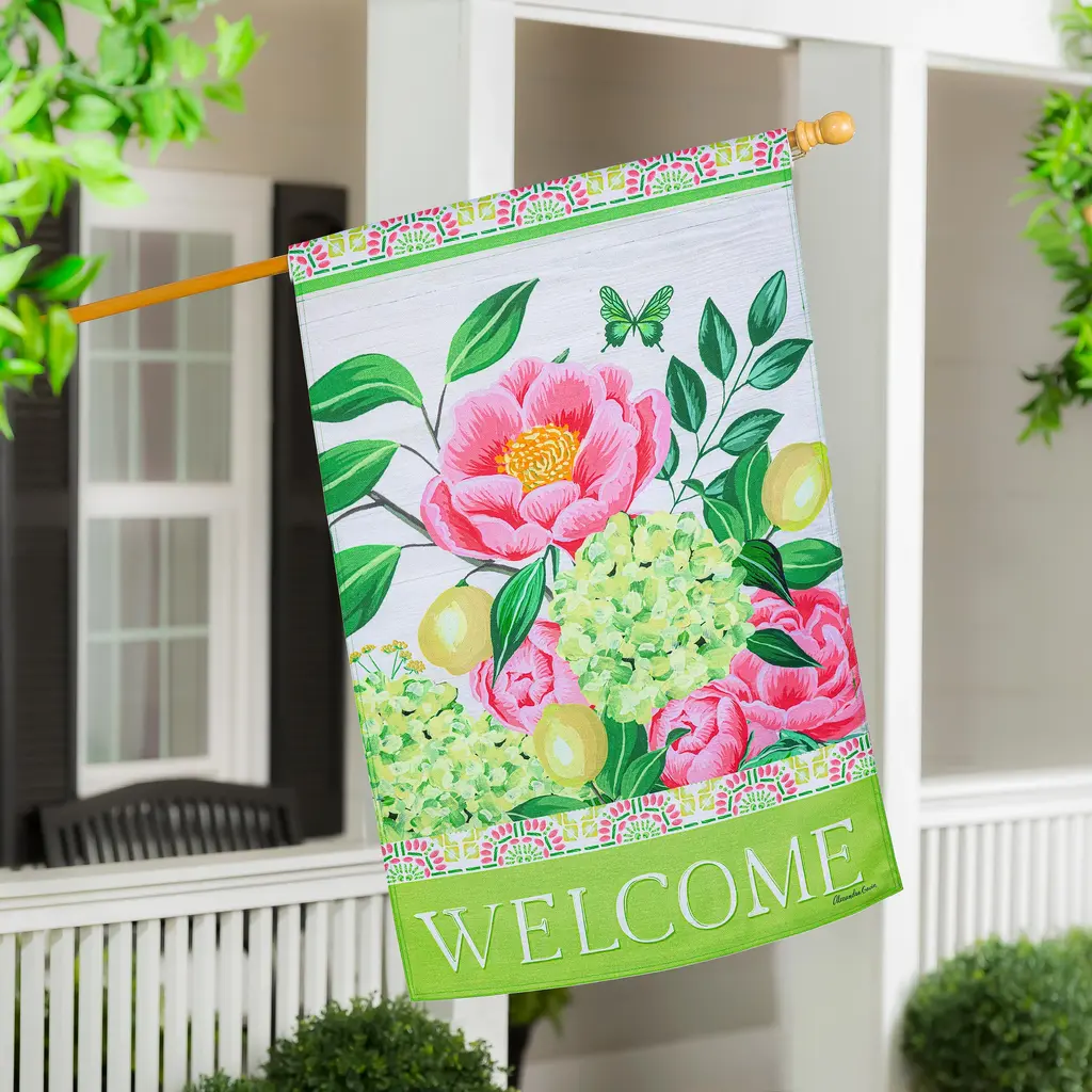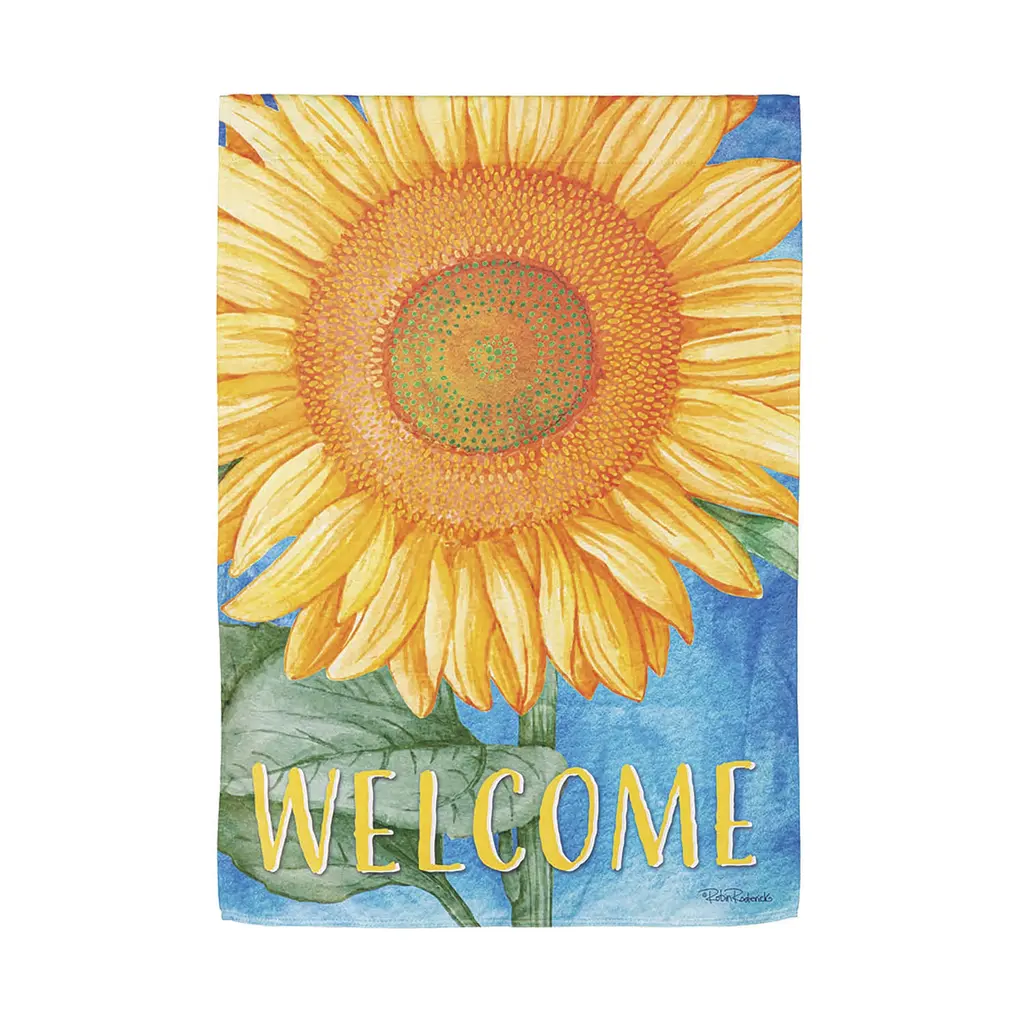 Add a refreshing touch to any yard or garden with this flag. With its happy “Welcome” message and sunflower design, this flag welcomes friends and family to the home in style. Flag is crafted of medium-weight suede fabric made from recycled plastic that provides a soft and durable texture. Artwork is heat transferred onto the sun-blocking material so that it is easily viewed from both sides. The weatherproof flag will not fray or fade with continued outdoor use. This flag features a sleeve for use with any standard flagpole or stand, sold separately.