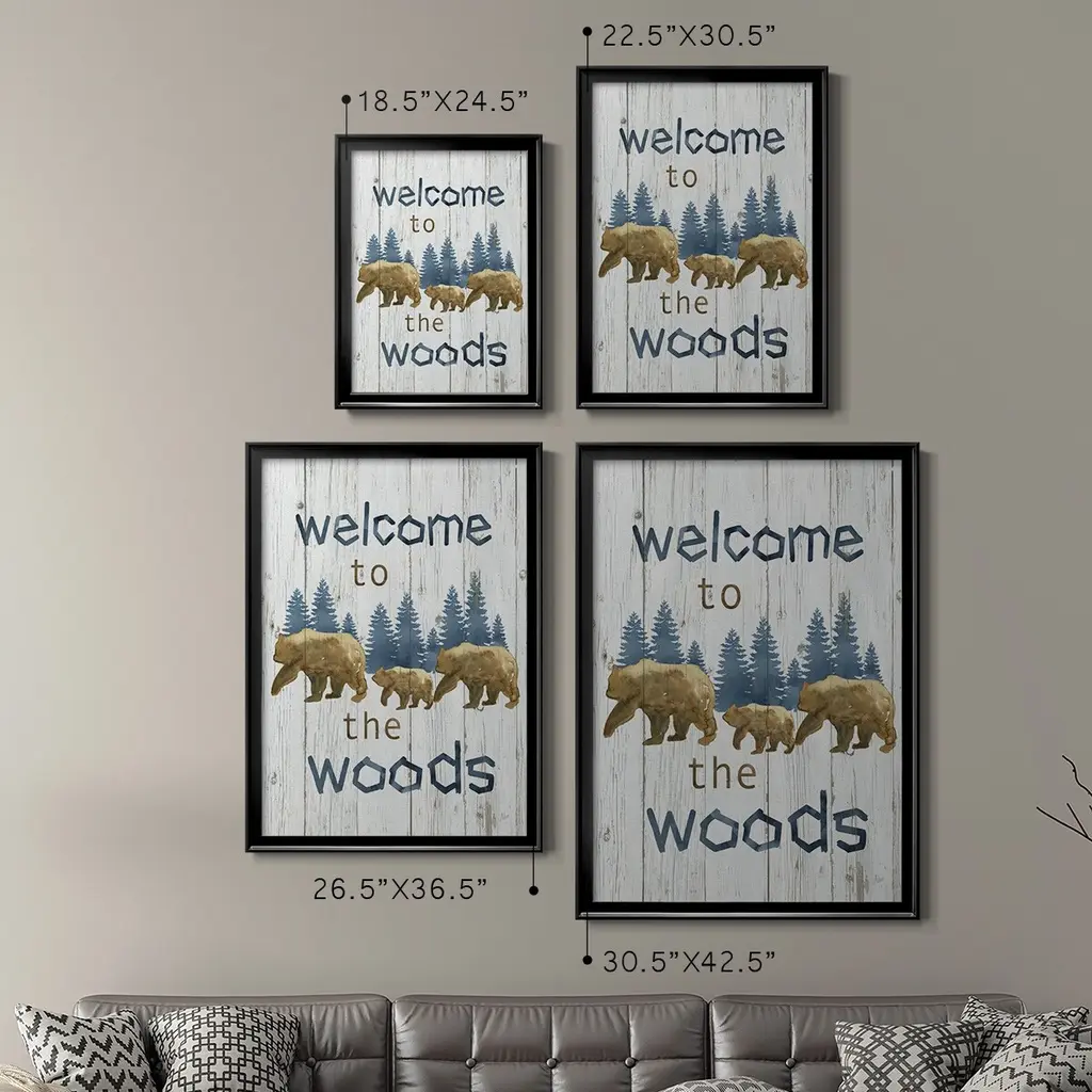 Welcome to the Woods Premium Framed Print - Ready to Hang A Premium Framed Print created to last. Framed in distressed wood and available in an array of sizes and colors Featuring a beveled a solid wood stretcher bar, each piece comes ready to hand 4 SIZES AVAILABLE 30.5''X42.5'' - Overall Size 26.5'X36.5'' - Overall Size 22.5''x30.5'' - Overall Size 18.5''x24.5'' - Overall Size Each piece is made to order. Each piece comes with hanging hardware. Made in the USA Ready to Hang