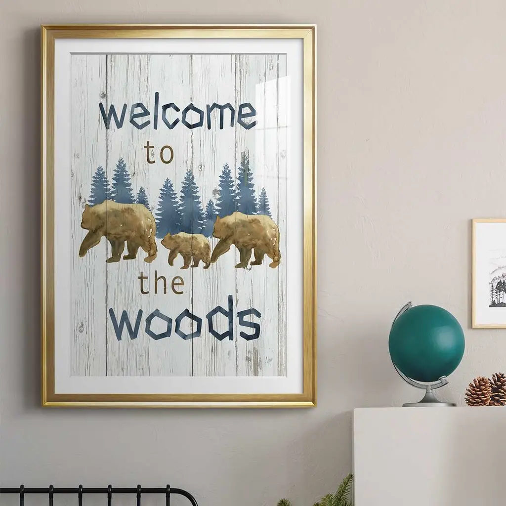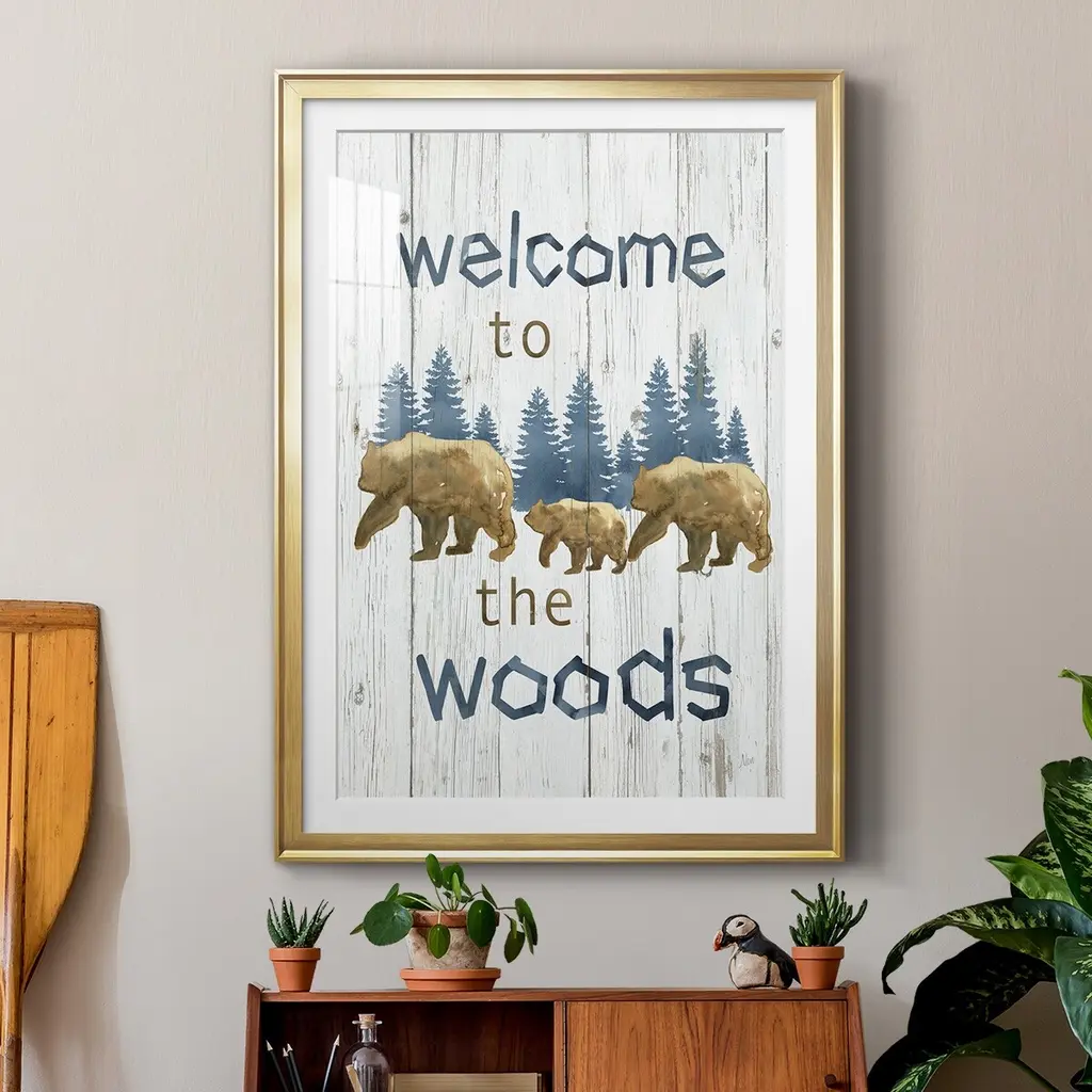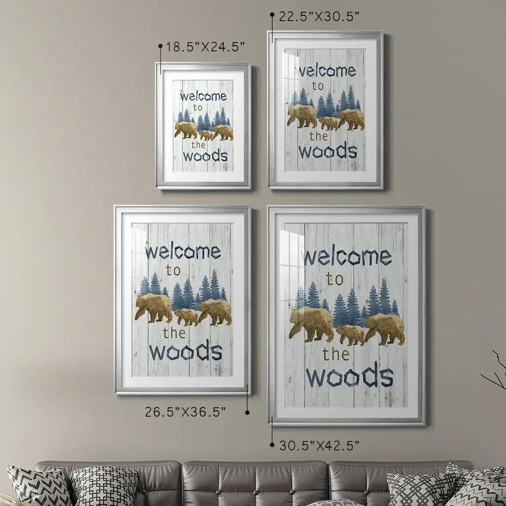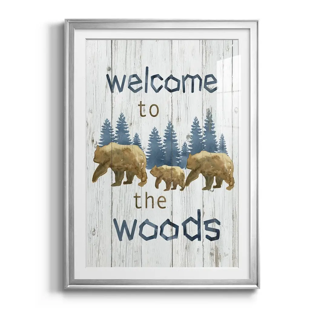 Welcome to the Woods Premium Framed Print - Ready to Hang A Premium Framed Print created to last. Framed in distressed wood and available in an array of sizes and colors Featuring a beveled a solid wood stretcher bar, each piece comes ready to hand 4 SIZES AVAILABLE 30.5''X42.5'' - Overall Size 26.5'X36.5'' - Overall Size 22.5''x30.5'' - Overall Size 18.5''x24.5'' - Overall Size Each piece is made to order. Each piece comes with hanging hardware. Made in the USA Ready to Hang Giclee Paper Print Acrylic Glass Beveled Matt Board