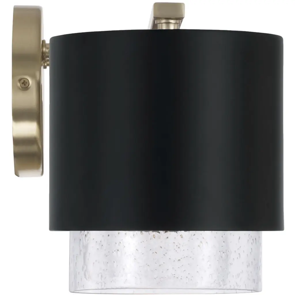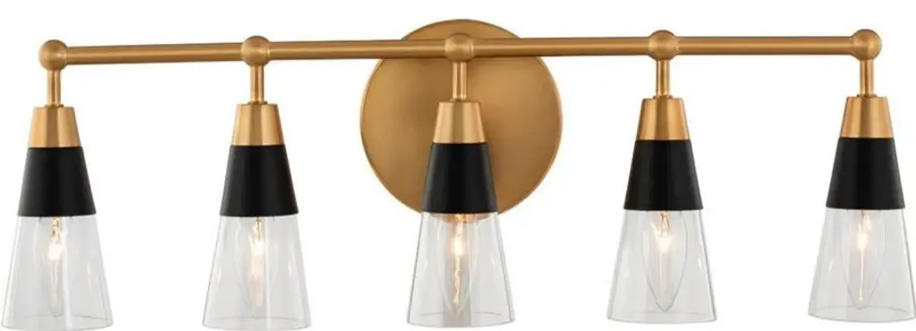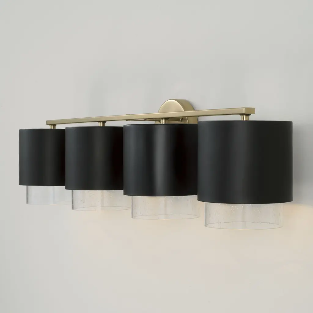 Contemporary forms meet illuminated elegance. The Weller 4-Light Vanity combines sleek, cylindrical silhouettes with seeded glass to cast a unique powder room glow. The Matte Black finish with painted Matte Brass interior brings mixed metal intrigue and a hint of shine.