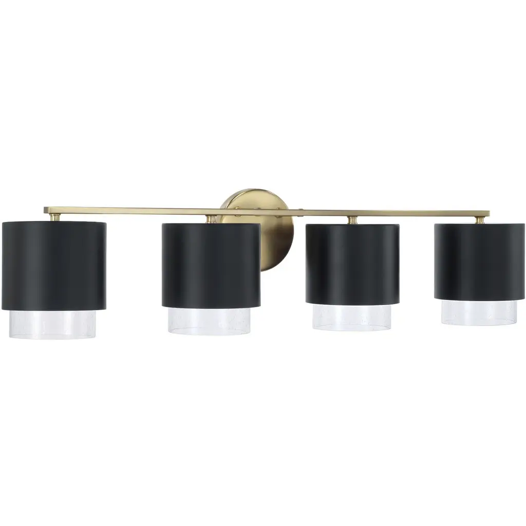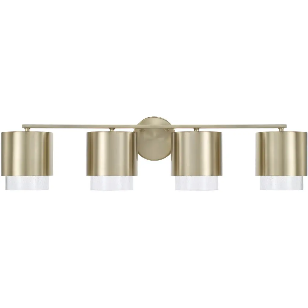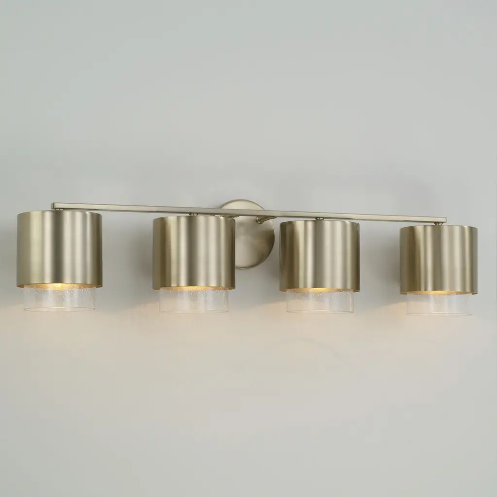 Contemporary forms meet illuminated elegance. The Weller 4-Light Vanity combines sleek, cylindrical silhouettes with seeded glass to cast a unique powder room glow. The Matte Brass finish brings a hint of warmth and subtle shine.