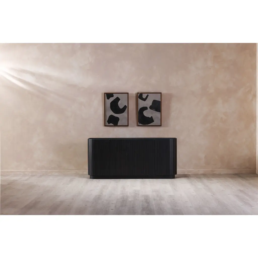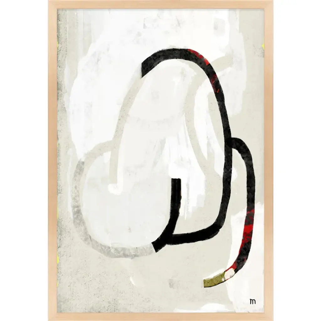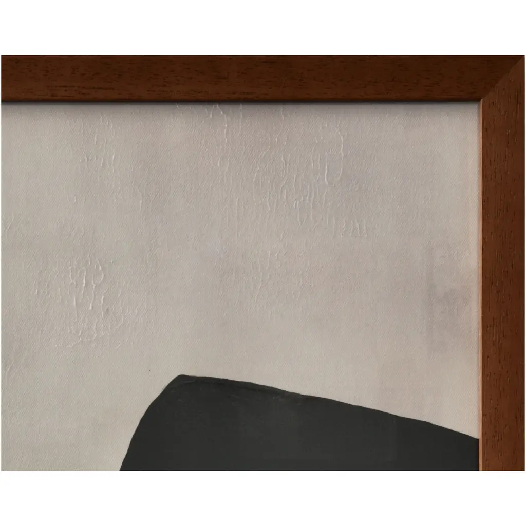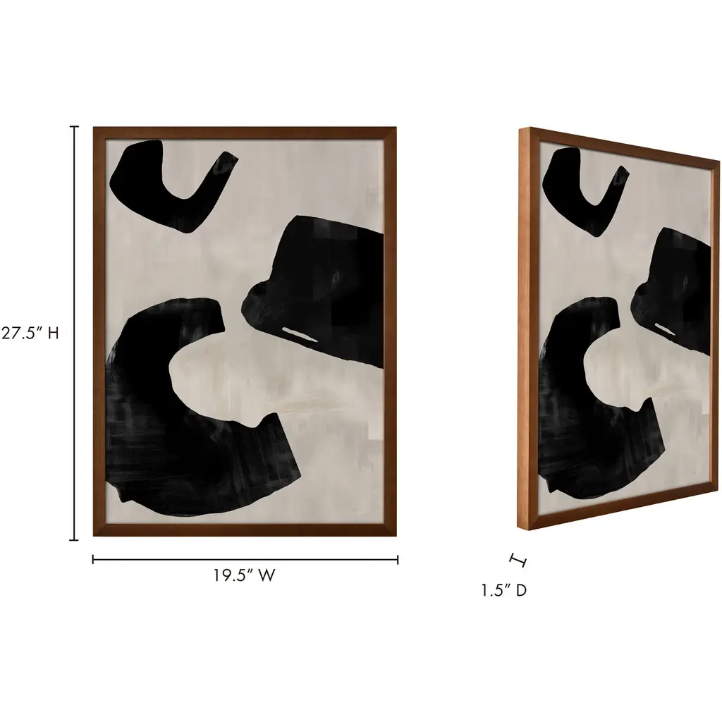 The Wells framed painting features black shapes made focal against a warm grey backdrop. Curved shapes add playfulness to this graphic abstract piece. The warm brown finish of the solid pine frame highlights the presentation with a vintage feel.