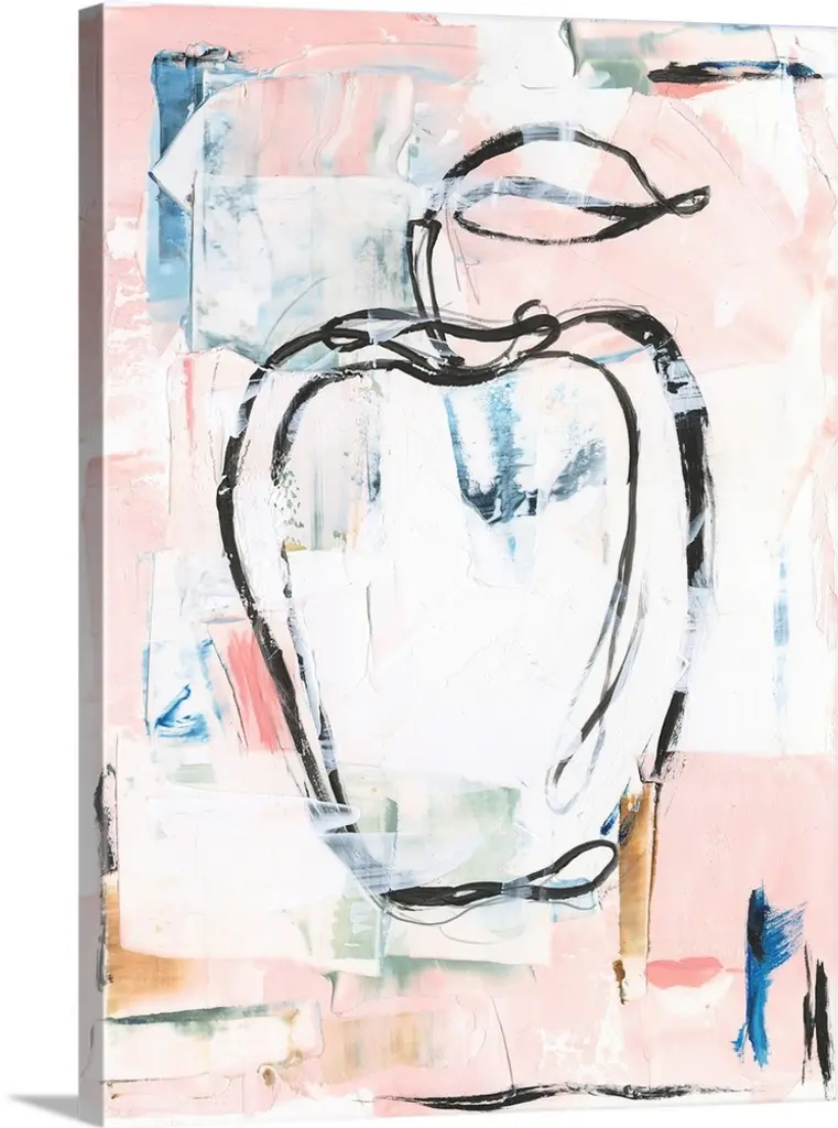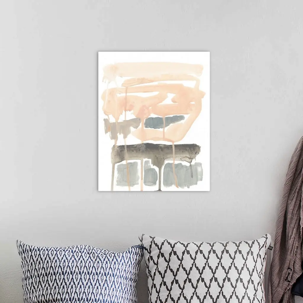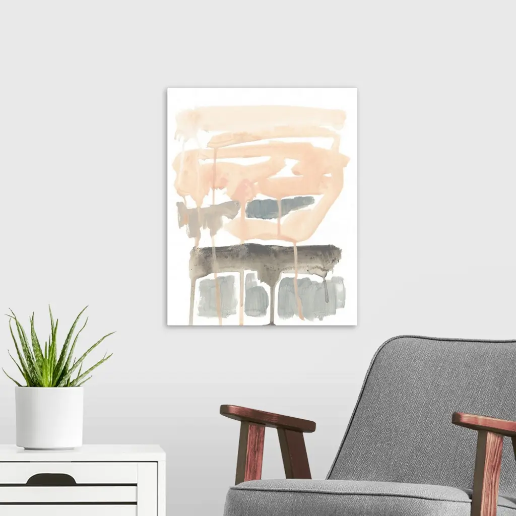 Contemporary abstract painting of soft pink and gray brush strokes and paint drips.