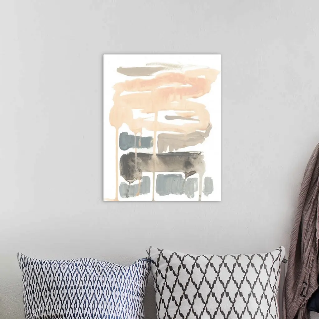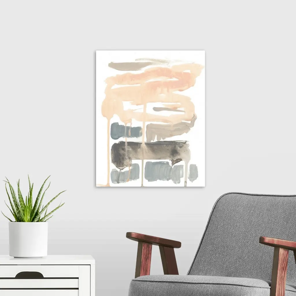 Contemporary abstract painting of soft pink and gray brush strokes and paint drips.