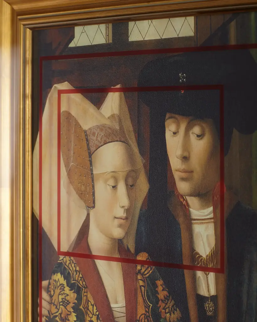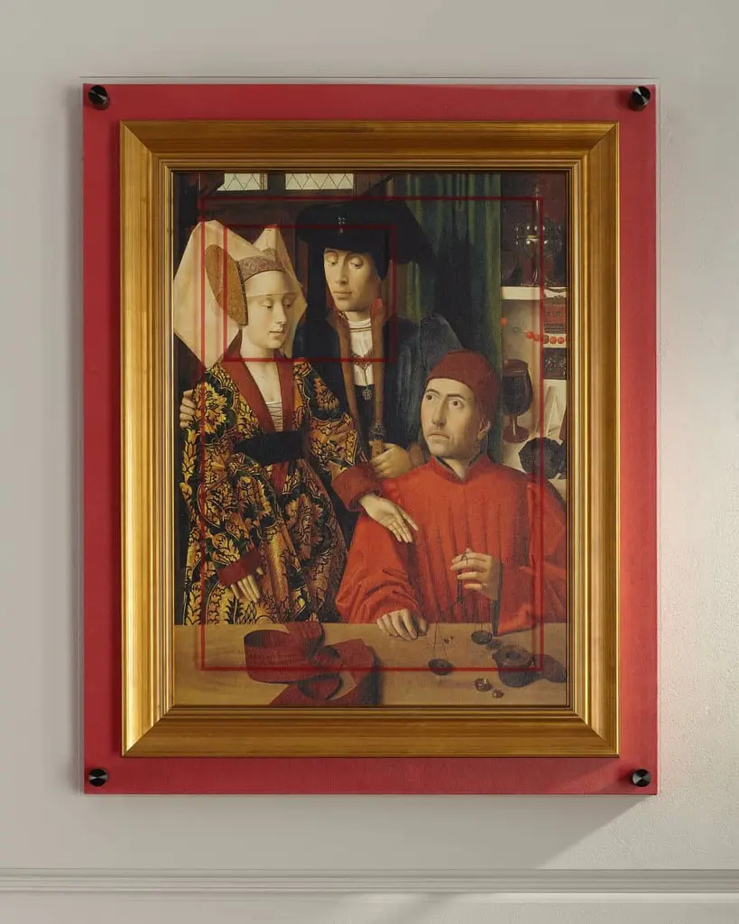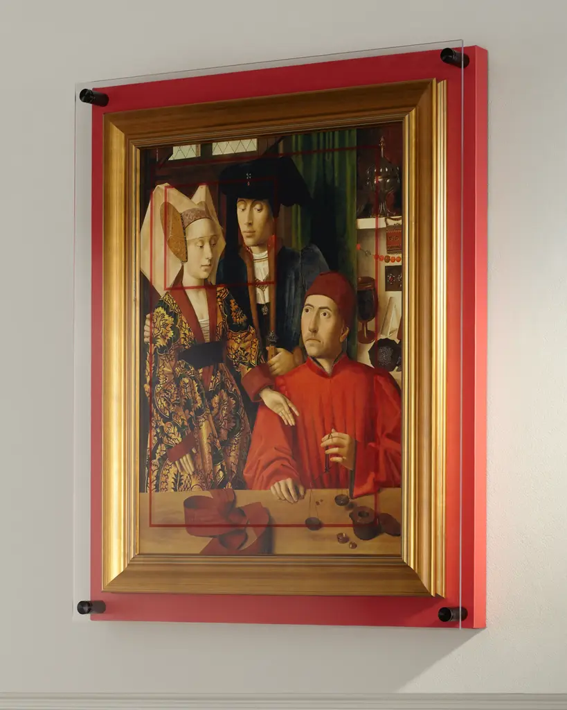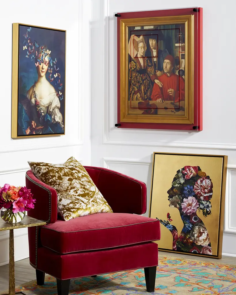 A traditional masterpiece is given an avant-garde update in this unique layered artwork. The construction features a canvas print of Renaissance figures, framed in an antique gold frame, mounted to a wood panel wrapped in red canvas. The finishing touch of the art is a floated, clear acrylic panel, printed with lines of red to highlight key focal points in the imagery. This artwork is perfect for an art collector who is interested in a contemporized twist. Handcrafted of wood, canvas, hardboard, and acrylic. Approx. 31"W x 1.8"D x 39"T. D-rings included for hanging. Wipe with soft cloth. Made in the USA of imported materials. Boxed weight, approximately 30 lbs. undefined