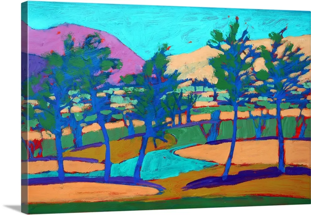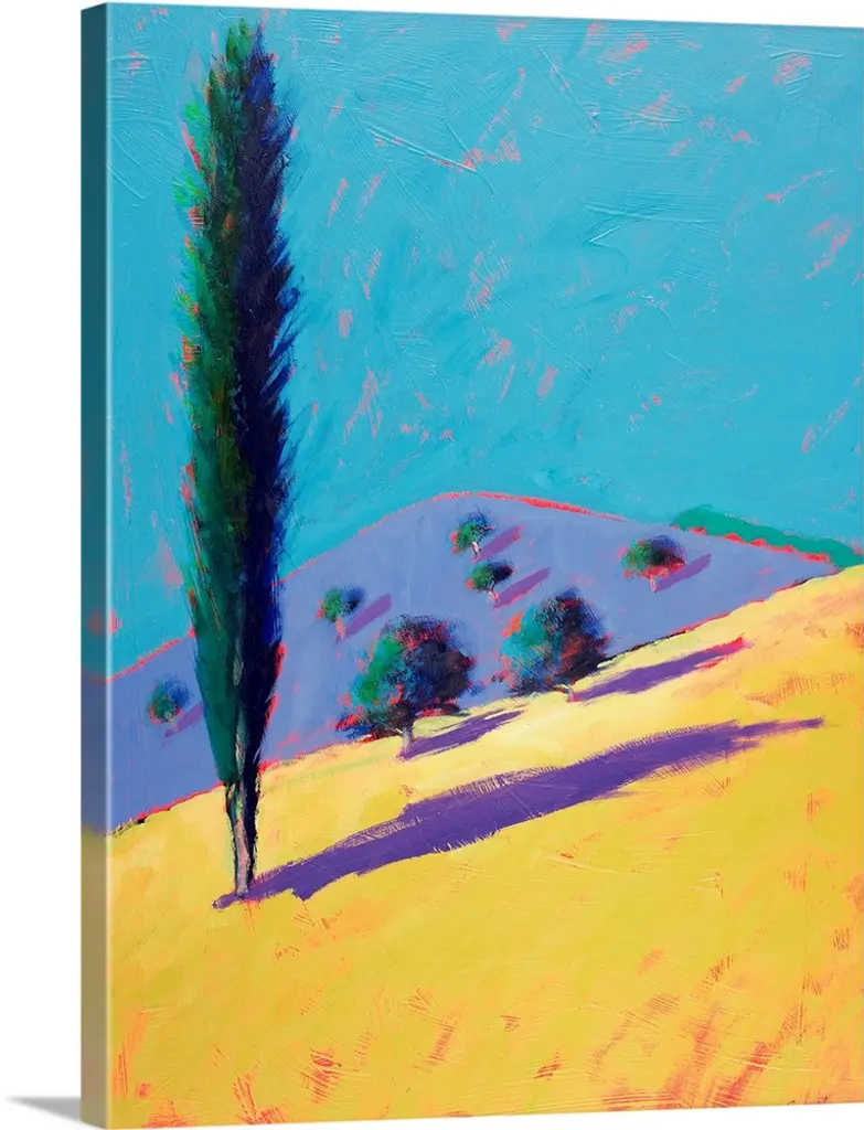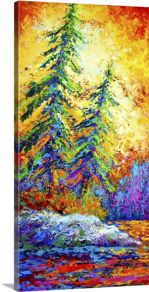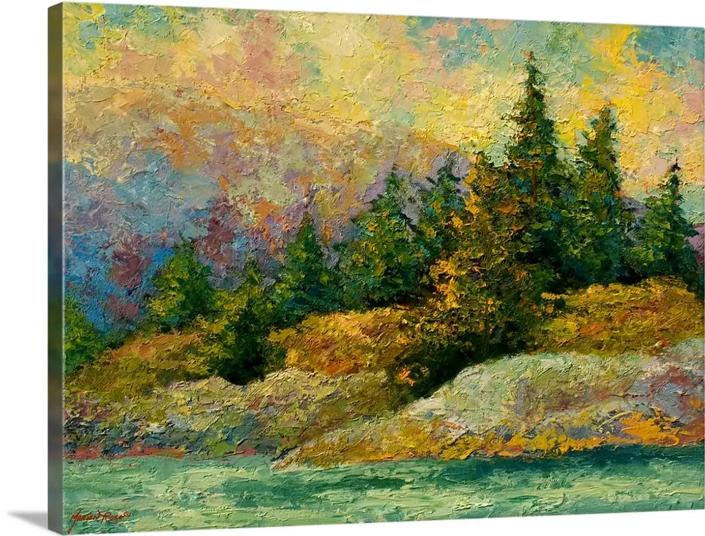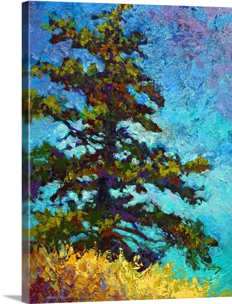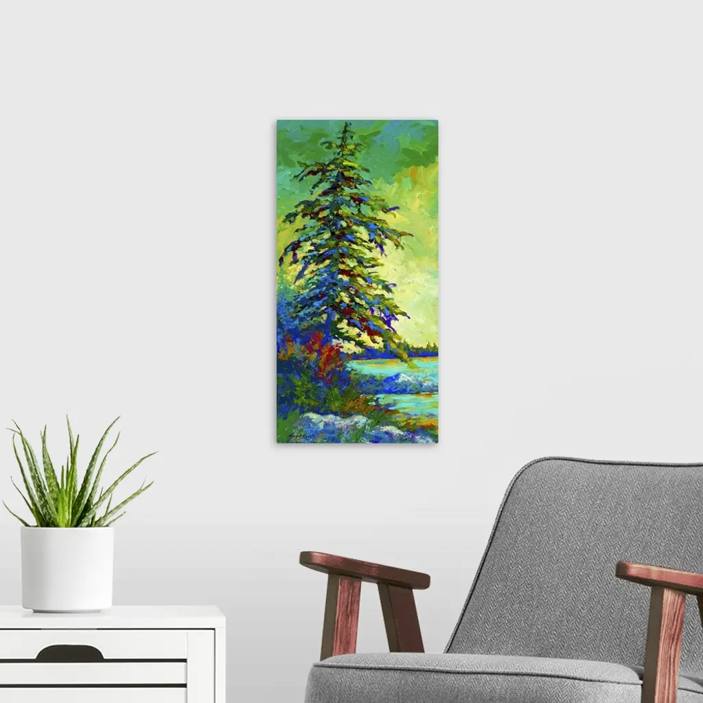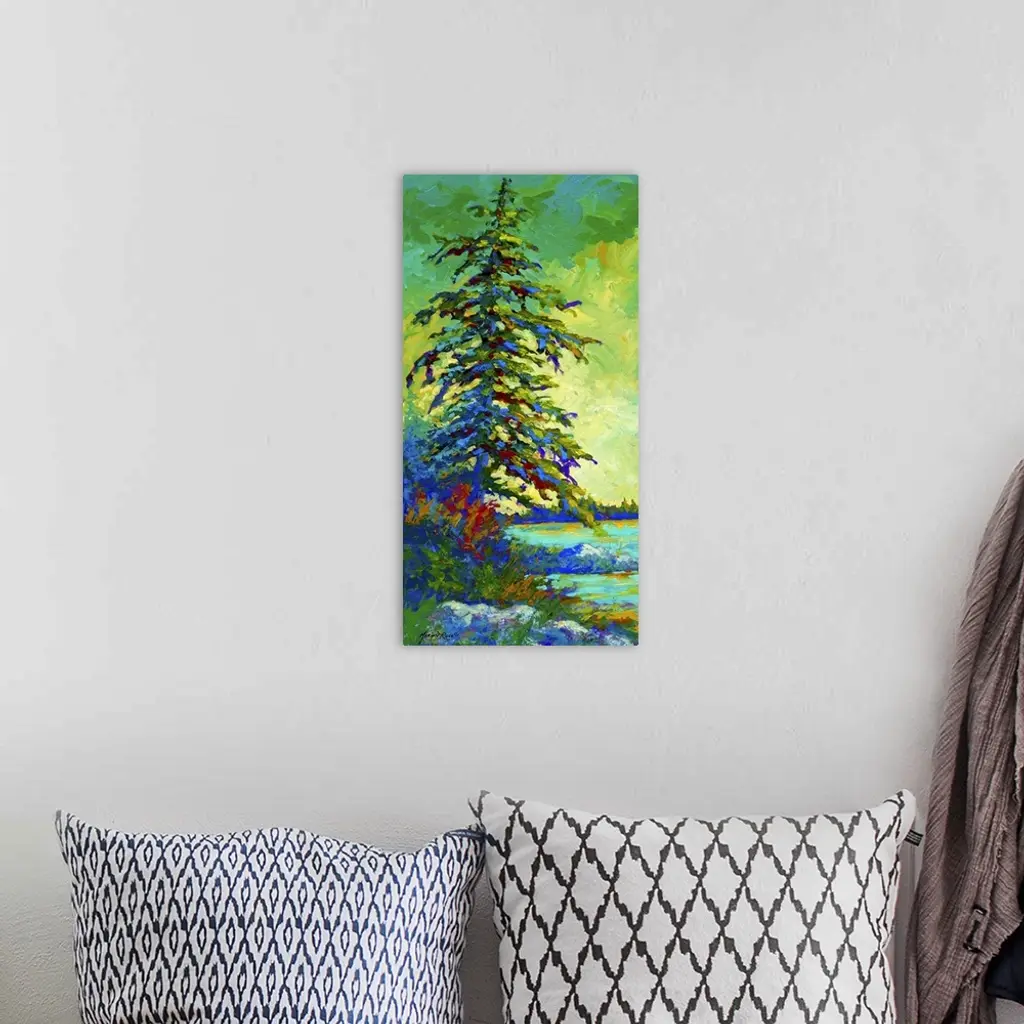 Tall painting on canvas of a tree beside the water made up of brush strokes.