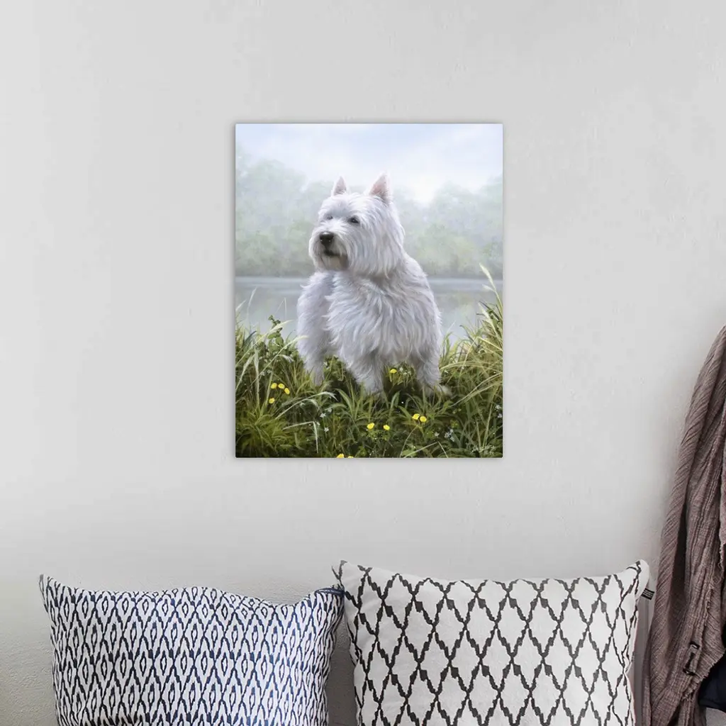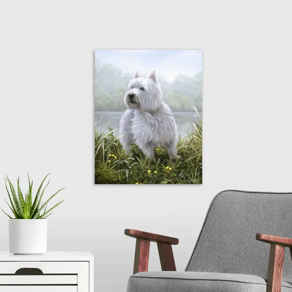 Contemporary painting of a Westie sitting in a field of tall grass.