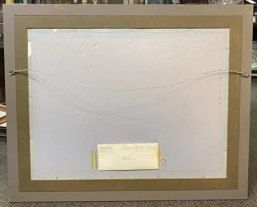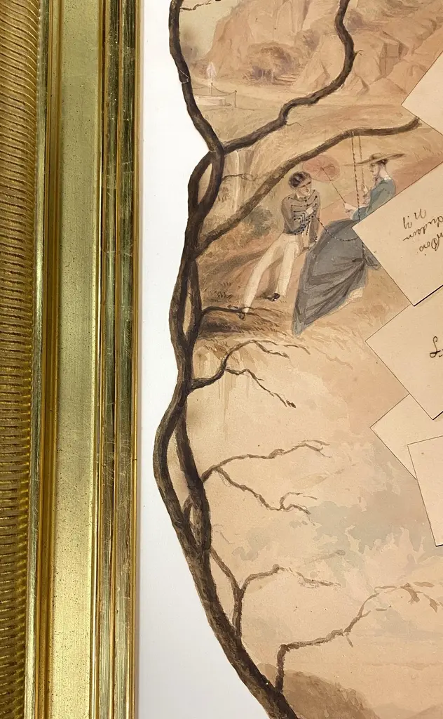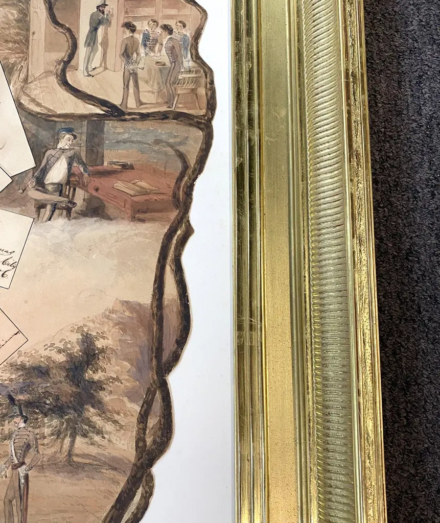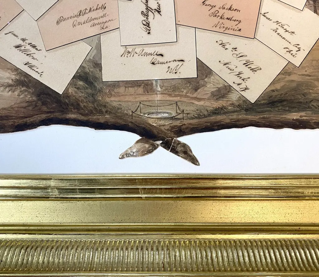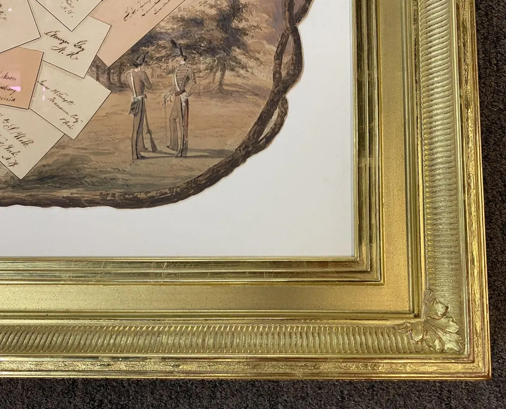 A nicely detailed trompe l’oeil watercolor on paper of a collage of autographs and scenes from the graduating class of the US Military Academy at West Point, 1855, attributed to Francis Laurens Vinton (1835-1879). Vinton was a cadet at the academy and a close friend of artist James McNeill Whistler, who was also a cadet and peer at that time. Watercolor on paper, mounted under glass and housed in a molded giltwood frame.Provenance:General Alexander Stewart Webb.Descended to Webb's granddaughter, Anna Remsen Alexandre (1895-1984).Sold from her estate, "The Strawberry House" / Calvin Burnham House, Lenox, Massachusetts, Douglass Auctions, South Deerfield, Massachusetts, April 25, 1985, Lot #91, for $300.Elliot Sherman, Everett, Massachusetts.Ed Jerome, Old Bridge, New Jersey (who replaced the water-stained mat).Richard Blodgett ll, 1987.Notes:Drawing skills were critical training at West Point as soldiers would need to draw maps and sketch battlefield scenarios. Drafting was taught by Hudson River School painter Robert Walter Weir (1803-1889) and many of the cadets were prolific sketch artists, often as a comedic outlet.It was previously believed the vignettes were painted by classmate James Abbot Whistler, who entered the Academy in 1851. The images are similar to known drawings by Whistler done during his years at West Point, before he flunked out at the end of June 1854, about five months before this is believed to have been drawn. (Whistler's appeal to be reinstated was submitted to Jefferson Davis then forwarded to Lee, who denied it.)The attribution to Vinton comes from an entry in the diary of cadet Cyrus Ballou Comstock dated November 17, 1854: "Seven months from today and our courses here closes-we were talking of it tonight. Webb has cut a sheet of drawing paper into cards to receive the autographs of one class, and Vinton painted a border consisting of various scenes around the Point and in Cadet life. A view of camp up the river, old Cog, […] his likeness is perfect. It is the best thing I have seen in a long time". Comstock himself went on to be an important leader during the Civil War and was an aide to President Grant, appointed to oversee the Lincoln assassination trial. "Old Cog" refers to Lee, who referred to West Point as the "Snake Pit".Vinton graduated from West Point with the Class of 1856 as the required course of study at West Point was changed from four years to five years in August 1854. He continued studying mine engineering in Paris, graduating from the Ecole de Mines in 1860. Upon returning to New York he taught mechanical drawing at Cooper Union. During the Civil War, he rose through the ranks to brigadier general but was badly wounded at the Battle of Gettysburg. After the war he became a professor at the newly founded Columbia College School of Mines. He relocated to Colorado in 1877.The similar style exhibited in Whistler's and Vinton's work shows the influence of the classmates' drawing teacher, Robert W. Weir. Indeed, a Vinton sketch at the Walters Art Gallery was first attributed to Whistler but later was changed to Vinton.In an email, Whistler scholar Margaret MacDonald states she does not believe the vignettes in this work could be by Whistler because he was no longer at West Point by Comstock's journal account of November 17, 1854.The work was owned by General Alexander Stewart Webb (1835-1911) and descended through his heirs. Webb graduated from West Point with the Class of 1855 and became a career U.S. Army officer. He served as a Union general during the Civil War and was awarded the Medal of Honor in 1891 for gallantry at the Battle of Gettysburg. During the battle, Webb's brigade manned a portion of Cemetery Ridge and brilliantly succeeded in destroying an attacking Confederate brigade. The following day, during Pickett's Charge, Webb's Pennsylvanian's were situated in the famous "copse of trees" and bore the full fury of the surging forces. More than 450 of Webb's men were killed or wounded defending the "high water mark". Webb was among those wounded at Gettysburg and then later received a debilitating wound at Spotsylvania in 1864.He remained in the army until 1870 when he was discharged at his own request. In his later years Webb served as president of New York City College. A statue of him still stands at Gettysburg.Of note, Webb created a West Point Class of 1854 album, which included similarly scattered autographed cards, a drawing of Trophy Point signed "Merrill" and a topography map signed "Webb". Webb had many drawings and sketches by Whistler given to him during their time together at the Academy.Minor conservation was done in the 1990's - see document attached on verso. Please contact us directly for a full condition report before purchasing.Dimensions: Watercolor: Approximately 22 in H x 29 in W, actual; 30.25 in H x 37.75 in W x 2.25 in D. Ref: 8