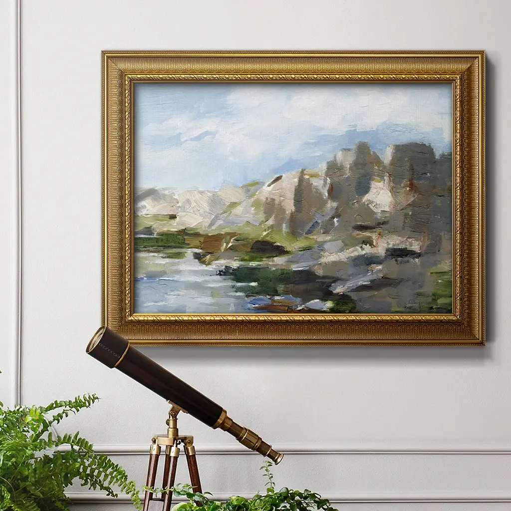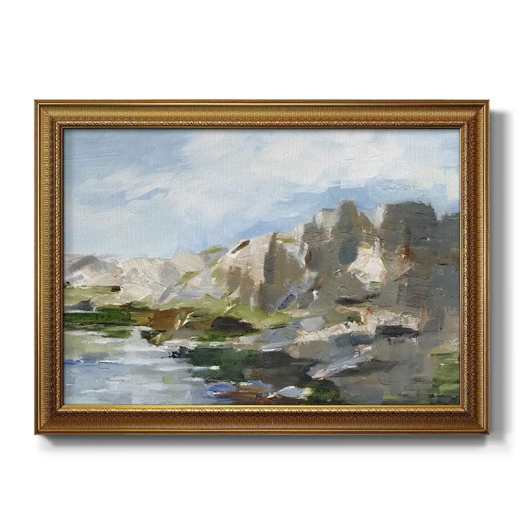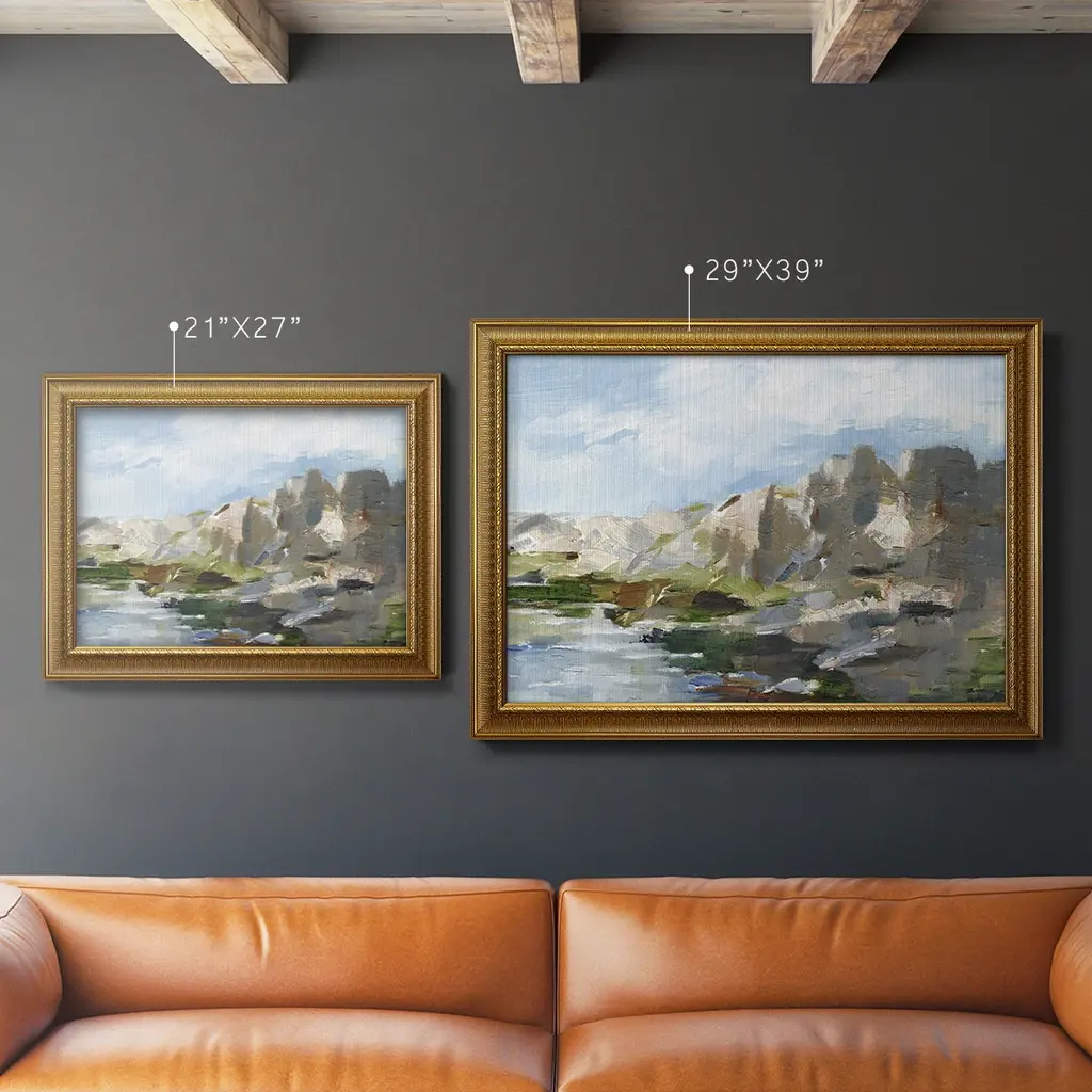 Western Cliffs II Premium Framed Canvas- Ready to Hang A Premium Framed Canvas created to last. Framed in distressed wood and available in an array of sizes and colors Featuring a beveled a solid wood stretcher bar, each piece comes ready to hand 3 SIZES AVAILABLE 16''X20'' - Overall Size 18'X27'' - Overall Size 24''x36'' - Overall Size Each piece is made to order. Each piece comes with hanging hardware. Made in the USA Ready to Hang Giclee Paper Print Acrylic Glass Beveled Matt Board