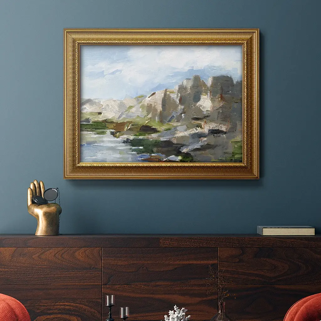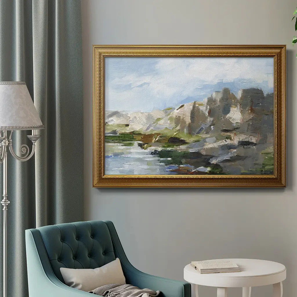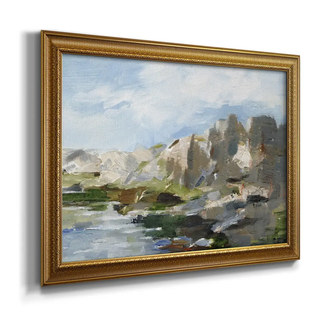 Western Cliffs II Premium Framed Canvas- Ready to Hang A Premium Framed Canvas created to last. Framed in distressed wood and available in an array of sizes and colors Featuring a beveled a solid wood stretcher bar, each piece comes ready to hand 3 SIZES AVAILABLE 16''X20'' - Overall Size 18'X27'' - Overall Size 24''x36'' - Overall Size Each piece is made to order. Each piece comes with hanging hardware. Made in the USA Ready to Hang Giclee Paper Print Acrylic Glass Beveled Matt Board