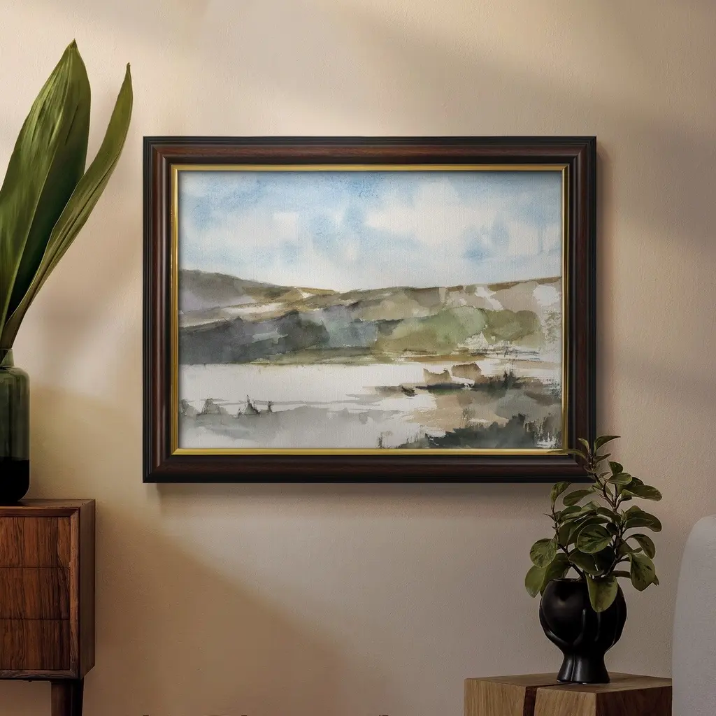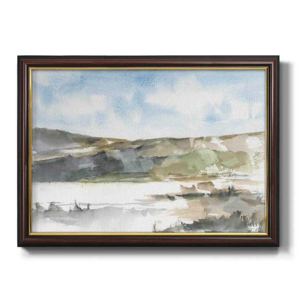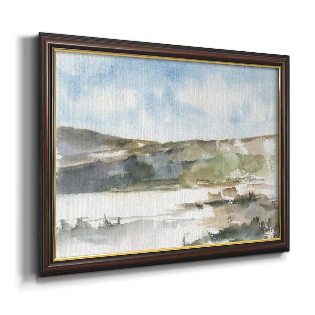 Western Lake Study II Premium Framed Canvas- Ready to Hang A Premium Framed Canvas created to last. Framed in distressed wood and available in an array of sizes and colors Featuring a beveled a solid wood stretcher bar, each piece comes ready to hand 3 SIZES AVAILABLE 16''X20'' - Overall Size 18'X27'' - Overall Size 24''x36'' - Overall Size Each piece is made to order. Each piece comes with hanging hardware. Made in the USA Ready to Hang Giclee Paper Print Acrylic Glass Beveled Matt Board