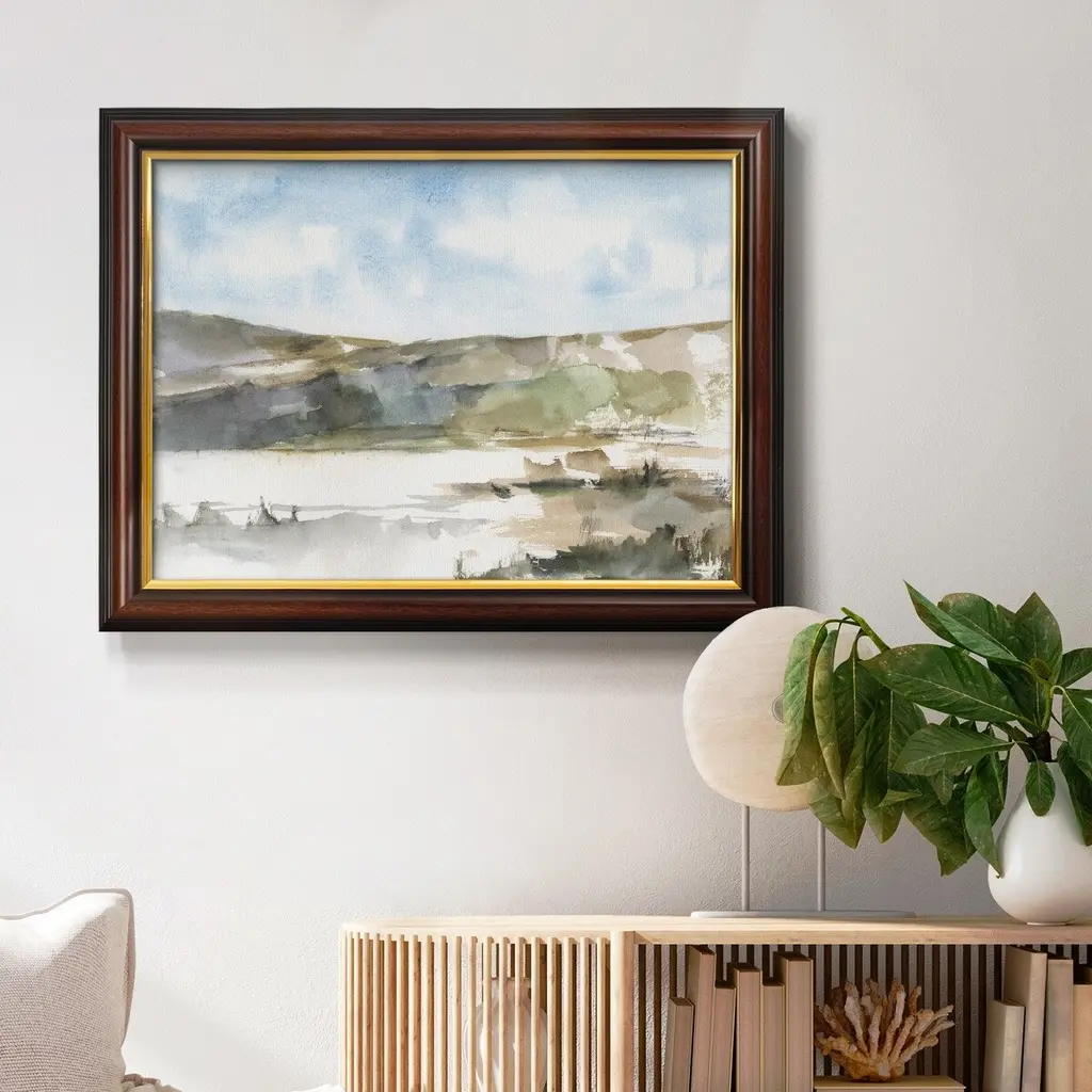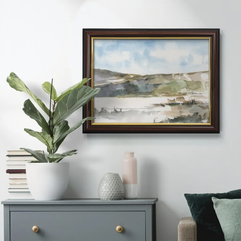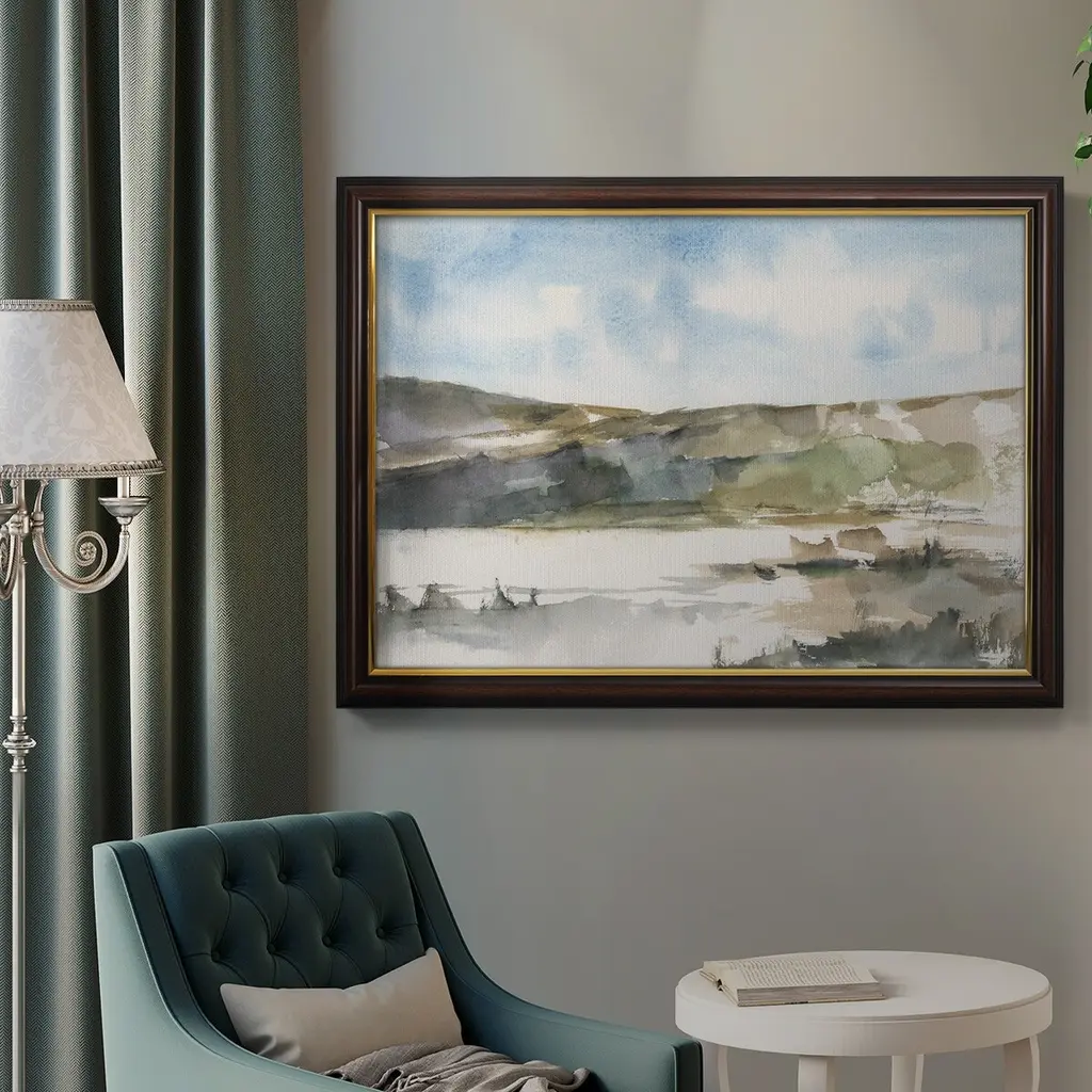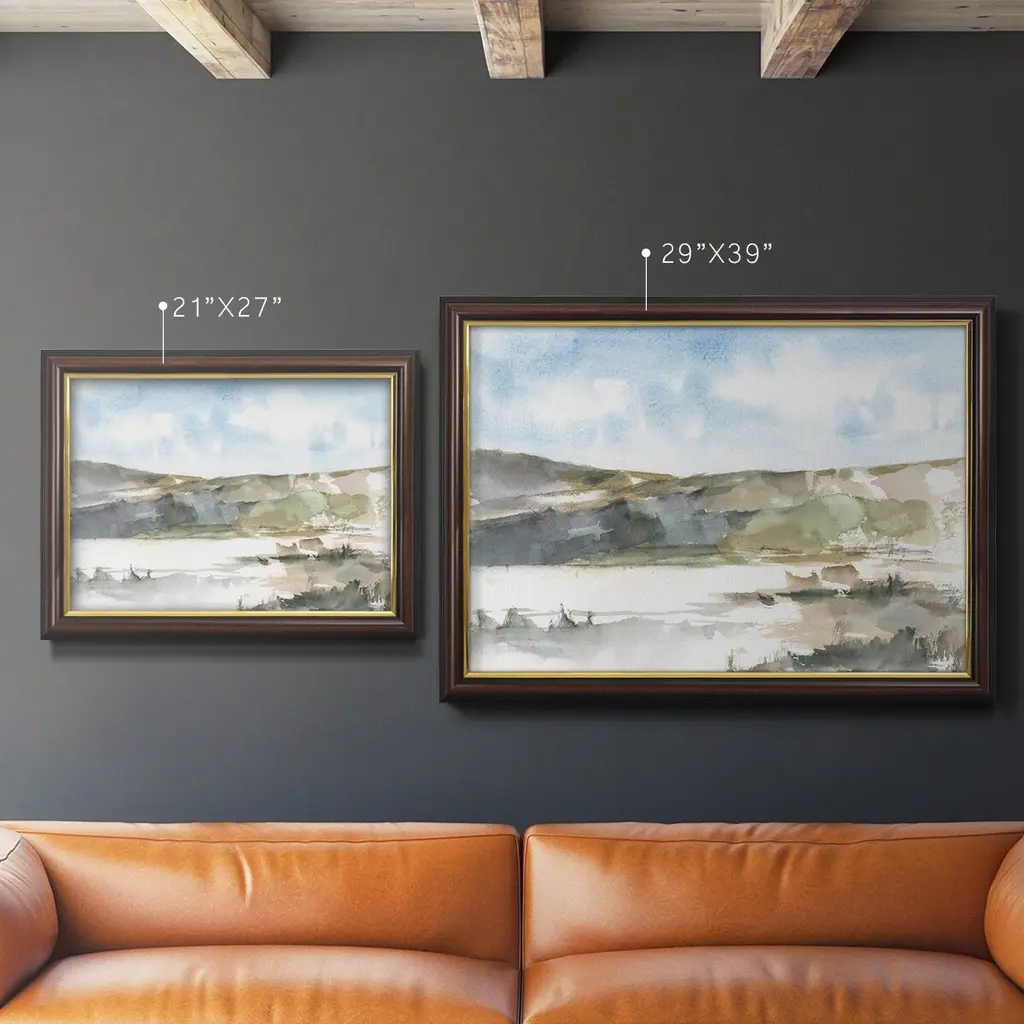 Western Lake Study II Premium Framed Canvas- Ready to Hang A Premium Framed Canvas created to last. Framed in distressed wood and available in an array of sizes and colors Featuring a beveled a solid wood stretcher bar, each piece comes ready to hand 3 SIZES AVAILABLE 16''X20'' - Overall Size 18'X27'' - Overall Size 24''x36'' - Overall Size Each piece is made to order. Each piece comes with hanging hardware. Made in the USA Ready to Hang Giclee Paper Print Acrylic Glass Beveled Matt Board