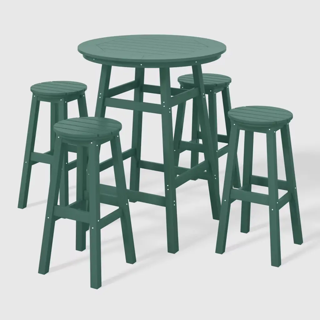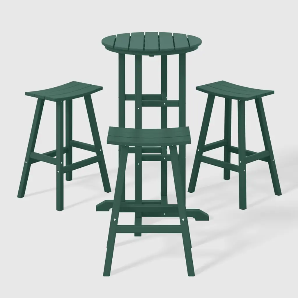 Elevate your outdoor haven with our exclusive patio furniture set—a refined ensemble featuring a distinguished 37" counter-height bistro bar table and three exquisite 24" counter-height bar stools, seamlessly blending style and opulent comfort. Immerse yourself in a palette of alluring, fade-resistant colors meticulously crafted from resilient HDPE material. This enchanting material not only boasts UV resistance but acts as a shield against the relentless sun, ensuring enduring magnificence. Bid farewell to concerns about splintering, cracking, chipping, or peeling—our HDPE stands as a testament to enduring luxury, requiring no painting, staining, or waterproofing. From the sumptuous saddle-style seats providing an extra layer of comfort to the robust leg design on the bistro table for added stability, this set is meticulously designed to elevate your outdoor experience. Let us redefine your outdoor patio—a space where family and furniture seamlessly unite in absolute splendor!While we strive to accurately represent product colors, please be aware that actual colors may vary slightly due to individual screen settings and lighting conditions. FeaturesSet Includes: (1) One Counter Height Bar Table, (3) Three 24" Counter High Bar StoolsBar stool dimensions: 10" D x 17" W x 24" HConstructed from durable HDPE material and designed to be stable and sturdyWeather resistant to protect against the harsh outdoor elementsFade and UV resistant to protect against the sunStainless steel hardware24" Round Table TopDetails:Product Type: Patio Bar Dining SetsWhat's Included: (3) Counter Stool; (1) Counter TableCounter StoolDimensions: 19" W x 15.5" D x 24" HWeight: 14 lbs.Seat Width: 17"Seat Depth: 10.5"Seat Height: 24"Weight Capacity: 330 lbs.Counter TableDimensions: 27" W x 27" D x 37" HWeight: 27 lbs.Seat Width: 17"Seat Depth: 10.5"Seat Height: 24"Weight Capacity: 300 lbs.