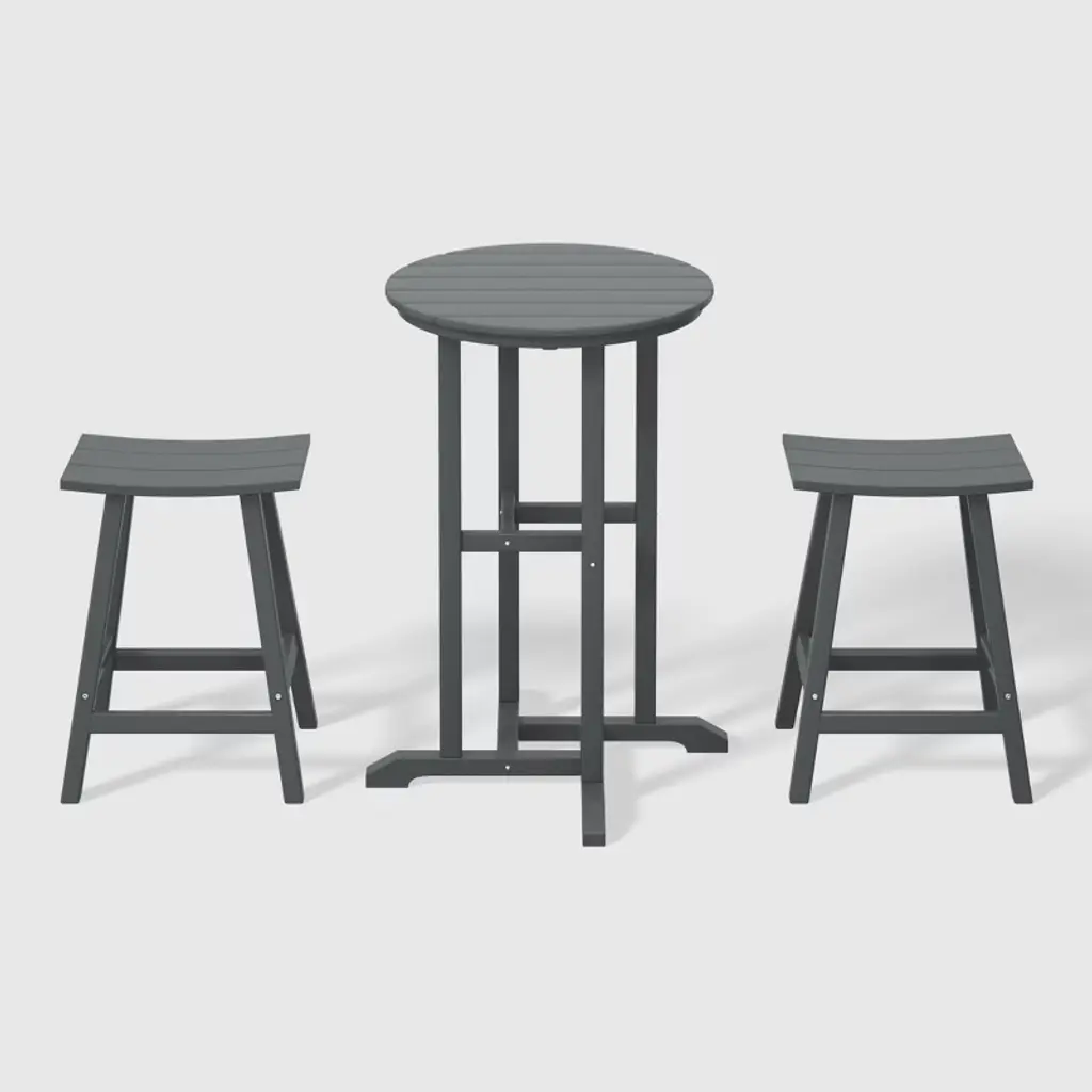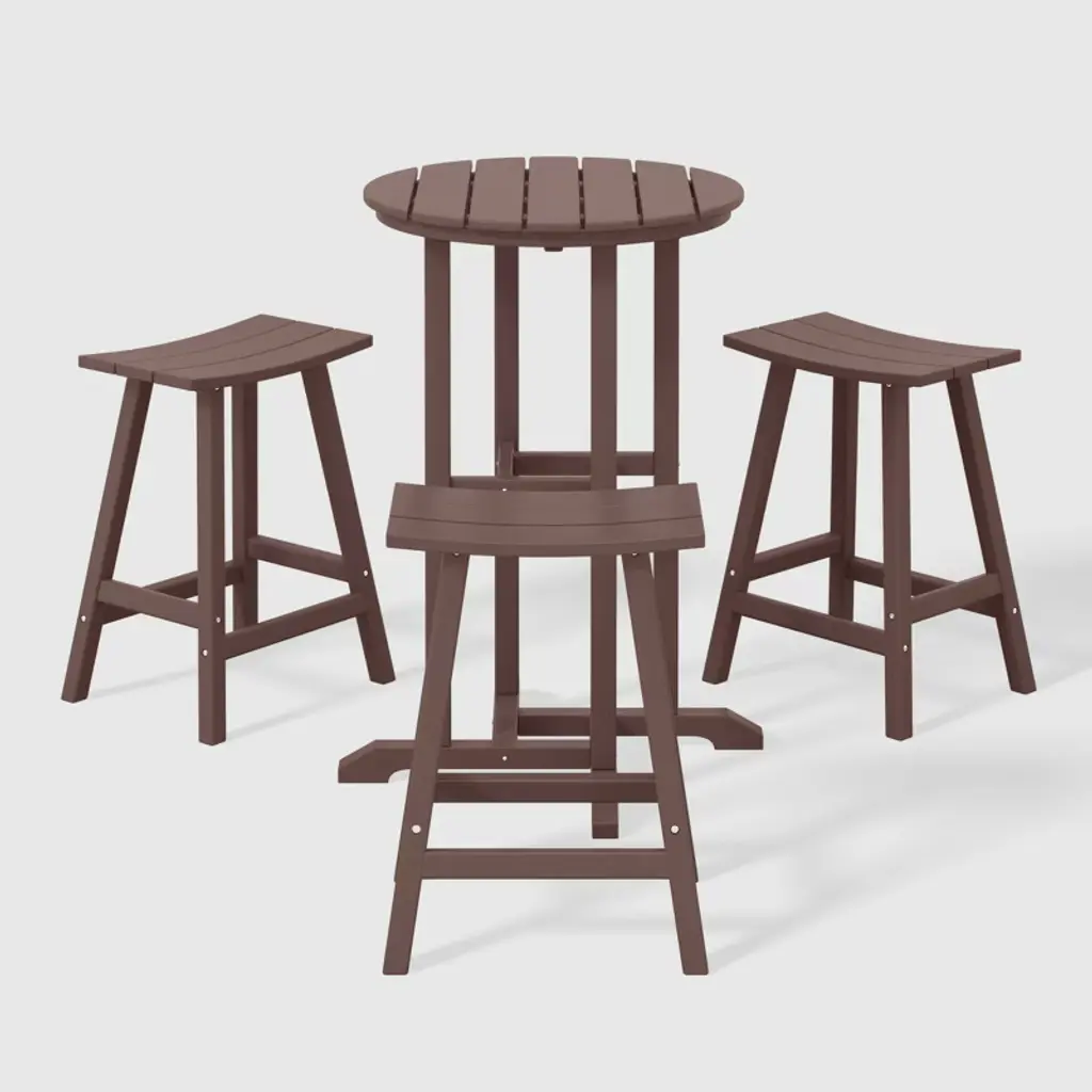 Elevate your outdoor haven with our exclusive patio furniture set—a refined ensemble featuring a distinguished 37" counter-height bistro bar table and three exquisite 24" counter-height bar stools, seamlessly blending style and opulent comfort. Immerse yourself in a palette of alluring, fade-resistant colors meticulously crafted from resilient HDPE material. This enchanting material not only boasts UV resistance but acts as a shield against the relentless sun, ensuring enduring magnificence. Bid farewell to concerns about splintering, cracking, chipping, or peeling—our HDPE stands as a testament to enduring luxury, requiring no painting, staining, or waterproofing. From the sumptuous saddle-style seats providing an extra layer of comfort to the robust leg design on the bistro table for added stability, this set is meticulously designed to elevate your outdoor experience. Let us redefine your outdoor patio—a space where family and furniture seamlessly unite in absolute splendor!While we strive to accurately represent product colors, please be aware that actual colors may vary slightly due to individual screen settings and lighting conditions. FeaturesSet Includes: (1) One Counter Height Bar Table, (3) Three 24" Counter High Bar StoolsBar stool dimensions: 10" D x 17" W x 24" HConstructed from durable HDPE material and designed to be stable and sturdyWeather resistant to protect against the harsh outdoor elementsFade and UV resistant to protect against the sunStainless steel hardware24" Round Table TopDetails:Product Type: Patio Bar Dining SetsWhat's Included: (3) Counter Stool; (1) Counter TableCounter StoolDimensions: 19" W x 15.5" D x 24" HWeight: 14 lbs.Seat Width: 17"Seat Depth: 10.5"Seat Height: 24"Weight Capacity: 330 lbs.Counter TableDimensions: 27" W x 27" D x 37" HWeight: 27 lbs.Seat Width: 17"Seat Depth: 10.5"Seat Height: 24"Weight Capacity: 300 lbs.