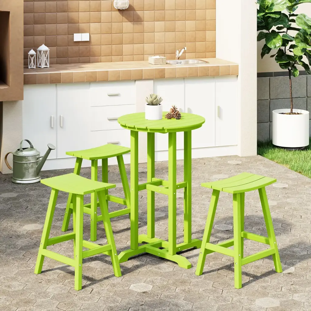 Elevate your outdoor haven with our exclusive patio furniture set—a refined ensemble featuring a distinguished 37" counter-height bistro bar table and three exquisite 24" counter-height bar stools, seamlessly blending style and opulent comfort. Immerse yourself in a palette of alluring, fade-resistant colors meticulously crafted from resilient HDPE material. This enchanting material not only boasts UV resistance but acts as a shield against the relentless sun, ensuring enduring magnificence. Bid farewell to concerns about splintering, cracking, chipping, or peeling—our HDPE stands as a testament to enduring luxury, requiring no painting, staining, or waterproofing. From the sumptuous saddle-style seats providing an extra layer of comfort to the robust leg design on the bistro table for added stability, this set is meticulously designed to elevate your outdoor experience. Let us redefine your outdoor patio—a space where family and furniture seamlessly unite in absolute splendor!While we strive to accurately represent product colors, please be aware that actual colors may vary slightly due to individual screen settings and lighting conditions. FeaturesSet Includes: (1) One Counter Height Bar Table, (3) Three 24" Counter High Bar StoolsBar stool dimensions: 10" D x 17" W x 24" HConstructed from durable HDPE material and designed to be stable and sturdyWeather resistant to protect against the harsh outdoor elementsFade and UV resistant to protect against the sunStainless steel hardware24" Round Table TopDetails:Product Type: Patio Bar Dining SetsWhat's Included: (3) Counter Stool; (1) Counter TableCounter StoolDimensions: 19" W x 15.5" D x 24" HWeight: 14 lbs.Seat Width: 17"Seat Depth: 10.5"Seat Height: 24"Weight Capacity: 330 lbs.Counter TableDimensions: 27" W x 27" D x 37" HWeight: 27 lbs.Seat Width: 17"Seat Depth: 10.5"Seat Height: 24"Weight Capacity: 300 lbs.