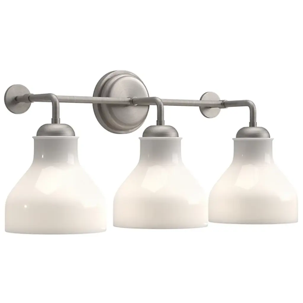 Lining up like a fresh delivery by the milkman on your doorstep. The Westlake Vanity Light from Alora Mood substitutes milk for sumptuous light with its filled to the brim, milk jug-inspired shades. Modern or contemporary spaces are a natural fit for this Parisian-styled design. It lines up over the top edge of the mirror with a group of low-profile circular shapes. The piece leans forward with a collection of angular lines, defined by their sophisticated finish. The glass shades below taper at the top and share an opaque color with the classic milk jug. A smooth glow goes spilling out the shades with a flattering warmth.
