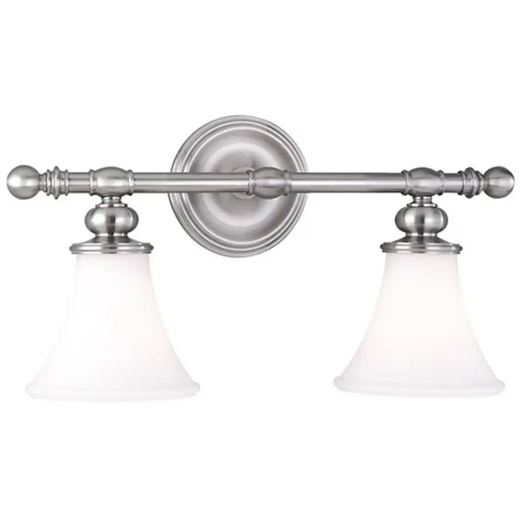 Instill that wow-factor in your next update. The Weston Vanity Light by Hudson Valley Lighting comes with mouthblown flared Matte Glass shades that are mounted on a simple yet impressive Metal bar and circular backplate. It holds classic appeal that fits in well with transitional to modern homes, and looks ideal when mounted above the vanity mirror in the bathroom. It diffuses light wonderfully to create a flattering illumination that's perfect for adding a luxurious spin to the bathroom. Complement furnishings and other wall decor with this illustrious addition to instantly improve the ambiance.