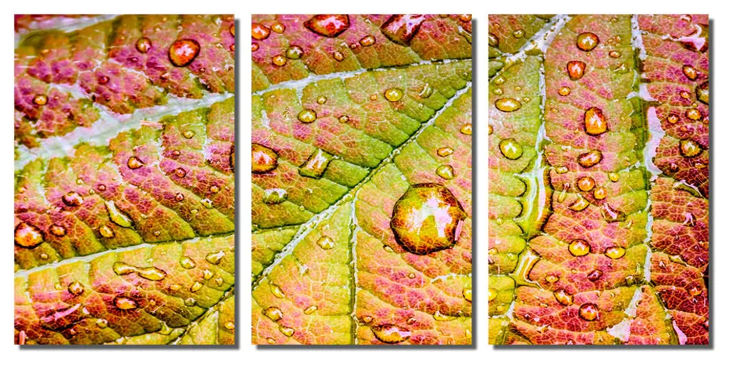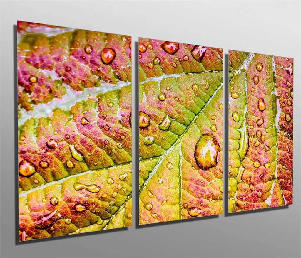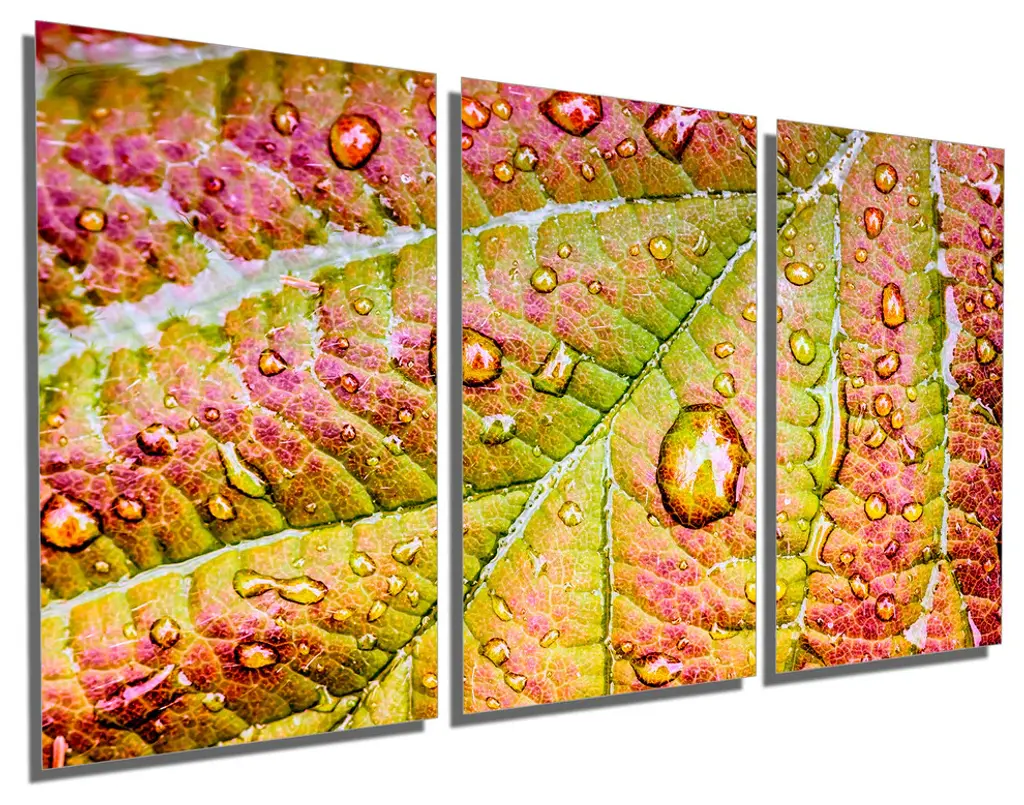 72"œ x 36"œ total size. Ready To Hang! (3 pieces - 24"œ x 36"œ each). 3 Panel Split (Triptych) Metal Print featuring a wet leaf with water droplets. Modern metal wall art for home or office wall decor & interior design. Printed on Luxurious, HD aluminum glossy metal panels. Multi panel art.. HD aluminum panels. Metal print wall art. Includes Shadow Wall Mount on the back.• Aluminum Metal Wall Art• Made in USA• Ready to hang - No assembly required• Shadow mount hardware on the back• 0.045"œ thick HD Aluminum Panels• Scratch resistant, glossy finish• Superb color clarity, luxurious prints• Epson printing process• For indoor or moisture rich environment use• Easy to clean. Gently wipe with microfiber cloth.