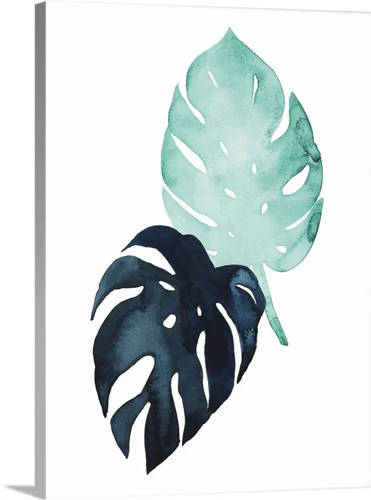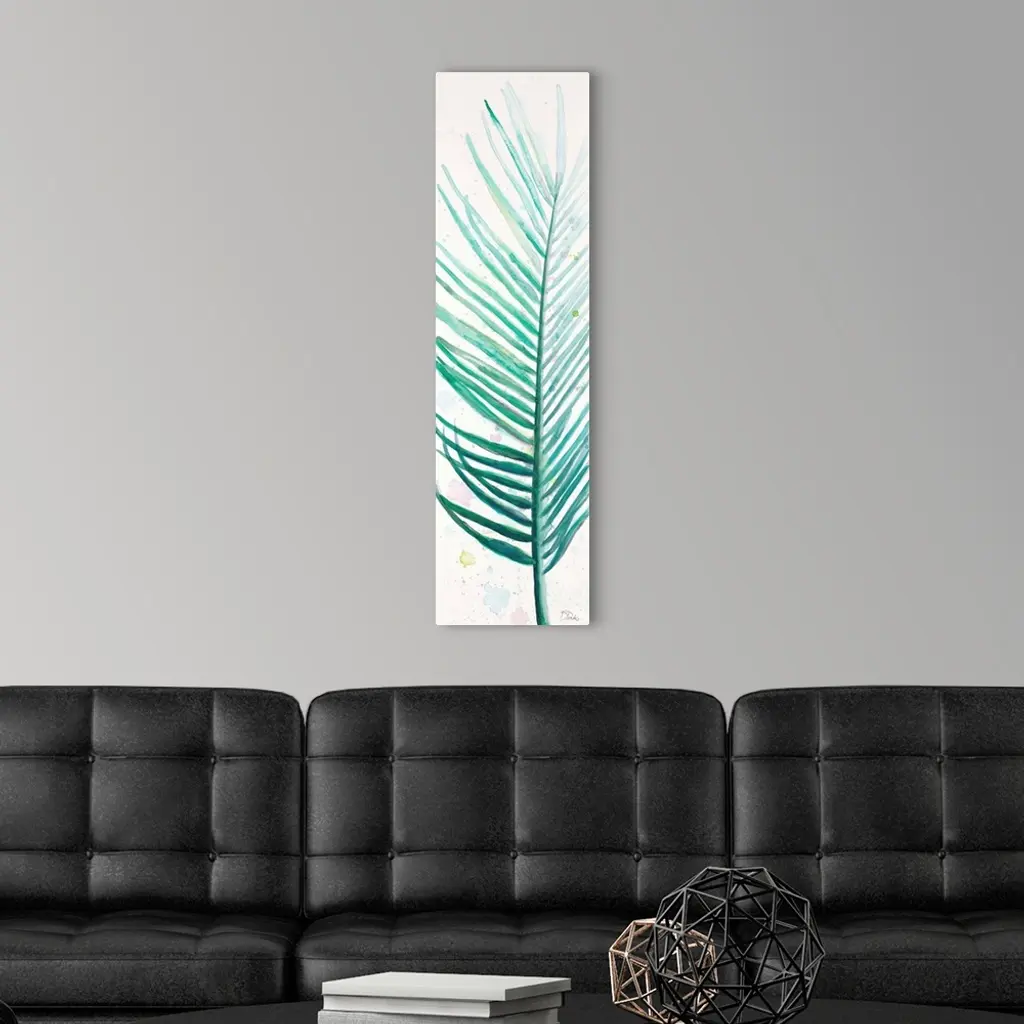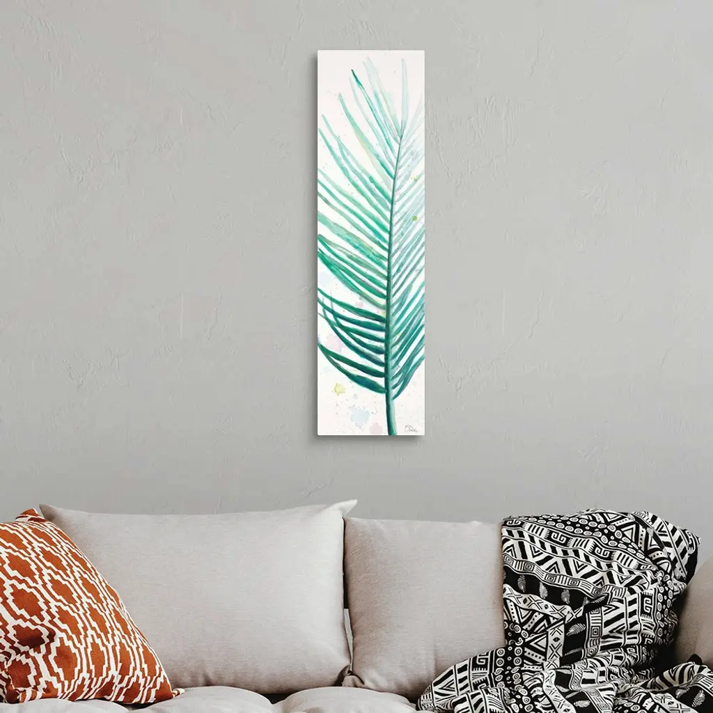 Tall watercolor painting of a green-blue palm leaf with light colorful paint spatter on the white background.