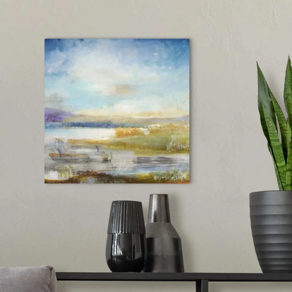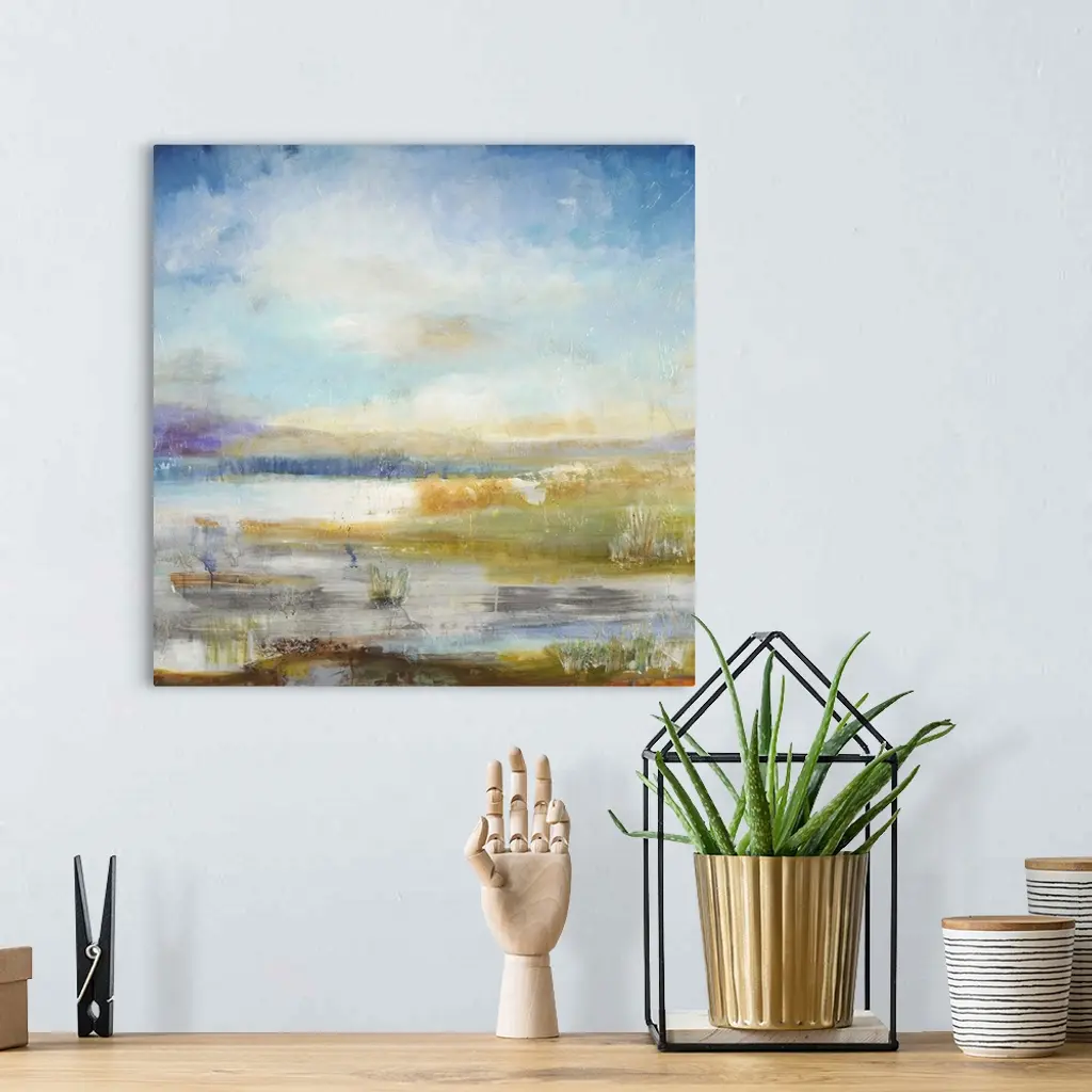 Contemporary landscape painting looking out over wetlands under a vibrant blue sky.
