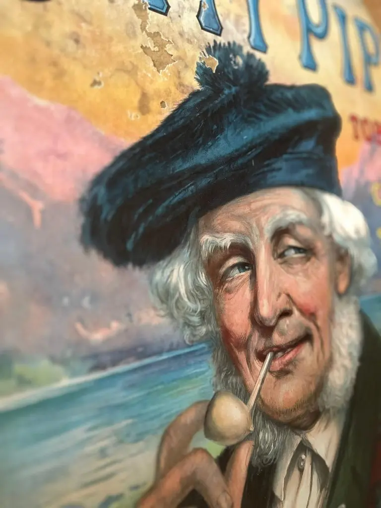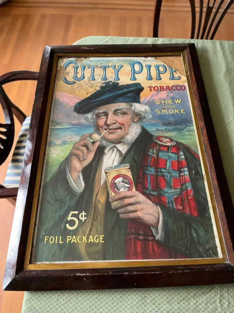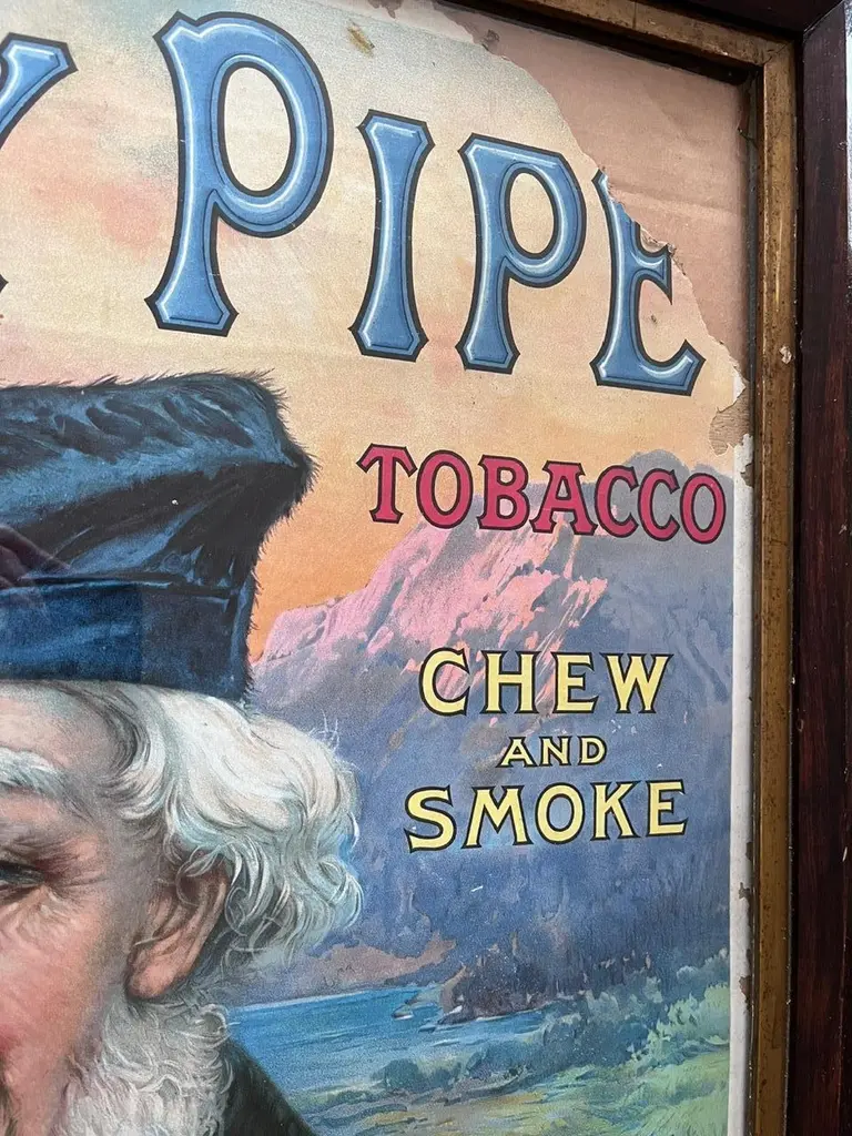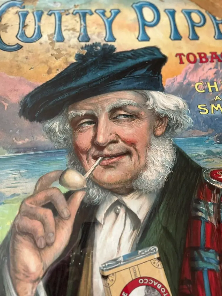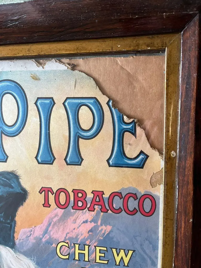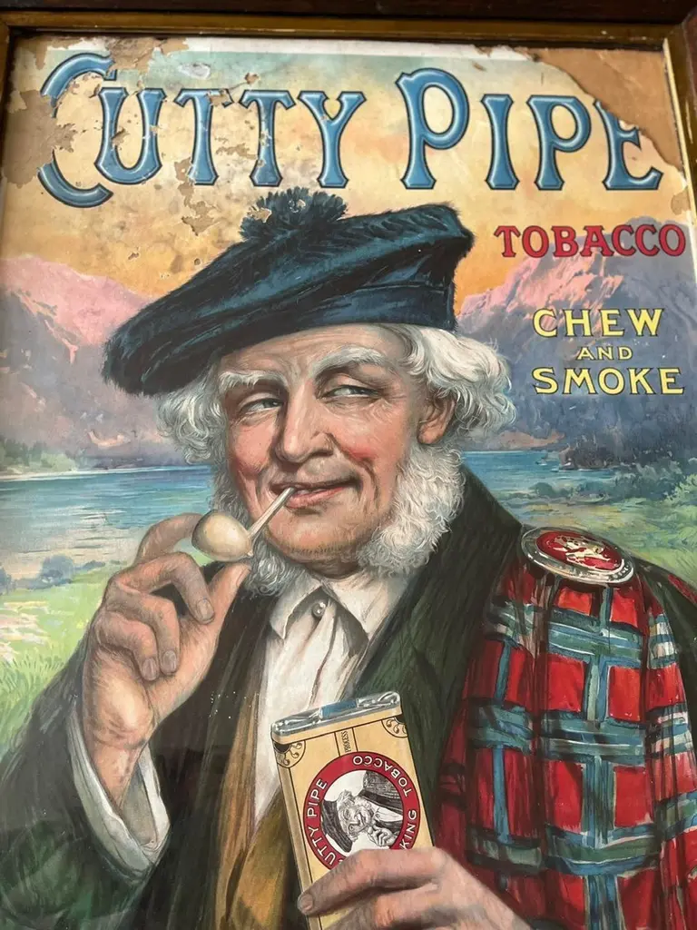 Rare 1930s Weyman’s Cutty Pipe Tobacco Advertising Lithograph – Scottish Highlands Scene, Bold Color, Distressed ConditionThis rare 1930s advertising lithograph for Weyman’s Cutty Pipe Tobacco is a striking visual tribute to Scottish heritage and early 20th-century commercial art. The print depicts a proud Scottish man in traditional Highland attire, complete with vibrant tartan plaid, smoking a pipe and holding a tin of Cutty’s Pipe Tobacco against the breathtaking backdrop of the Scottish Highlands.The most captivating element of this piece is its brilliant use of color—the lush greens of the landscape, the richly rendered skin tones, and the crisp detail in the plaid all contribute to a bold, eye-catching composition that exemplifies the vibrant style of 1930s lithographic advertising. This piece would have originally served as a promotional print, likely displayed in tobacconists or general stores, evoking both a romantic image of Scotland and a sense of brand pride.Though visually stunning, this original advertising print is in distressed condition. It shows signs of its age with paper brittleness, corner losses, tears, water warping, holes, and general wear. The frame, likely original or early, also shows its age with separation at the corners, a replaced cardboard backing affixed with duct tape, and a small chip in the glass at the upper right. Despite this, the lithograph retains remarkable visual impact and could greatly benefit from professional restoration by a reputable paper conservator.This is a hard-to-find piece of tobacco memorabilia and a wonderful example of Scottish cultural representation in early 20th-century commercial art. Whether left in its current state for a rustic, timeworn aesthetic or restored to its original brilliance, this print is a rare treasure for collectors of vintage advertising, Scottish memorabilia, or tobacco ephemera.Origin: USA, c. 1930sCondition: Distressed – see details above; suitable for restoration.
