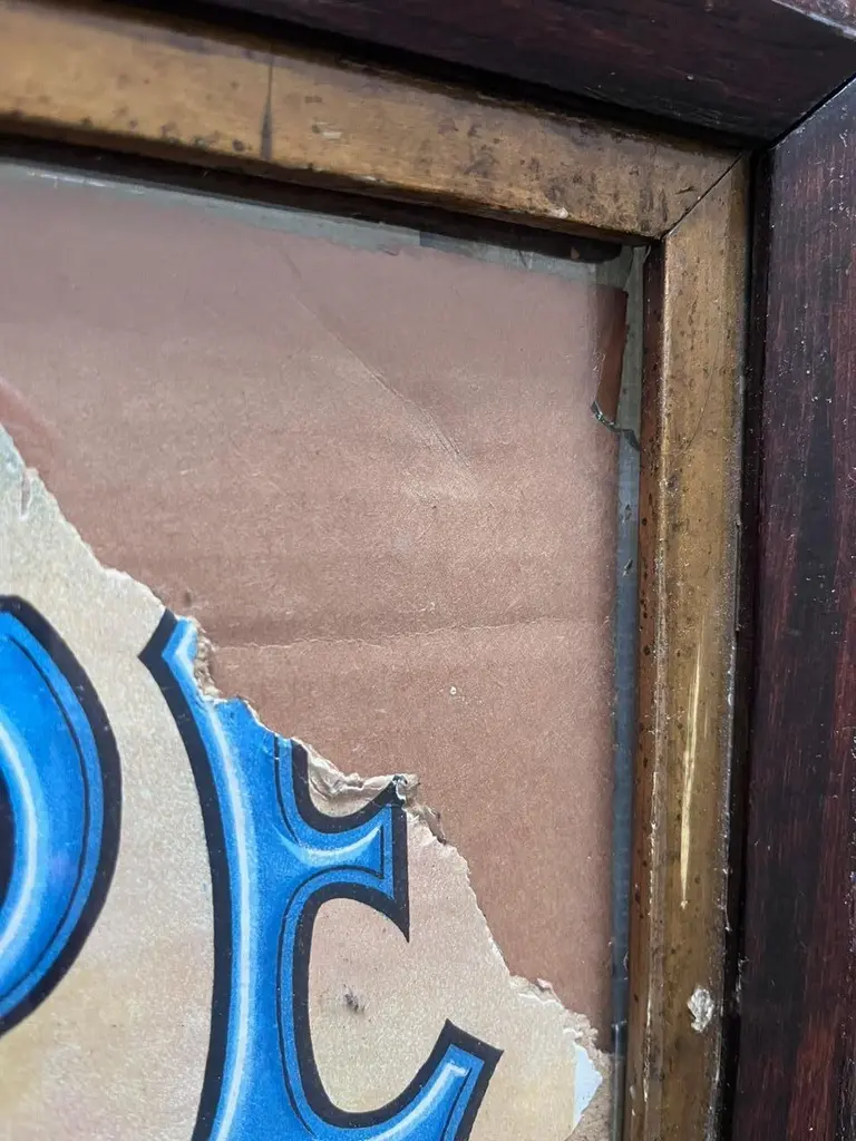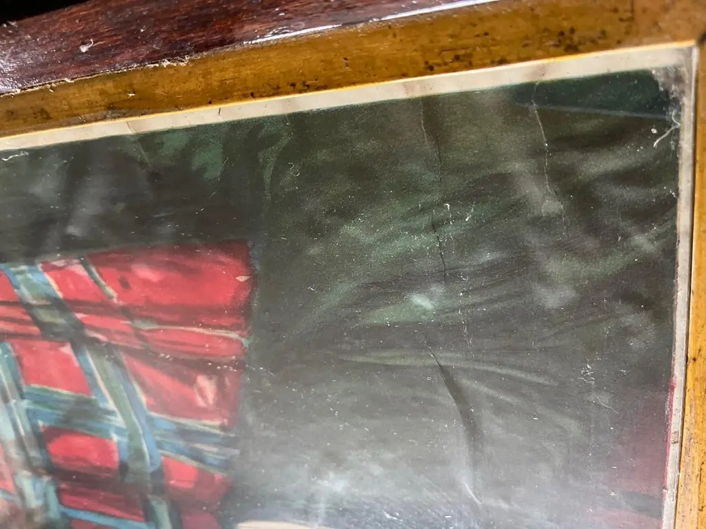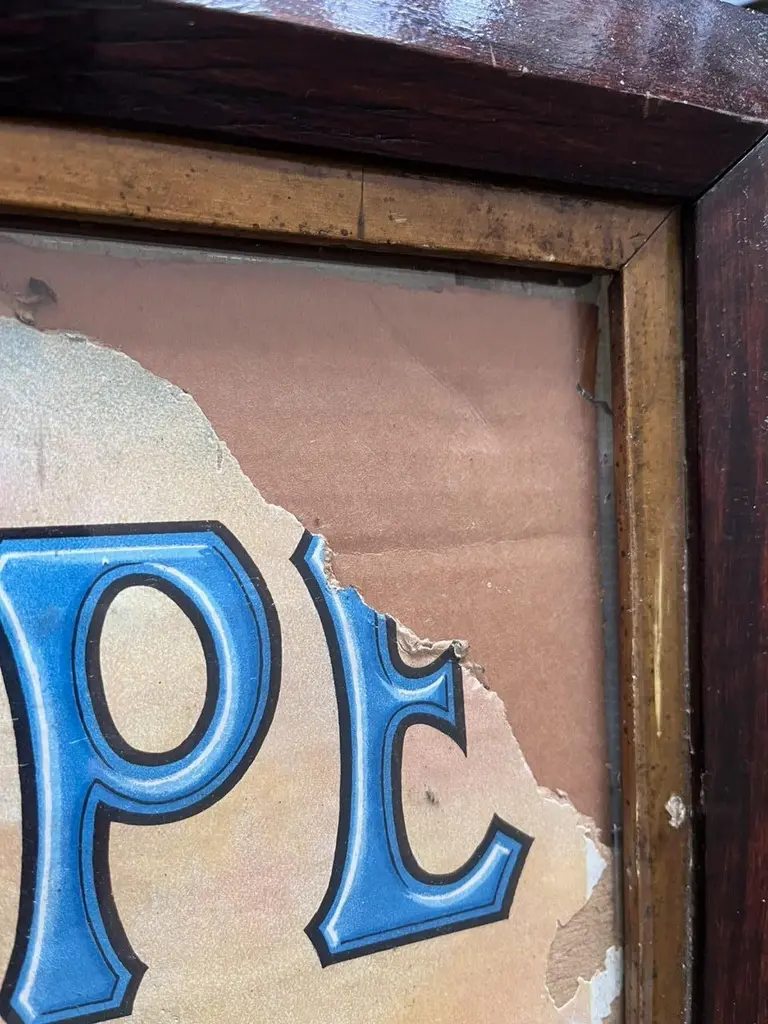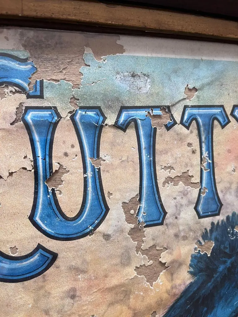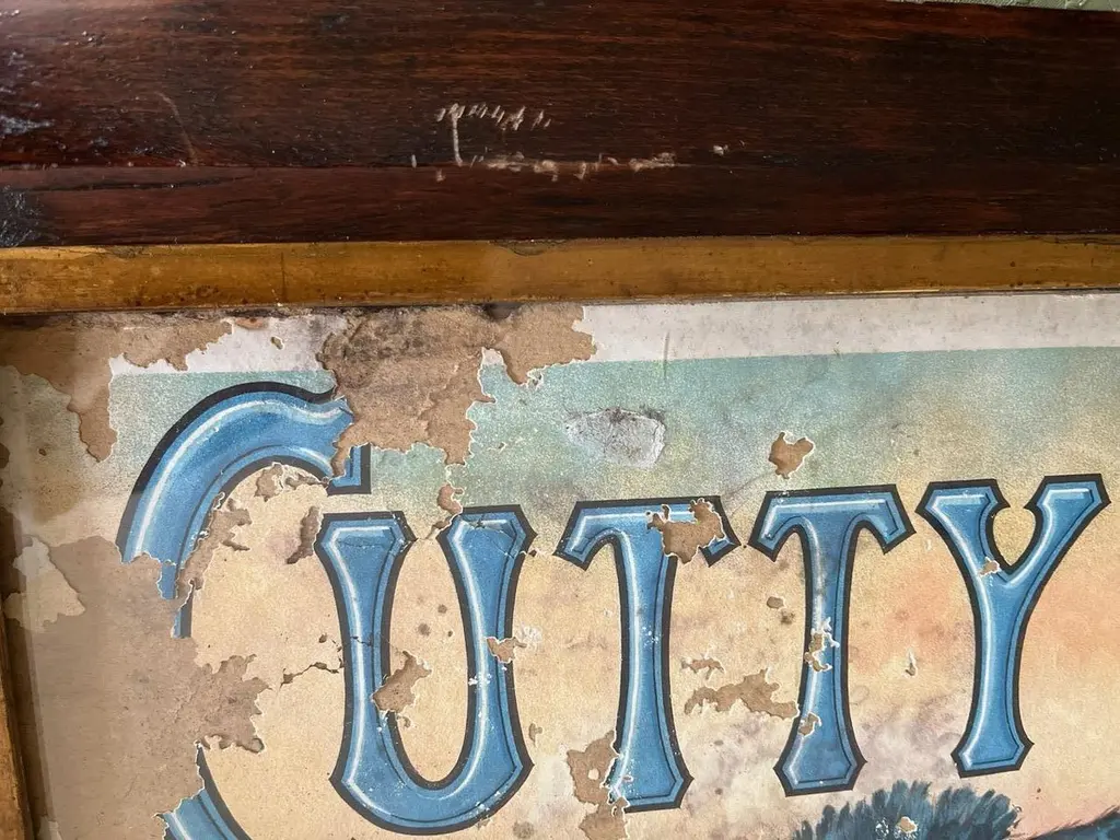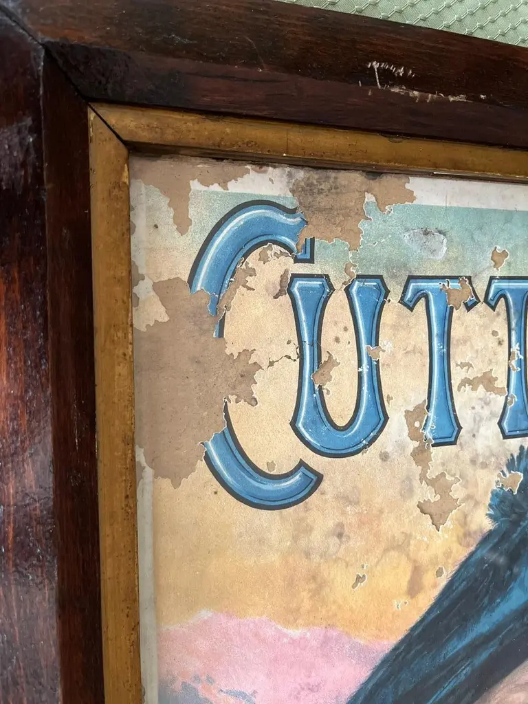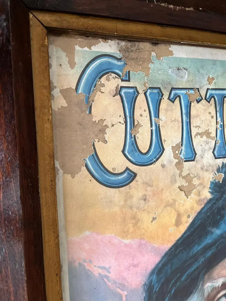 Rare 1930s Weyman’s Cutty Pipe Tobacco Advertising Lithograph – Scottish Highlands Scene, Bold Color, Distressed ConditionThis rare 1930s advertising lithograph for Weyman’s Cutty Pipe Tobacco is a striking visual tribute to Scottish heritage and early 20th-century commercial art. The print depicts a proud Scottish man in traditional Highland attire, complete with vibrant tartan plaid, smoking a pipe and holding a tin of Cutty’s Pipe Tobacco against the breathtaking backdrop of the Scottish Highlands.The most captivating element of this piece is its brilliant use of color—the lush greens of the landscape, the richly rendered skin tones, and the crisp detail in the plaid all contribute to a bold, eye-catching composition that exemplifies the vibrant style of 1930s lithographic advertising. This piece would have originally served as a promotional print, likely displayed in tobacconists or general stores, evoking both a romantic image of Scotland and a sense of brand pride.Though visually stunning, this original advertising print is in distressed condition. It shows signs of its age with paper brittleness, corner losses, tears, water warping, holes, and general wear. The frame, likely original or early, also shows its age with separation at the corners, a replaced cardboard backing affixed with duct tape, and a small chip in the glass at the upper right. Despite this, the lithograph retains remarkable visual impact and could greatly benefit from professional restoration by a reputable paper conservator.This is a hard-to-find piece of tobacco memorabilia and a wonderful example of Scottish cultural representation in early 20th-century commercial art. Whether left in its current state for a rustic, timeworn aesthetic or restored to its original brilliance, this print is a rare treasure for collectors of vintage advertising, Scottish memorabilia, or tobacco ephemera.Origin: USA, c. 1930sCondition: Distressed – see details above; suitable for restoration.
