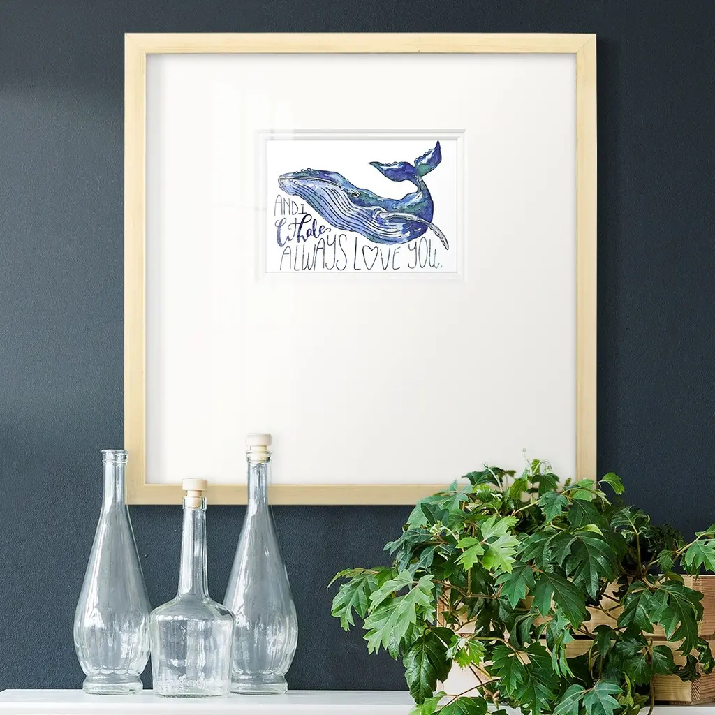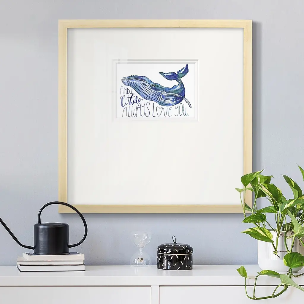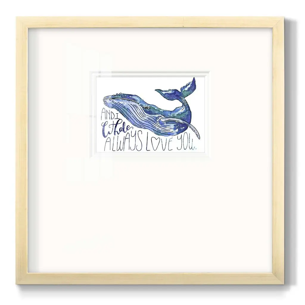 Whale Love IPremium Framed Print A framed cold pressed paper print featuring superior double matting and quality frame. 2 SIZES AVAILABLE 16''X16''' - Overall Size 20''X20''' - Overall Size Each piece is made to order. Each piece comes with hanging hardware. Made in the USA Ready to Hang Giclee Paper Print Plexiglass Beveled Matt Board Double Matte Board