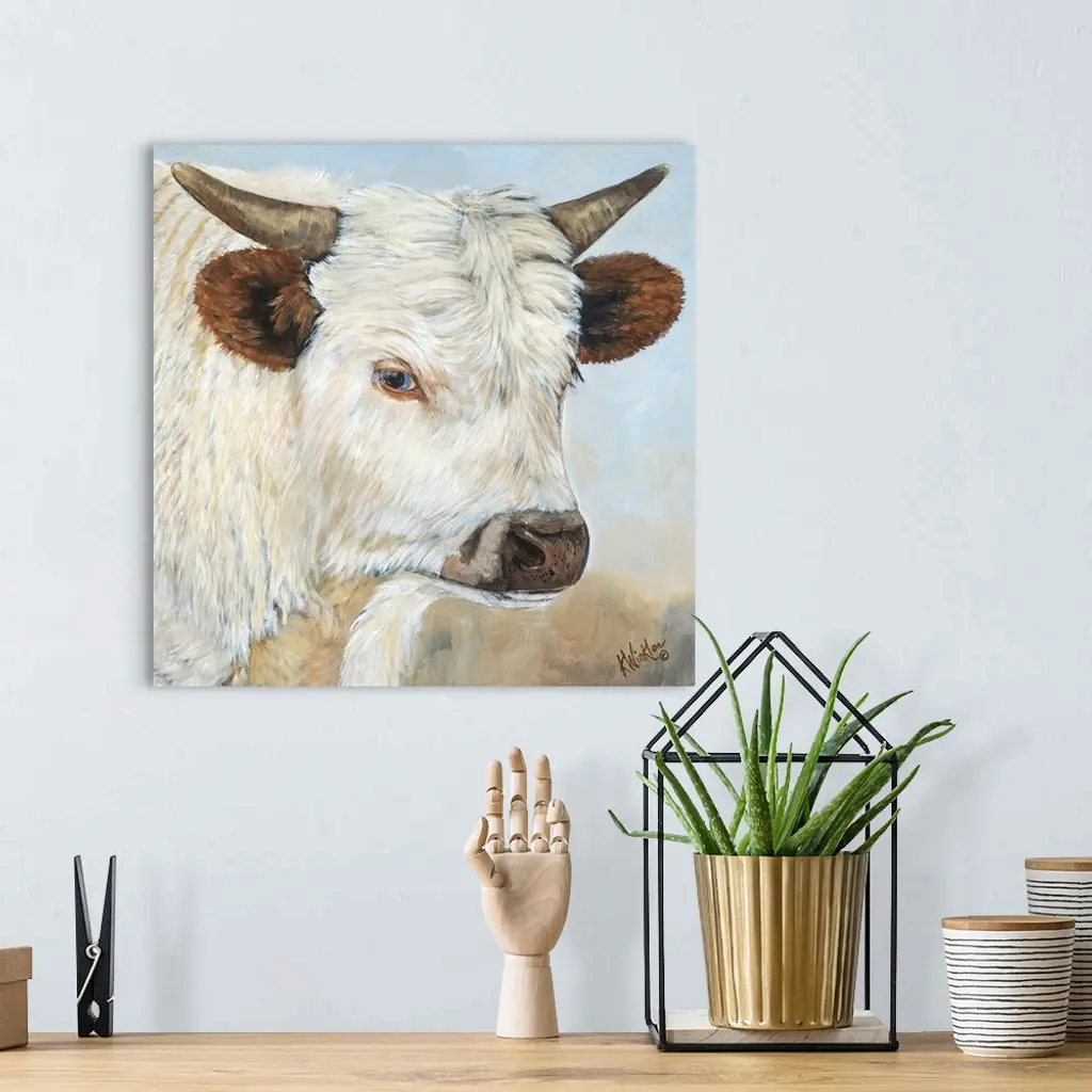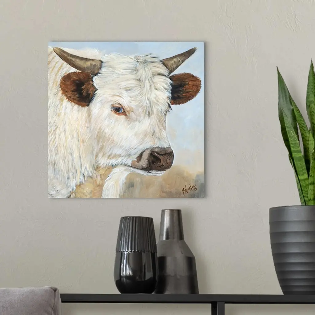 Contemporary painting of a portrait of a white cow with large ears and short horns.